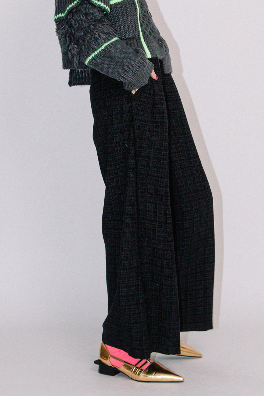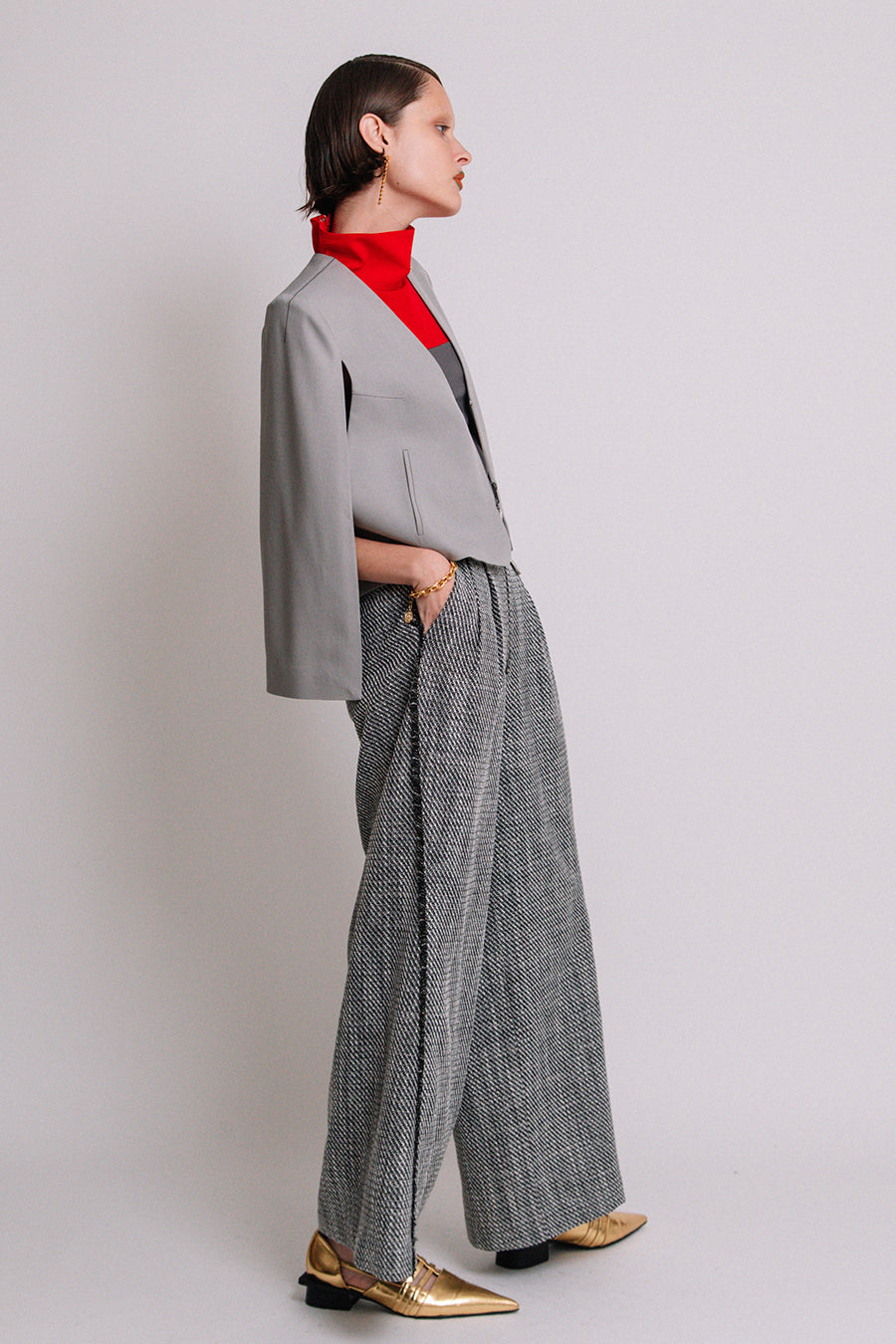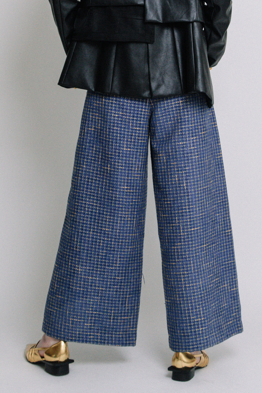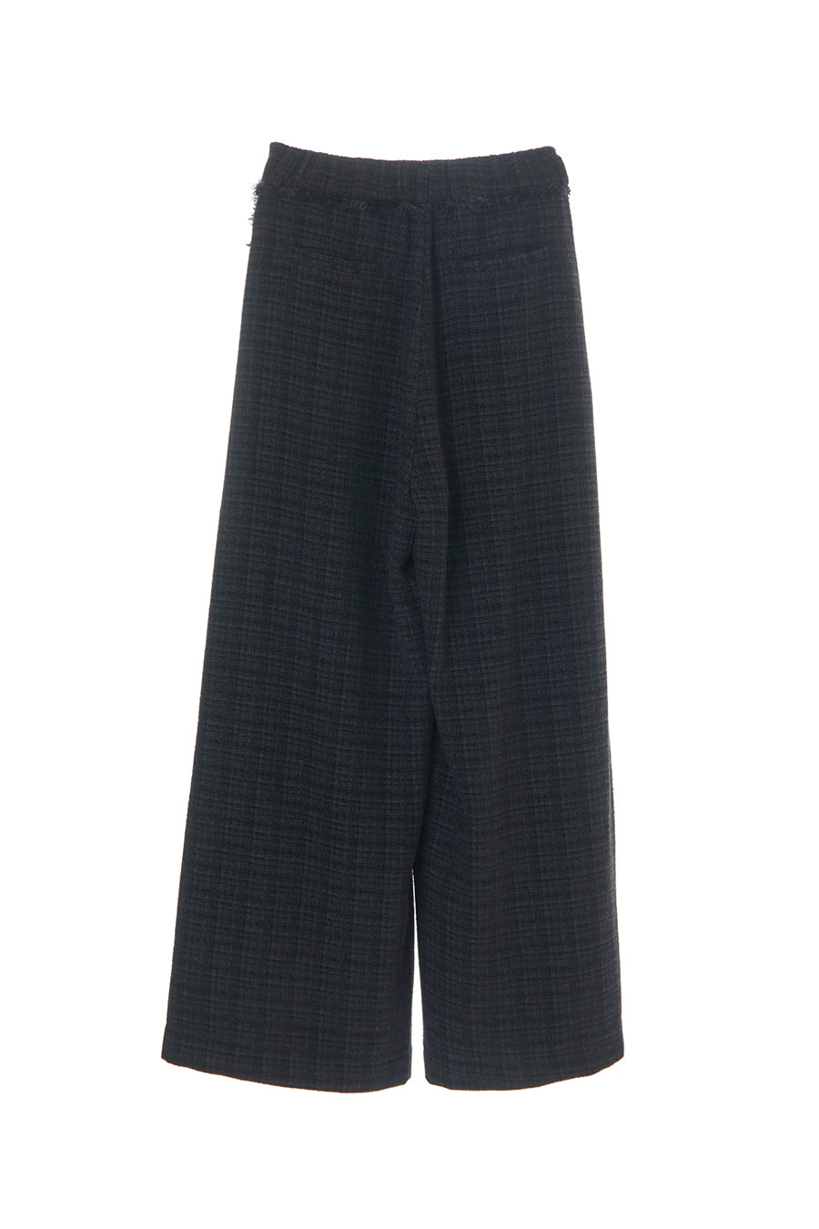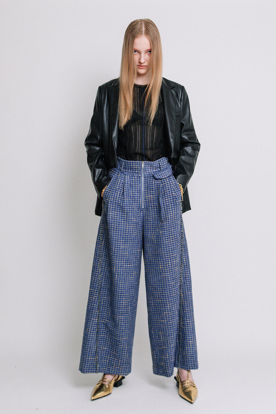 程よくハリのあるツイード 生地で、綺麗なワイドシルエットを構築したハイウエストパンツは、美脚効果を狙えるアイテム。