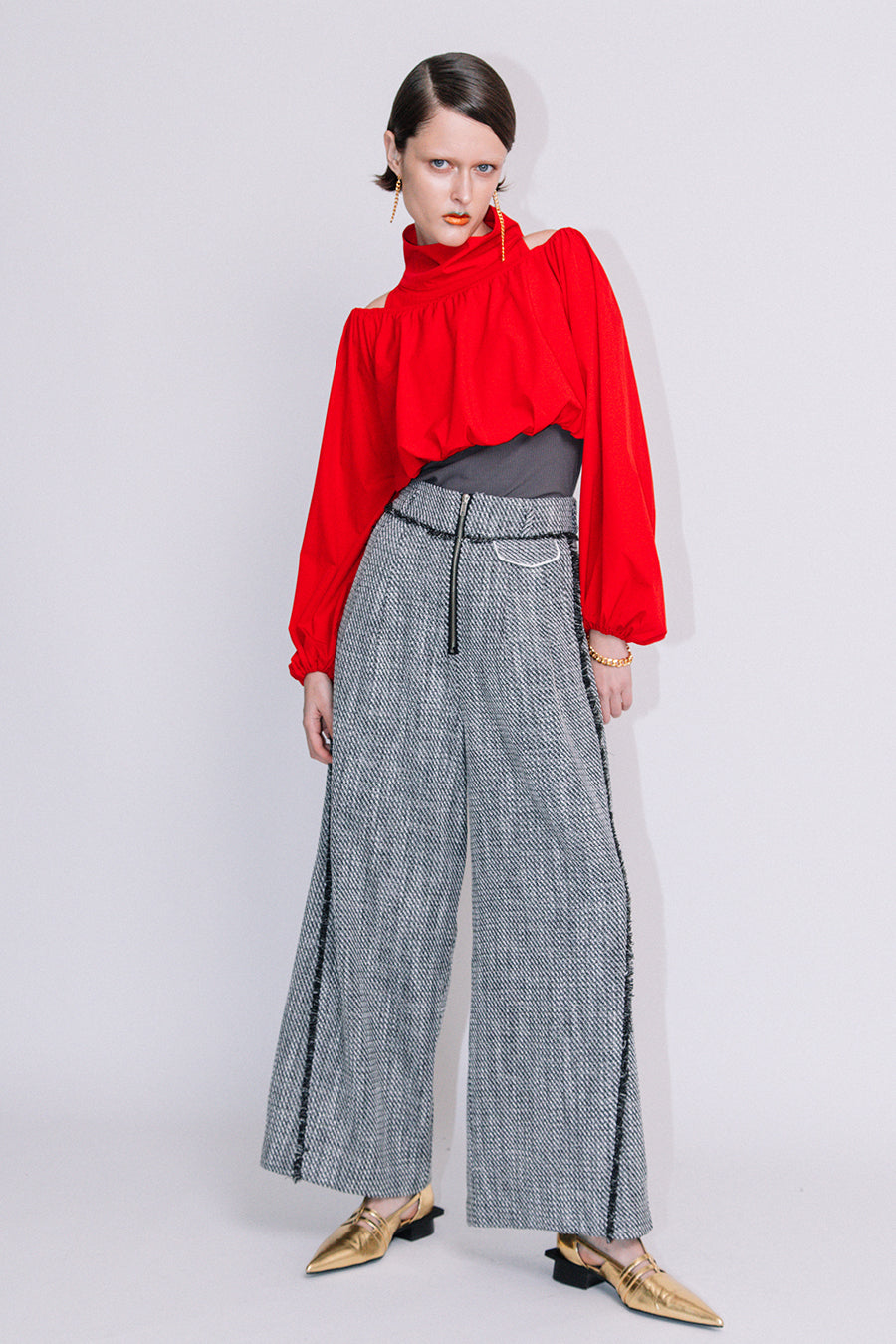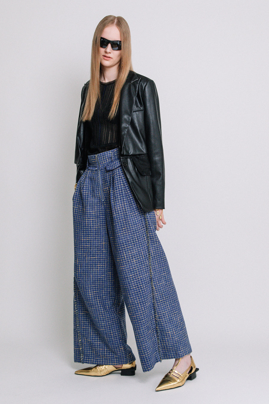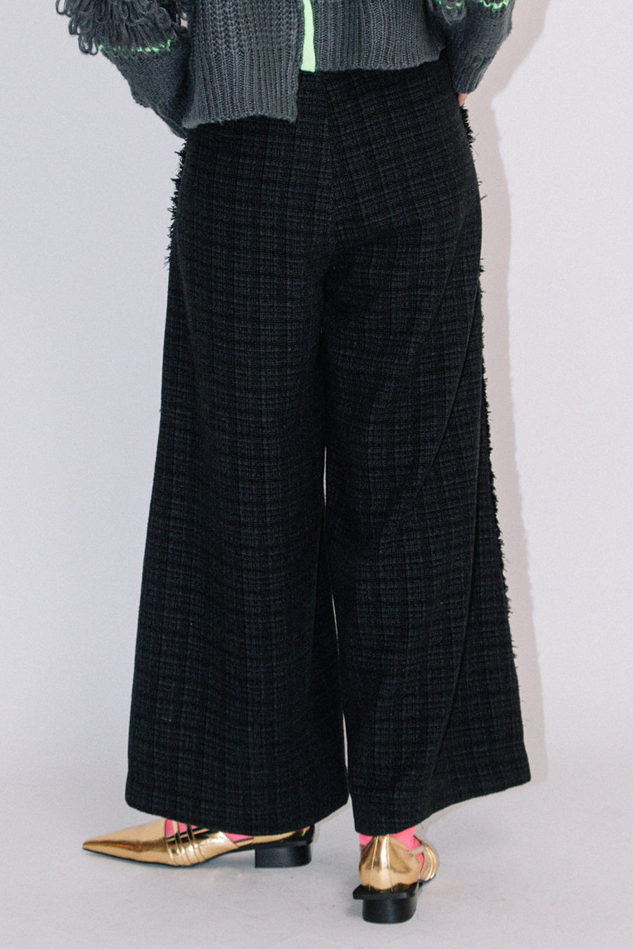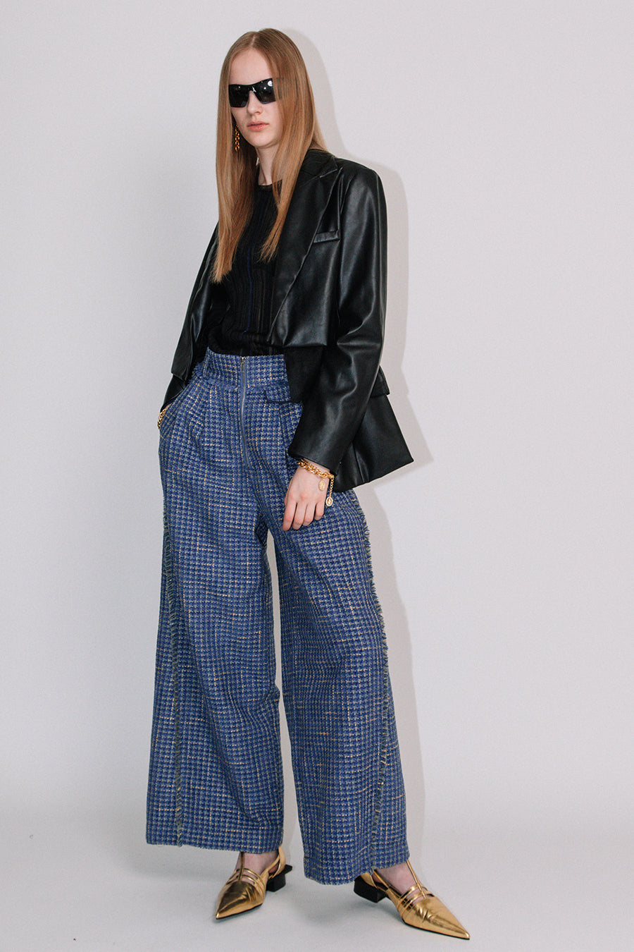 程よくハリのあるツイード 生地で、綺麗なワイドシルエットを構築したハイウエストパンツは、美脚効果を狙えるアイテム。