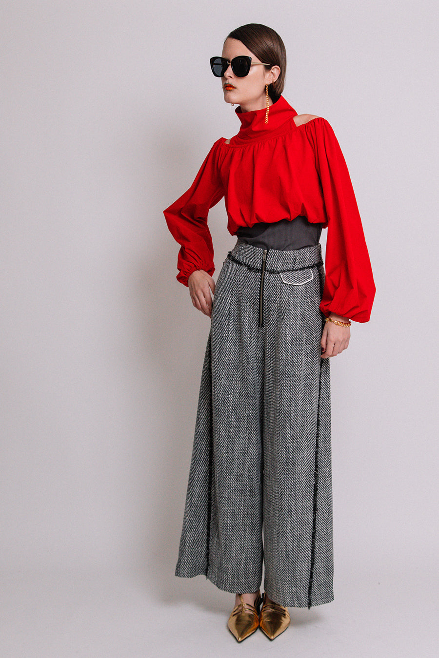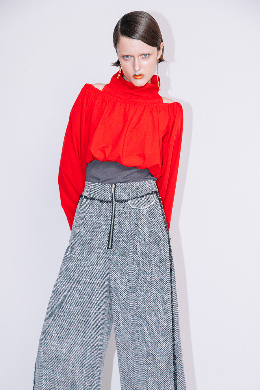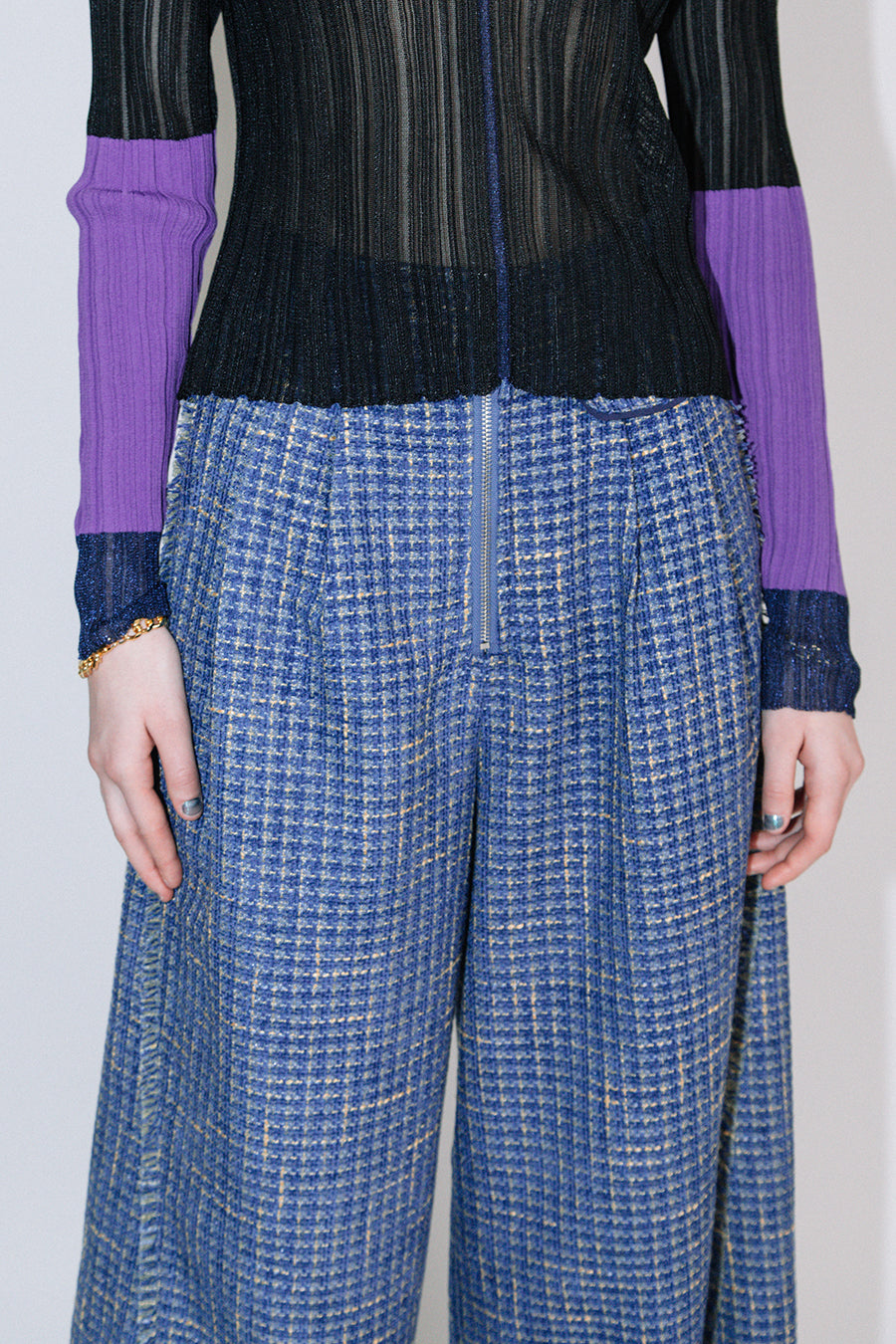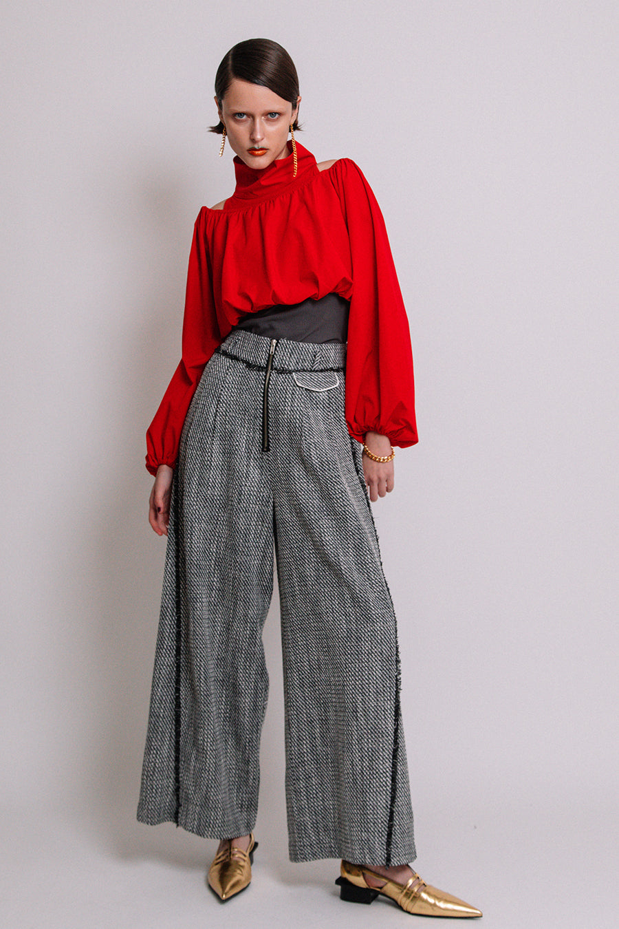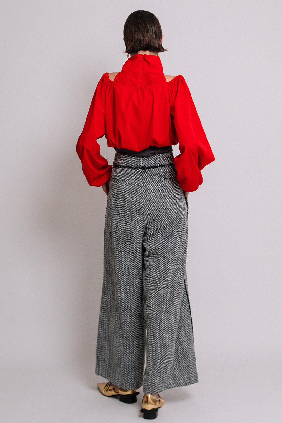 程よくハリのあるツイード 生地で、綺麗なワイドシルエットを構築したハイウエストパンツは、美脚効果を狙えるアイテム。