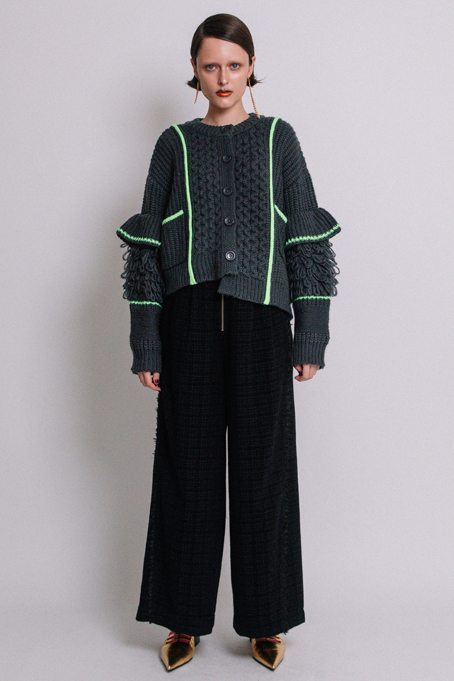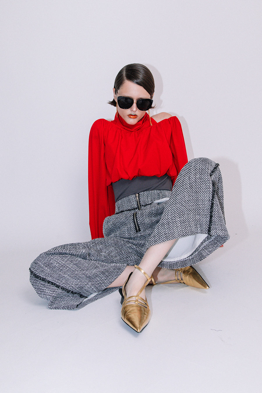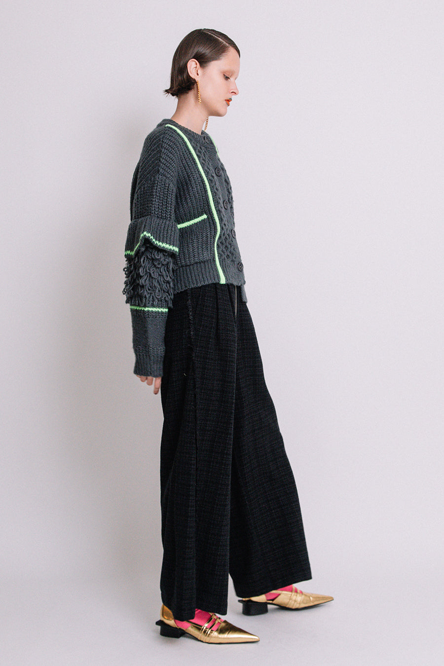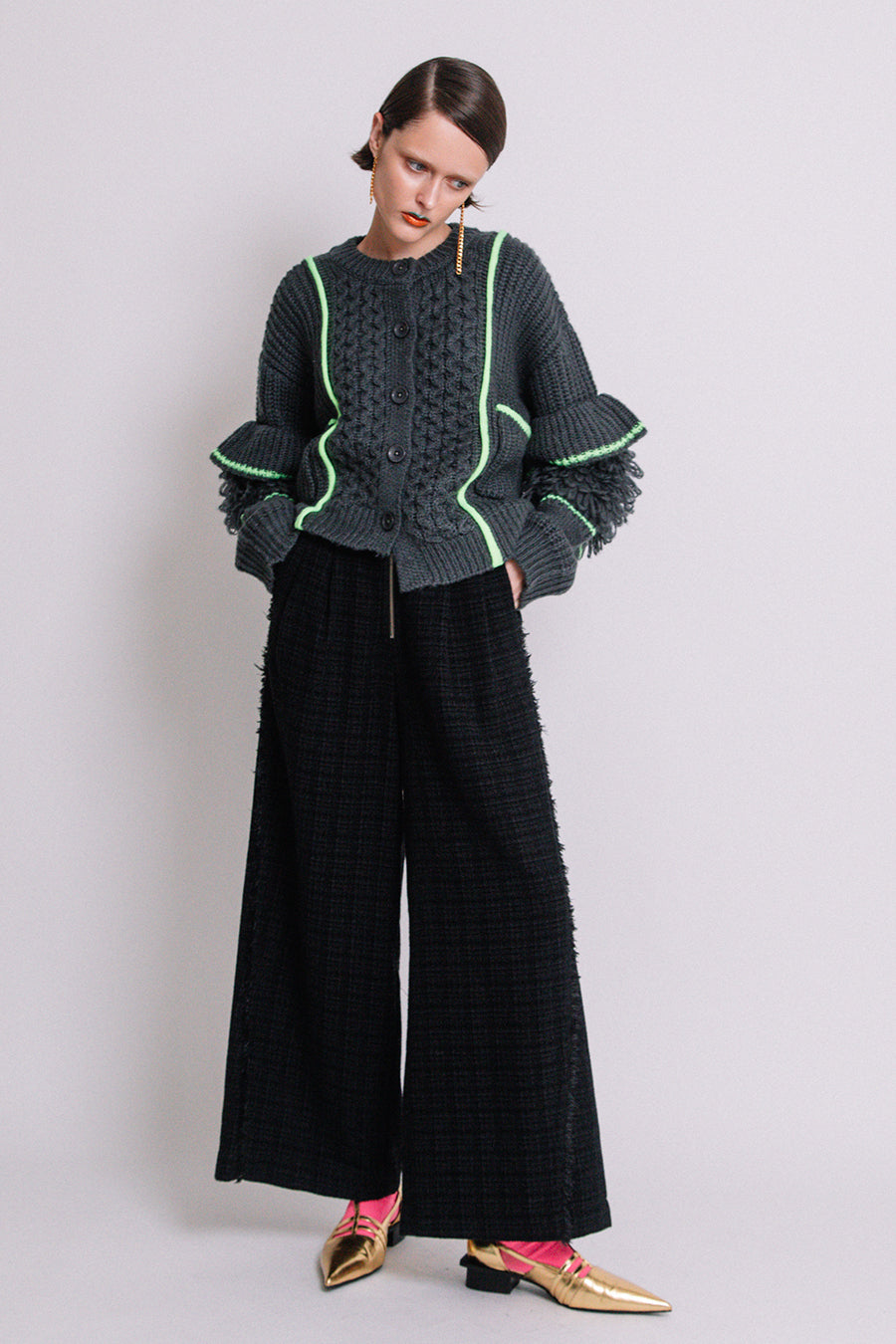程よくハリのあるツイード 生地で、綺麗なワイドシルエットを構築したハイウエストパンツは、美脚効果を狙えるアイテム。
