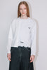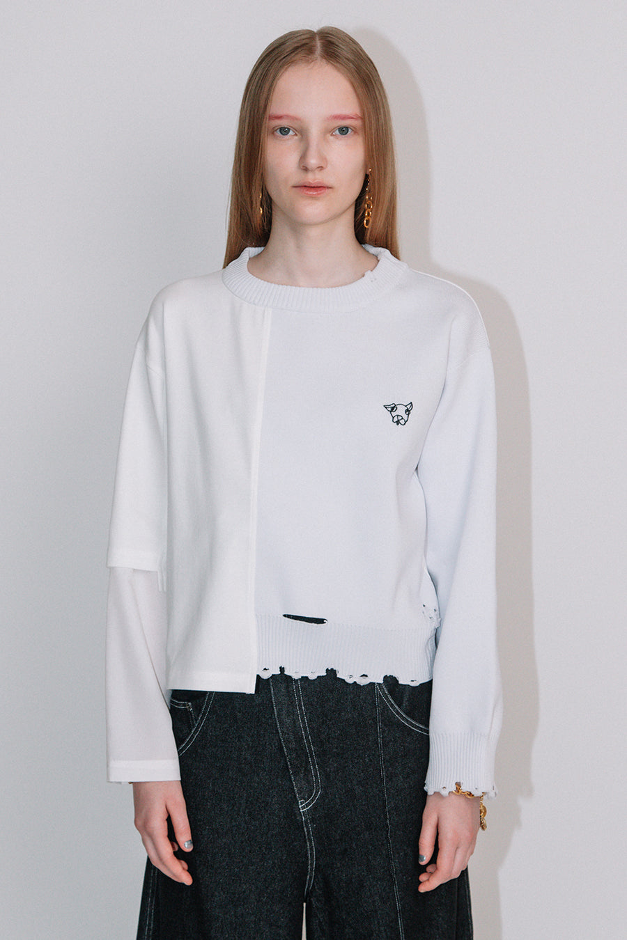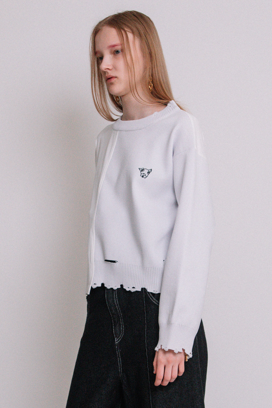 前左身頃と左袖がポリエステル糸のゴム編みニットで、襟ぐり、袖口、裾リブにダメージ加工を施したデザイン。