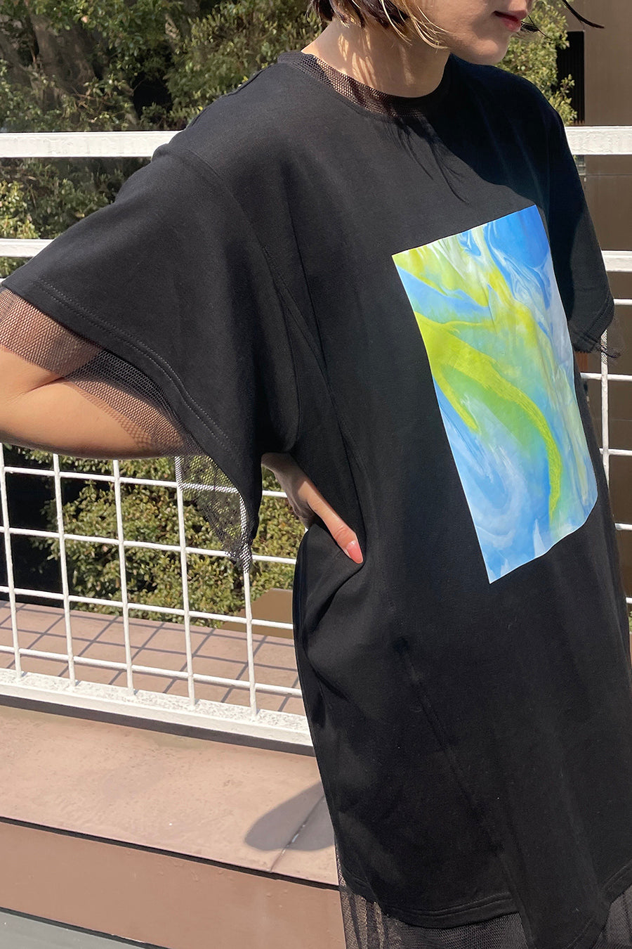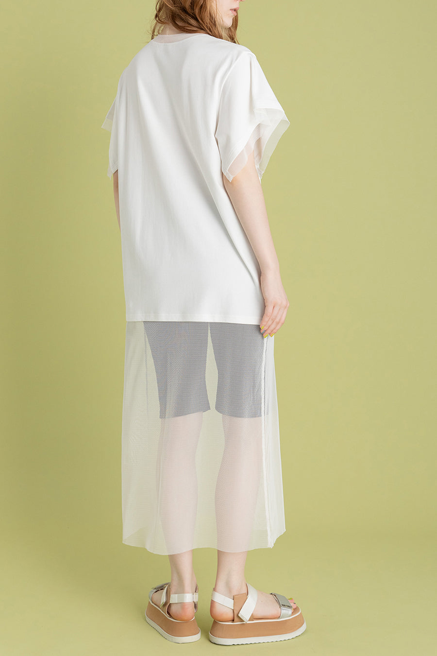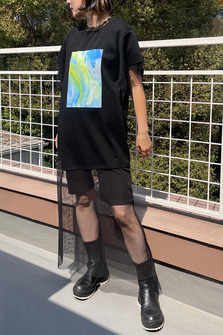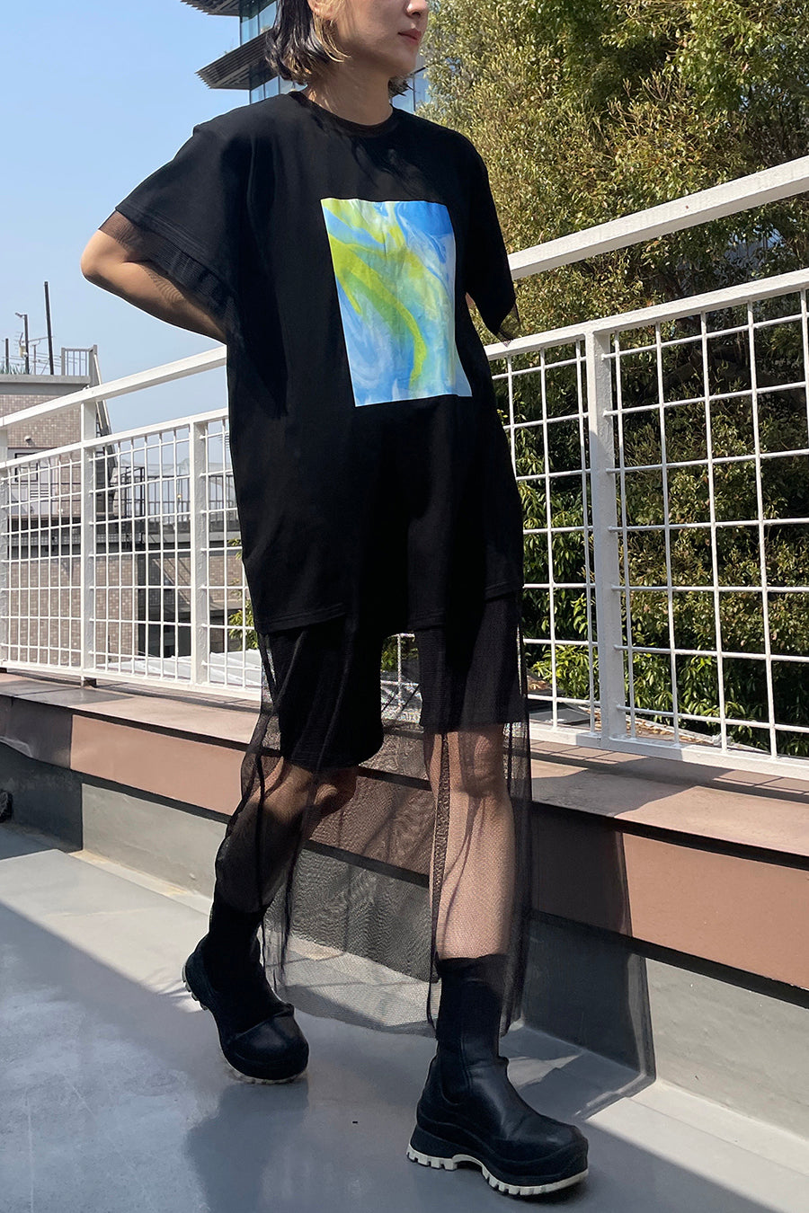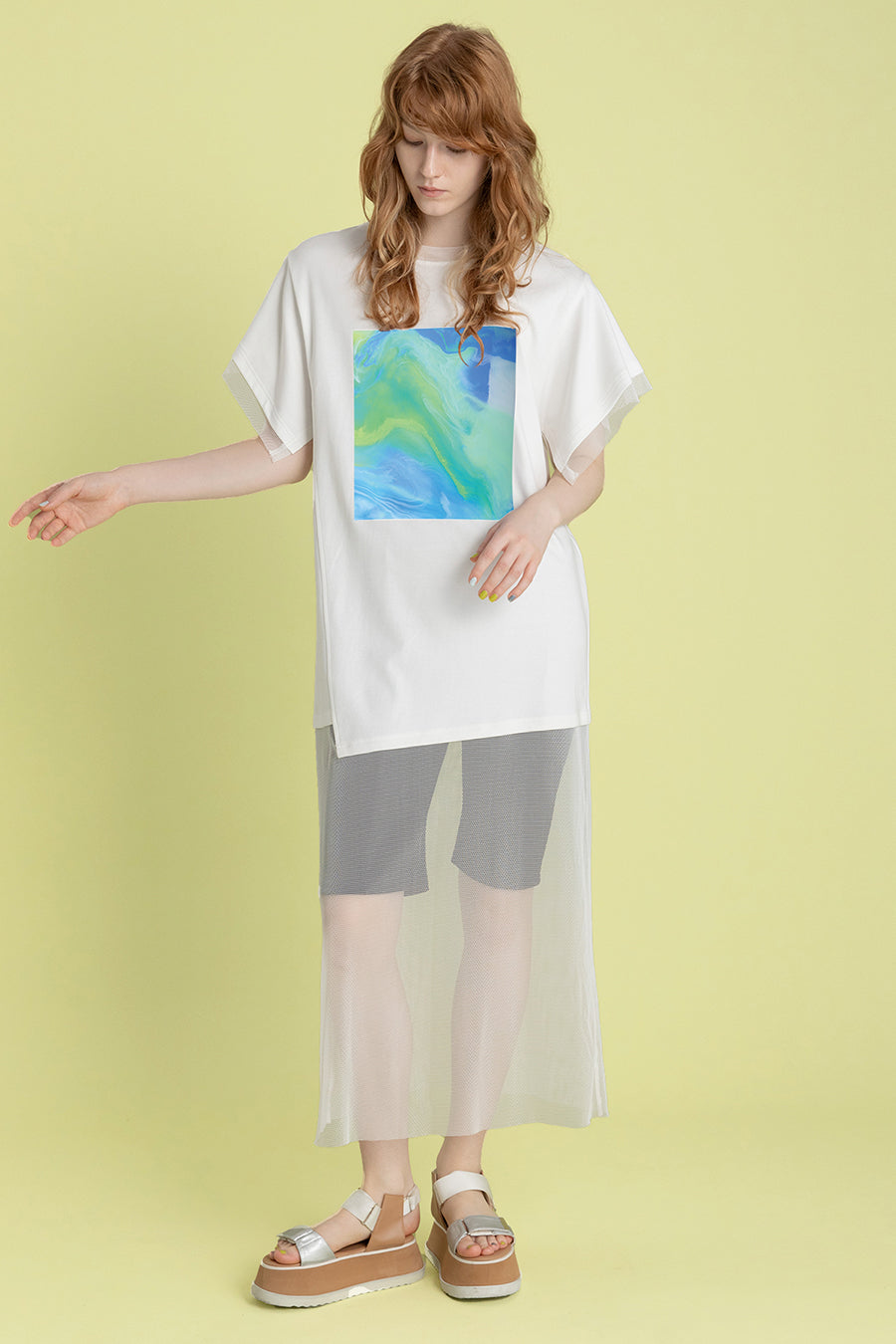 毎シーズン好評なプリントアイテム。今シーズンはマーブリングプリントのTシャツに、シアー素材のメッシュやレースをジョイント。肌触りが良く、伸縮性もあるシワになりにくいトレッチコットンスムースを使用。オーバーサイズのアシンメトリーに切り替えたTシャツの袖は5分袖丈で、袖下はスリット開き、袖口からは、メッシュかレースのシアー素材が覗く、涼しげなアイテム。スカート部分は透けるので、ボトムに、スカートやレギンス、パンツを履いてレイヤードコーデするのもトレンド感がありおすすめ。