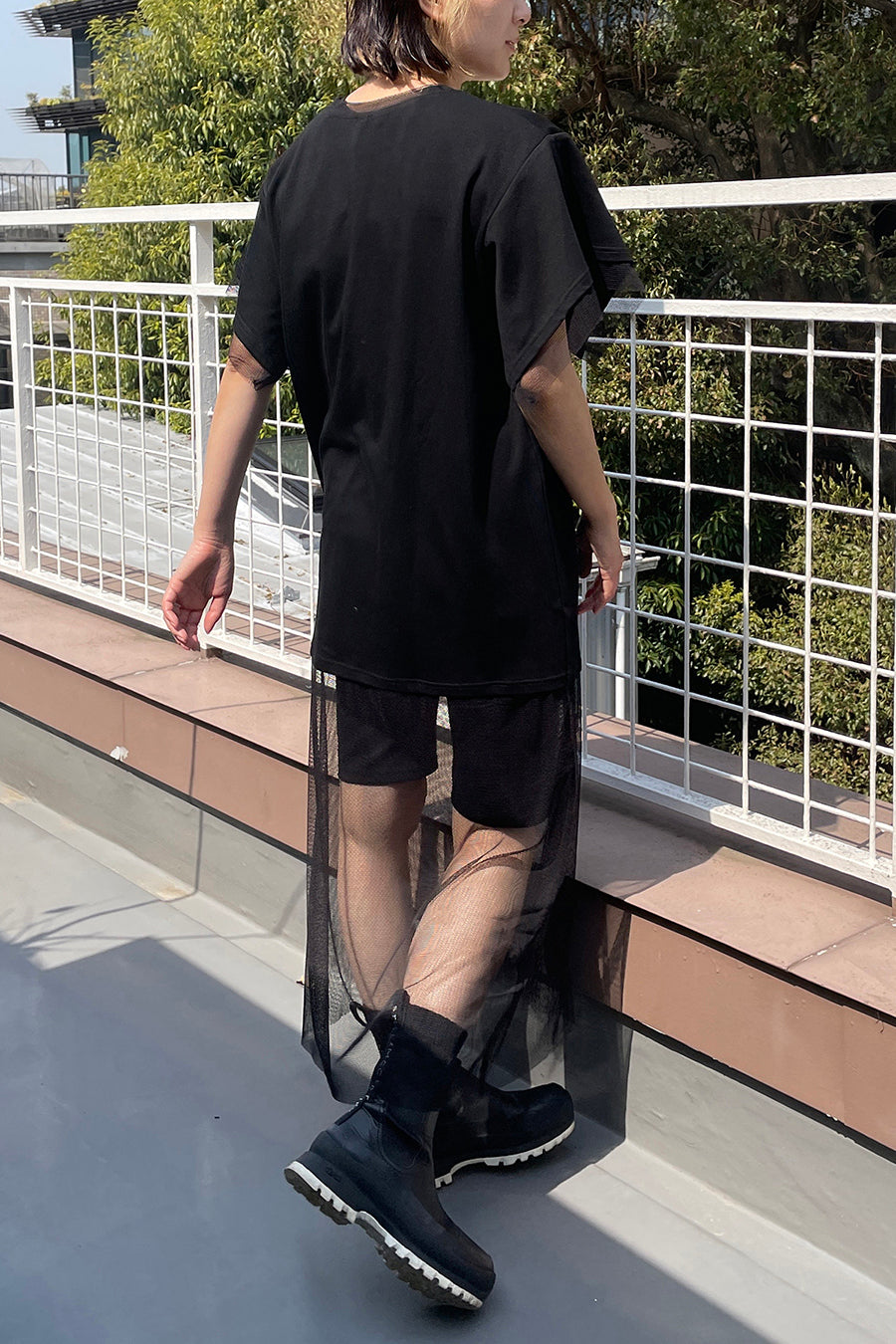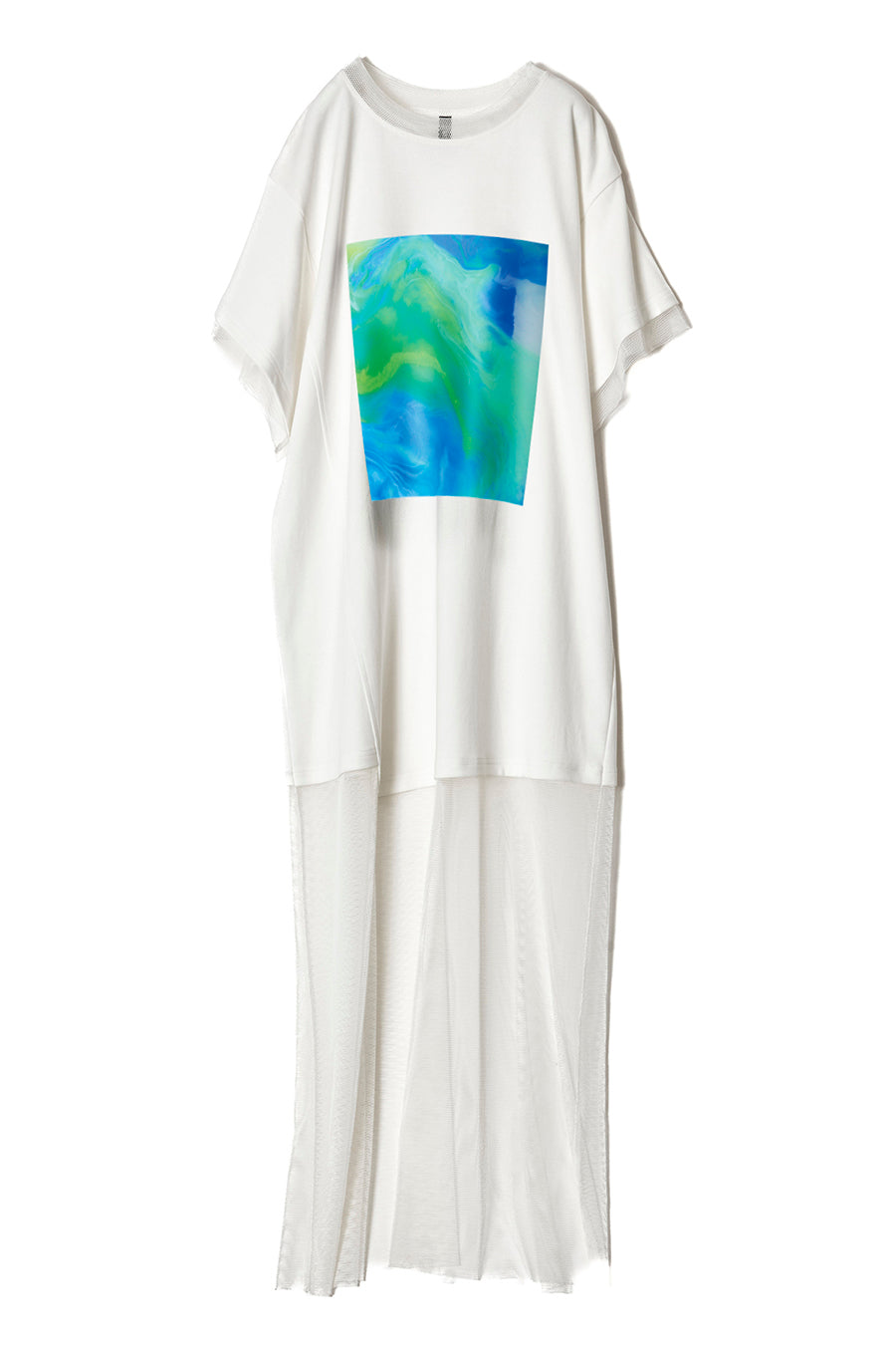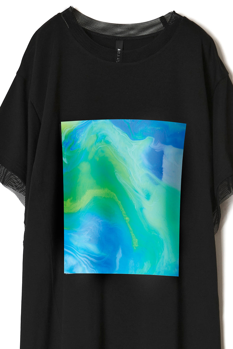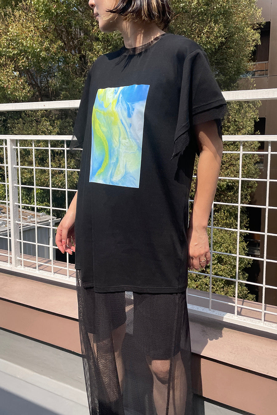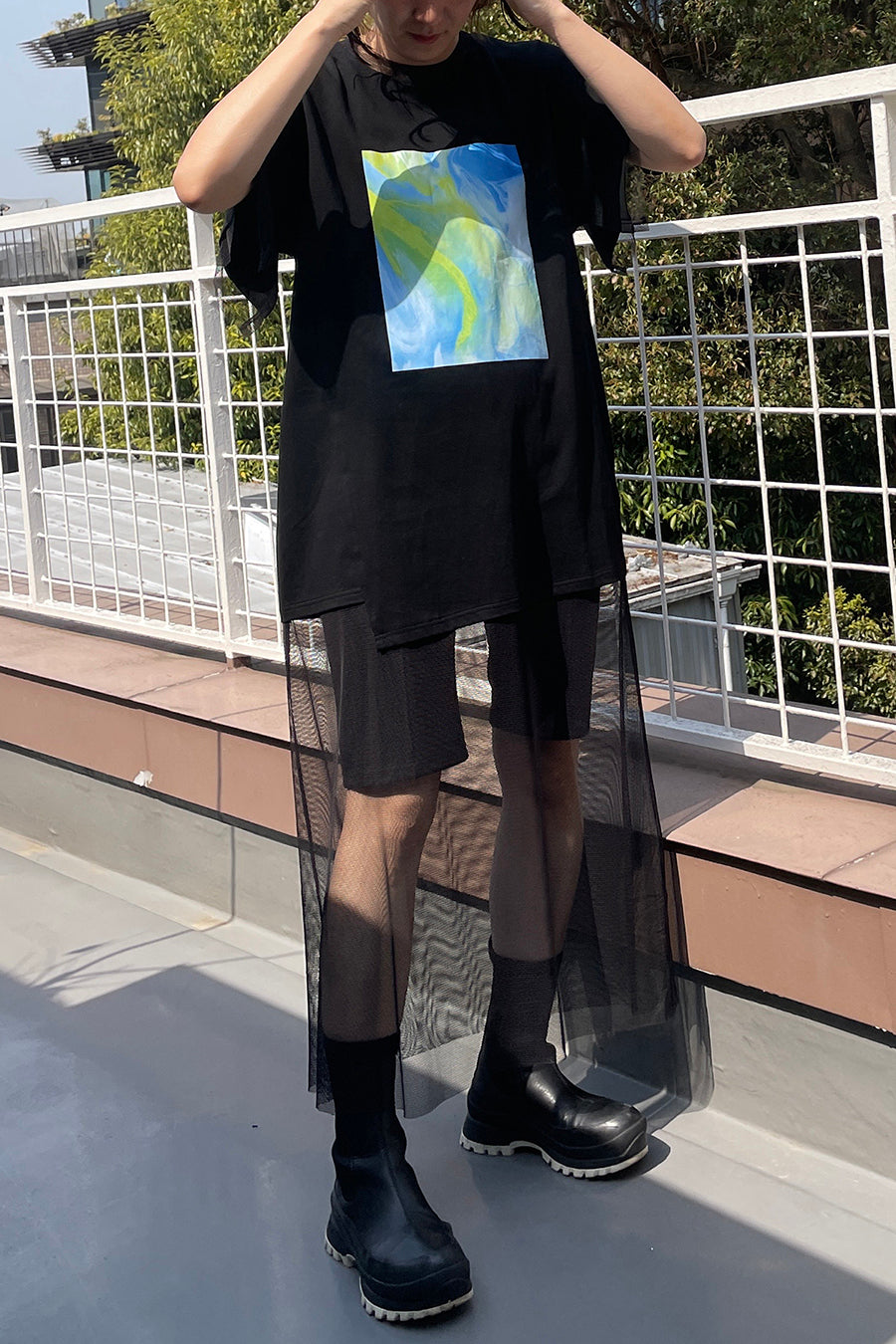 毎シーズン好評なプリントアイテム。今シーズンはマーブリングプリントのTシャツに、シアー素材のメッシュやレースをジョイント。肌触りが良く、伸縮性もあるシワになりにくいトレッチコットンスムースを使用。オーバーサイズのアシンメトリーに切り替えたTシャツの袖は5分袖丈で、袖下はスリット開き、袖口からは、メッシュかレースのシアー素材が覗く、涼しげなアイテム。スカート部分は透けるので、ボトムに、スカートやレギンス、パンツを履いてレイヤードコーデするのもトレンド感がありおすすめ。