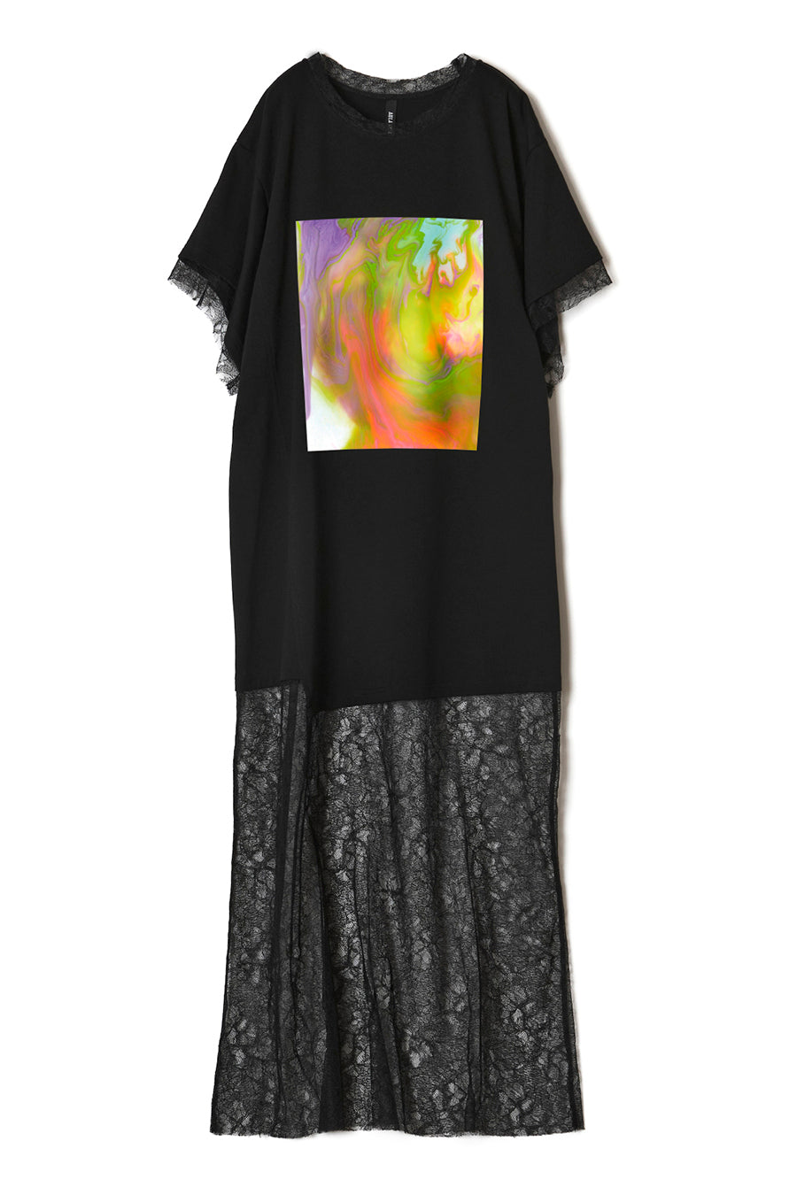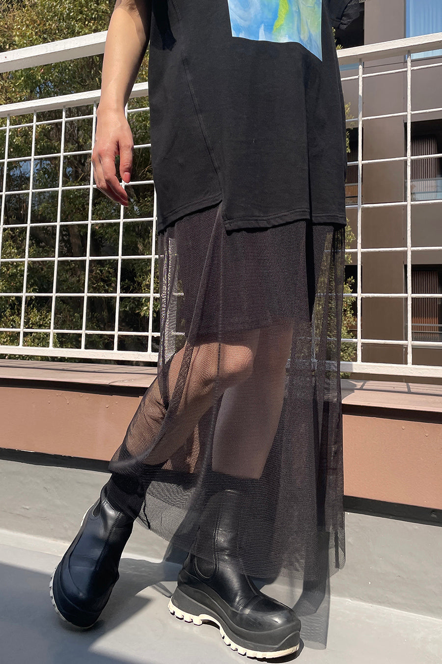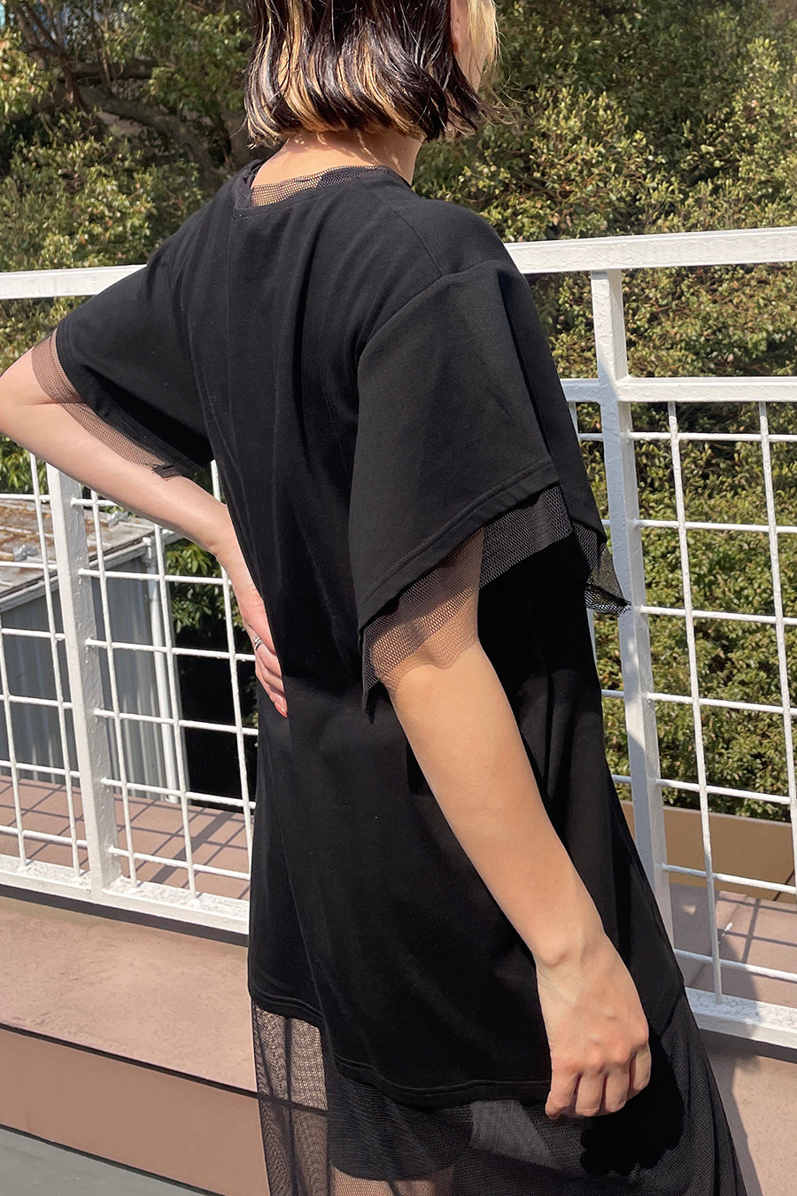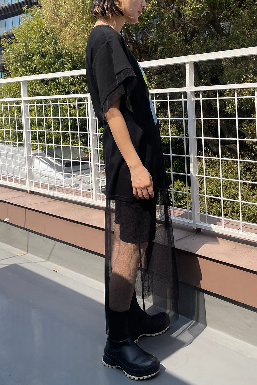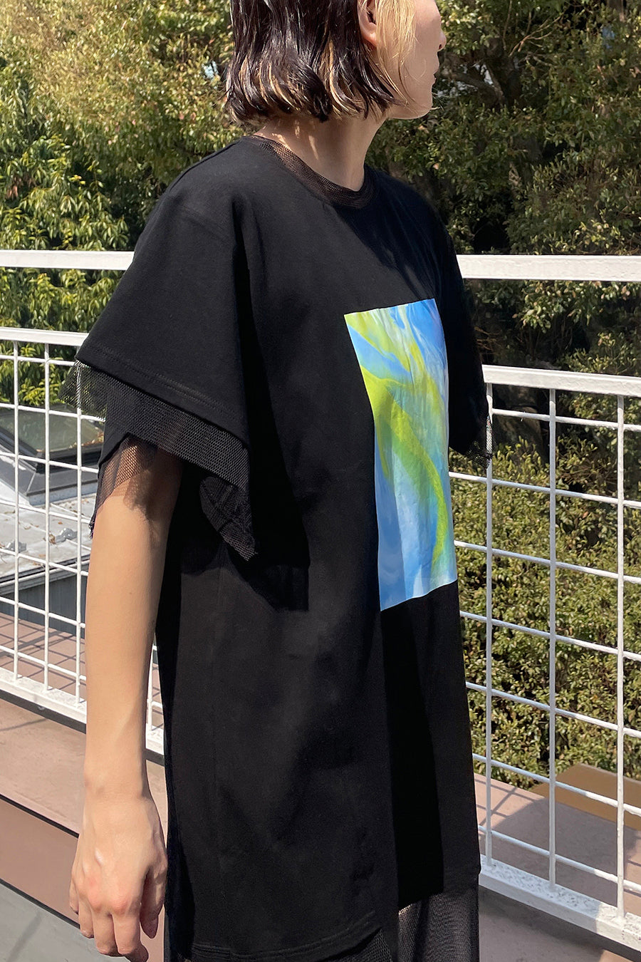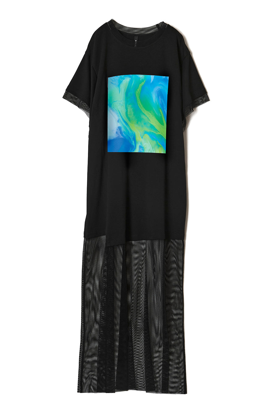毎シーズン好評なプリントアイテム。今シーズンはマーブリングプリントのTシャツに、シアー素材のメッシュやレースをジョイント。肌触りが良く、伸縮性もあるシワになりにくいトレッチコットンスムースを使用。オーバーサイズのアシンメトリーに切り替えたTシャツの袖は5分袖丈で、袖下はスリット開き、袖口からは、メッシュかレースのシアー素材が覗く、涼しげなアイテム。スカート部分は透けるので、ボトムに、スカートやレギンス、パンツを履いてレイヤードコーデするのもトレンド感がありおすすめ。