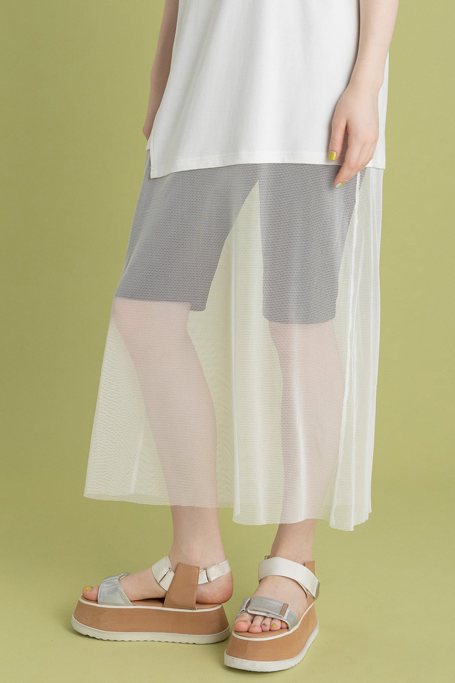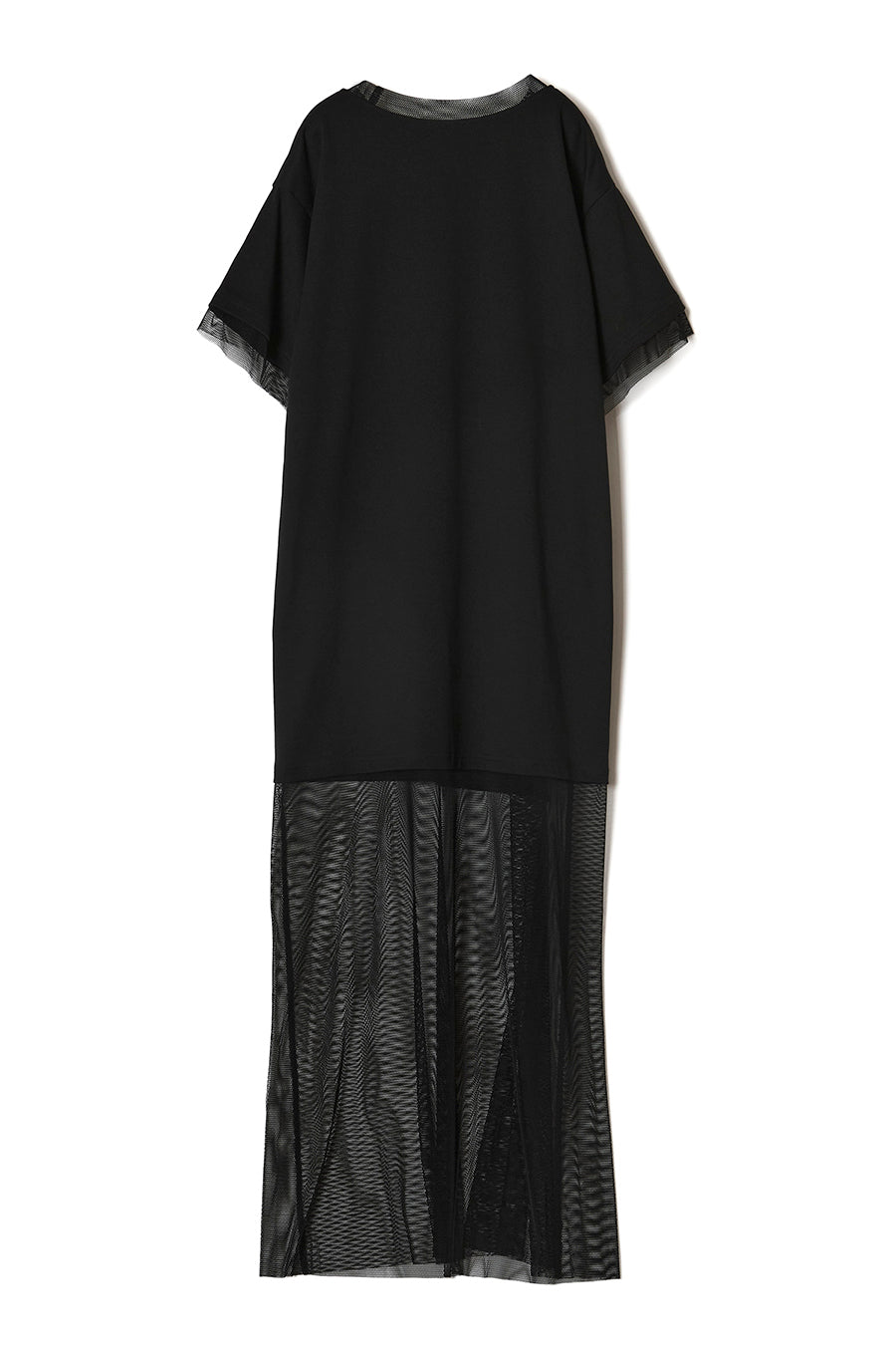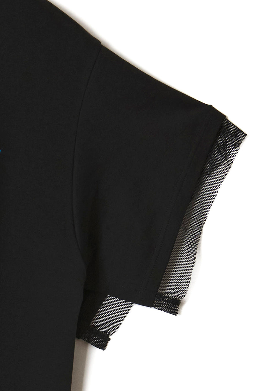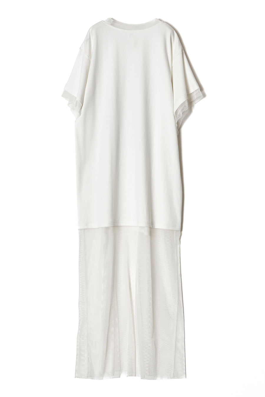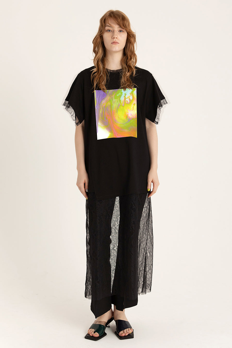 毎シーズン好評なプリントアイテム。今シーズンはマーブリングプリントのTシャツに、シアー素材のメッシュやレースをジョイント。肌触りが良く、伸縮性もあるシワになりにくいトレッチコットンスムースを使用。オーバーサイズのアシンメトリーに切り替えたTシャツの袖は5分袖丈で、袖下はスリット開き、袖口からは、メッシュかレースのシアー素材が覗く、涼しげなアイテム。スカート部分は透けるので、ボトムに、スカートやレギンス、パンツを履いてレイヤードコーデするのもトレンド感がありおすすめ。