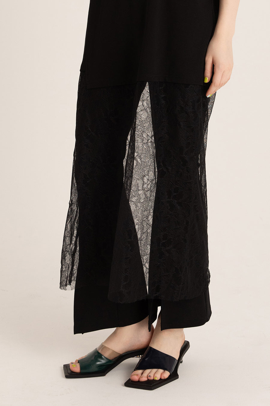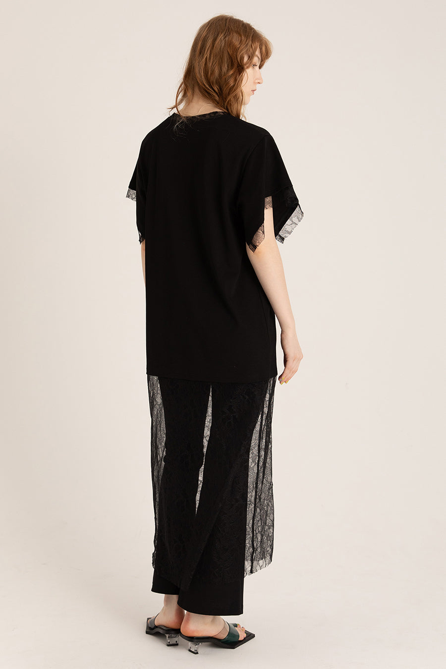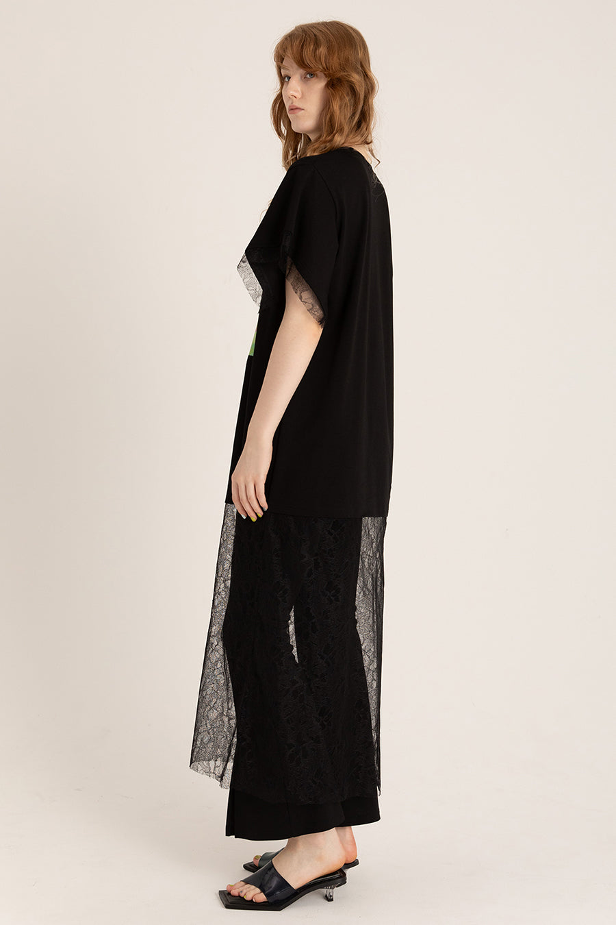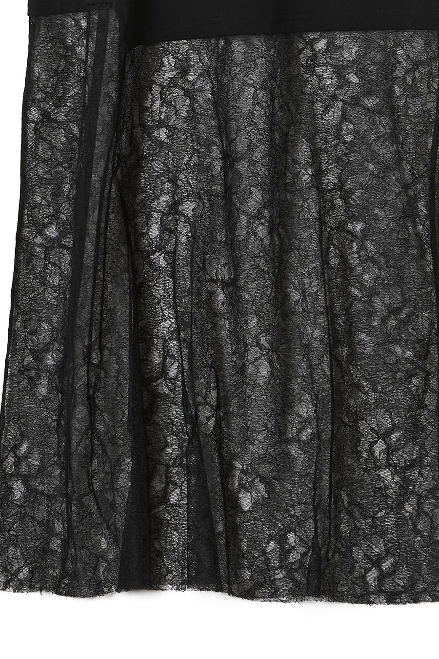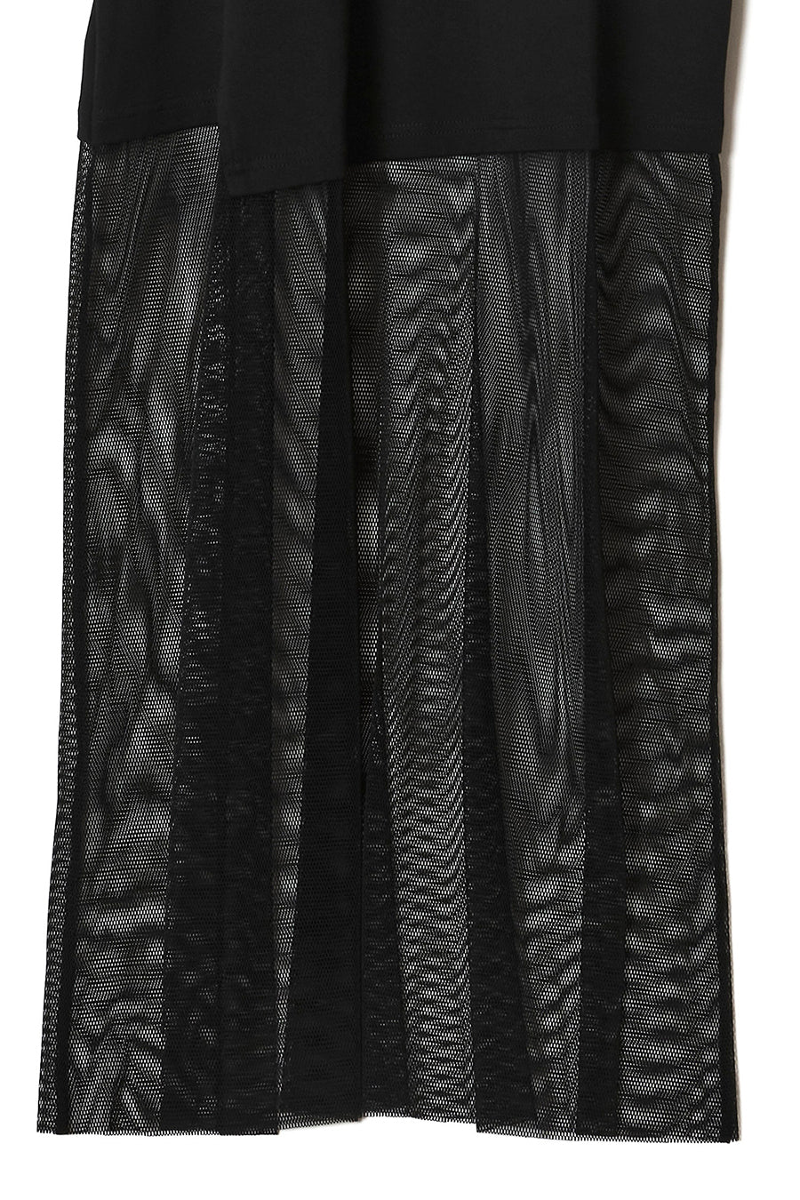 毎シーズン好評なプリントアイテム。今シーズンはマーブリングプリントのTシャツに、シアー素材のメッシュやレースをジョイント。肌触りが良く、伸縮性もあるシワになりにくいトレッチコットンスムースを使用。オーバーサイズのアシンメトリーに切り替えたTシャツの袖は5分袖丈で、袖下はスリット開き、袖口からは、メッシュかレースのシアー素材が覗く、涼しげなアイテム。スカート部分は透けるので、ボトムに、スカートやレギンス、パンツを履いてレイヤードコーデするのもトレンド感がありおすすめ。