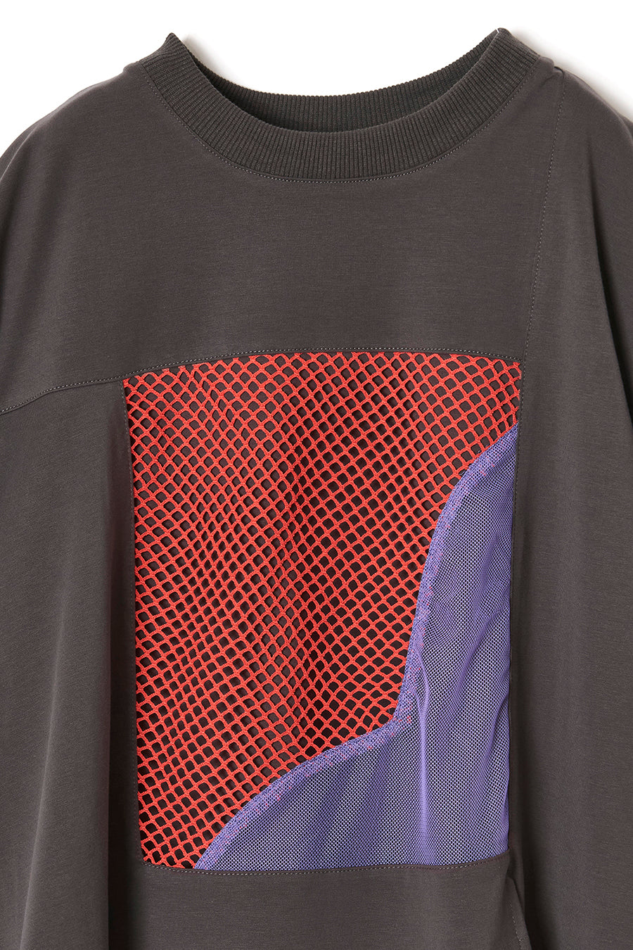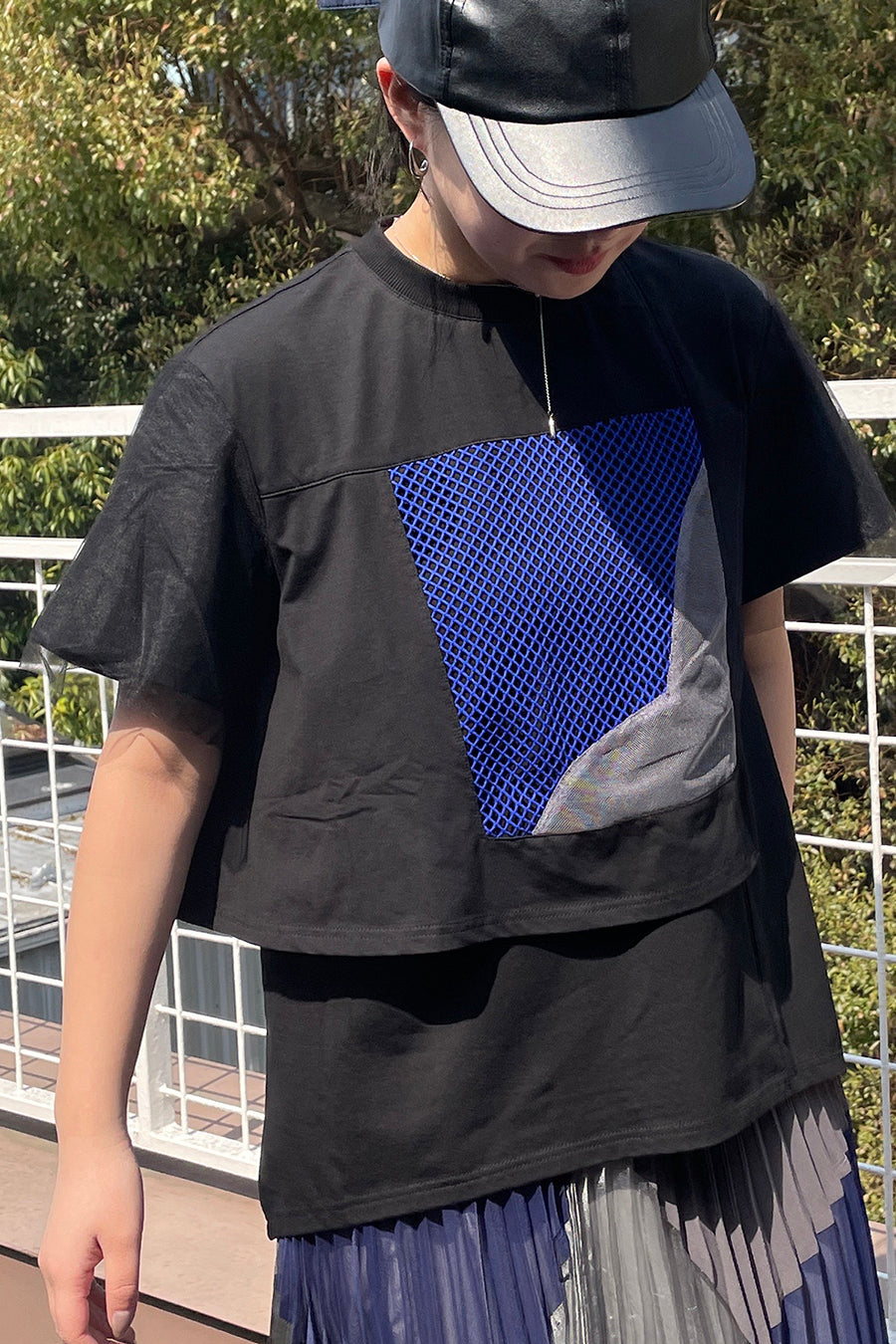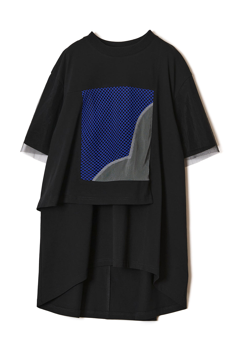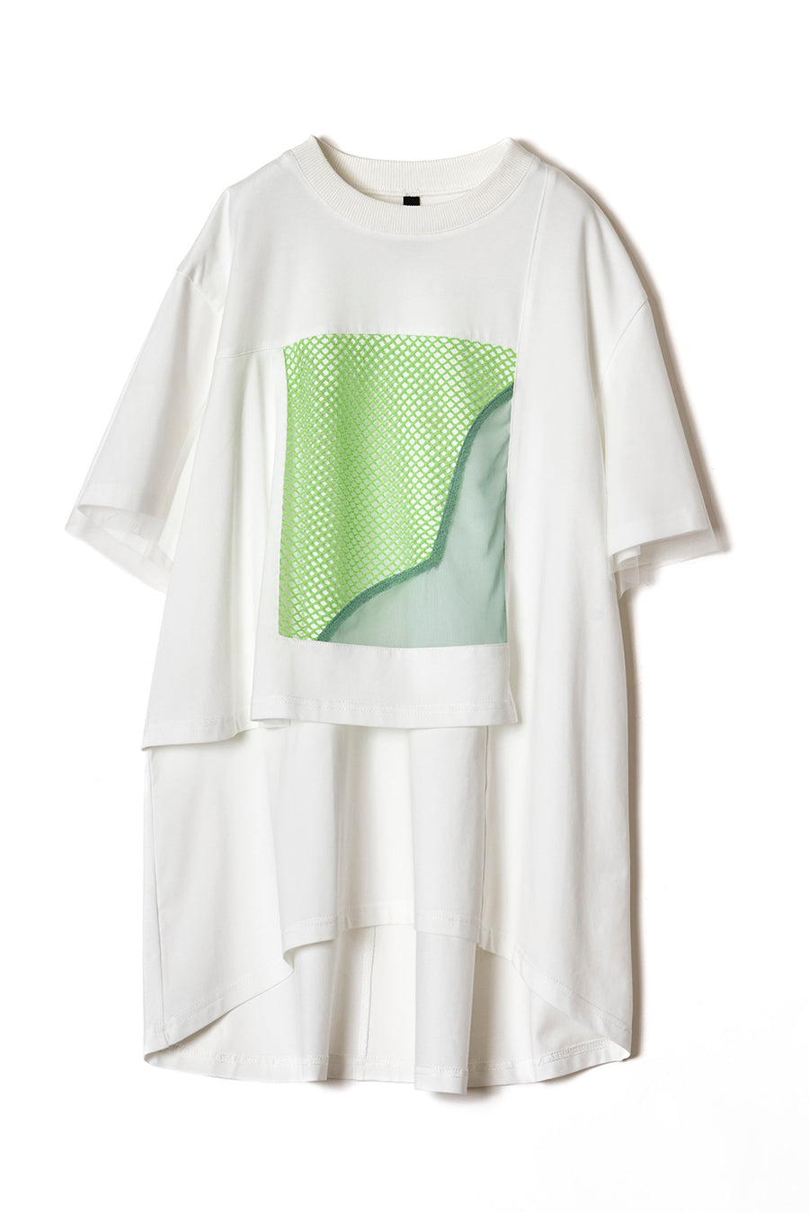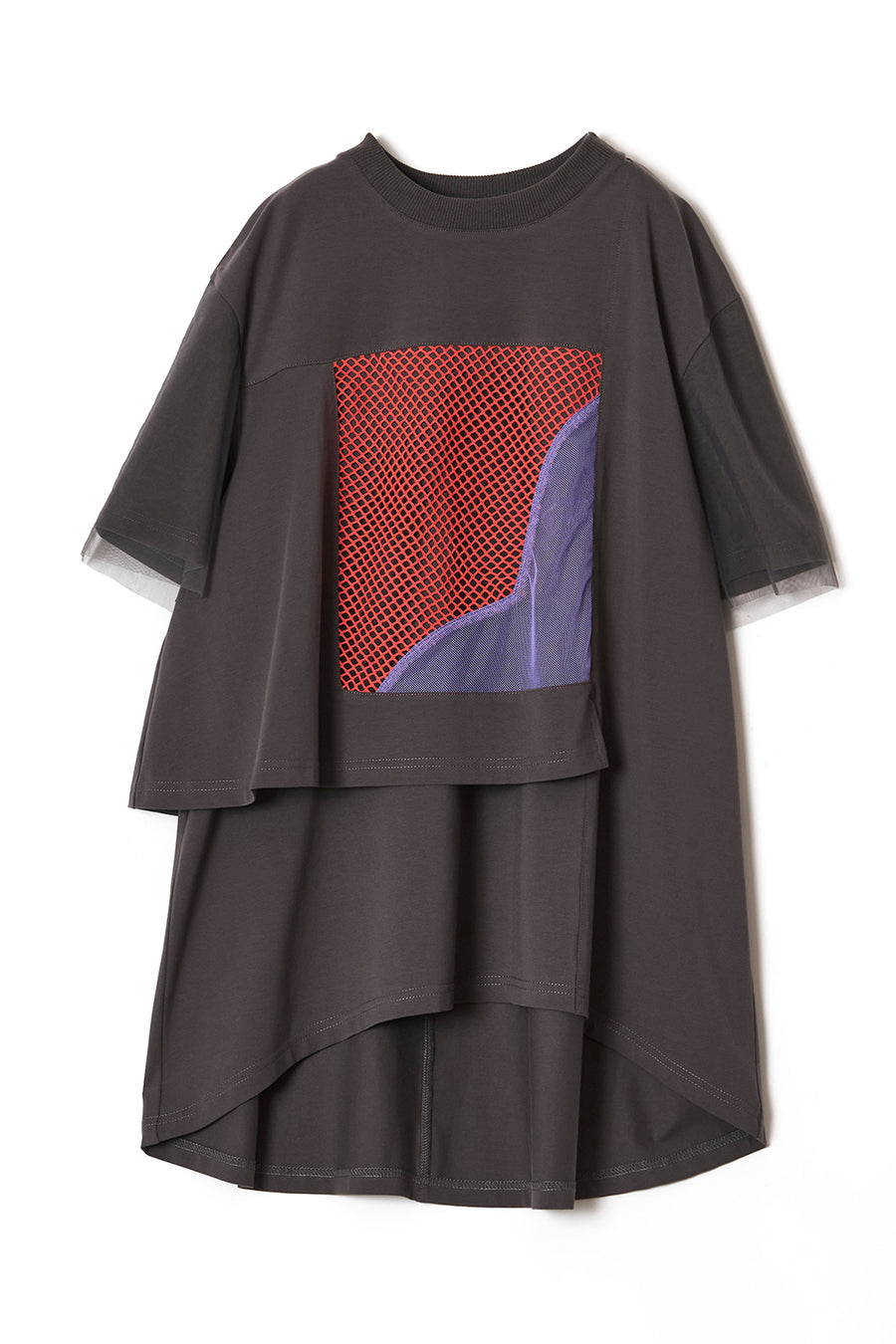 大メッシュと小メッシュを配色にして、アートのような切り替えをフロントに埋め込んだデザインTシャツ。カットソーは綺麗な目面の天竺で、真夏まで着用可能なドライタッチな生地感。右身頃はレイヤードデザインなので、フロントのアート風メッシュからインナーが透けること無く、立体的で動きのあるディティールに仕上がっており、裾はボトムにインすると、短丈Tシャツ風に見え、スタイリングの幅も広げてくれる。丈は前後差をつけ、後ろはヒップが隠れる程の丈感。袖はチュールを重ねてシアー感を取り入れたさりげないデザインポイント。バストやアームホールはゆとりのあるオーバーサイジングなので肌離れが良く、快適にご着用可能。