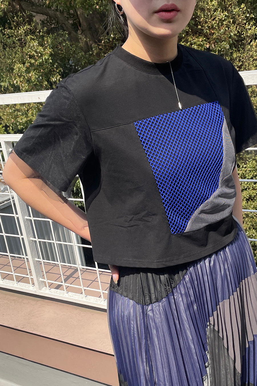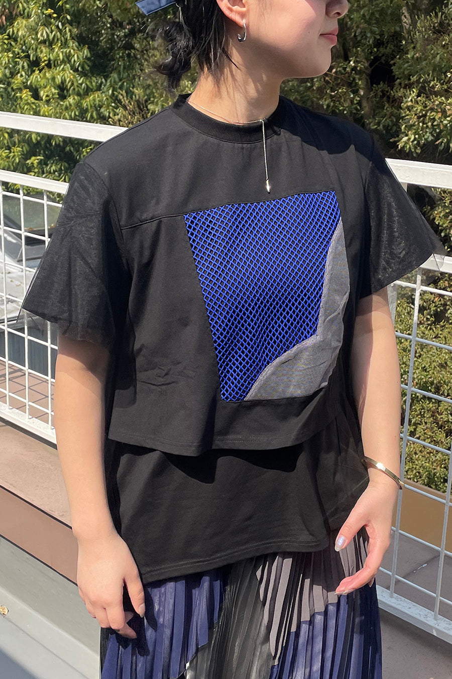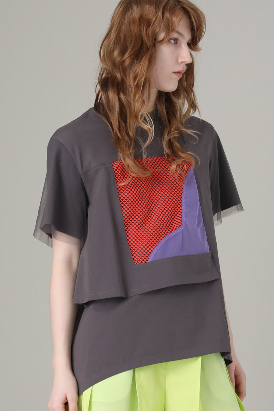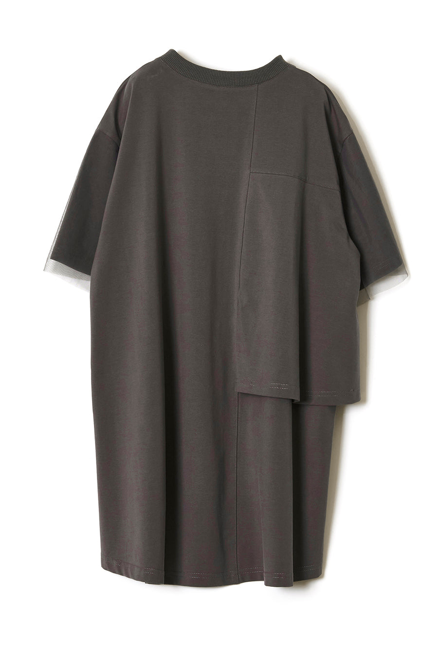 大メッシュと小メッシュを配色にして、アートのような切り替えをフロントに埋め込んだデザインTシャツ。カットソーは綺麗な目面の天竺で、真夏まで着用可能なドライタッチな生地感。右身頃はレイヤードデザインなので、フロントのアート風メッシュからインナーが透けること無く、立体的で動きのあるディティールに仕上がっており、裾はボトムにインすると、短丈Tシャツ風に見え、スタイリングの幅も広げてくれる。丈は前後差をつけ、後ろはヒップが隠れる程の丈感。袖はチュールを重ねてシアー感を取り入れたさりげないデザインポイント。バストやアームホールはゆとりのあるオーバーサイジングなので肌離れが良く、快適にご着用可能。