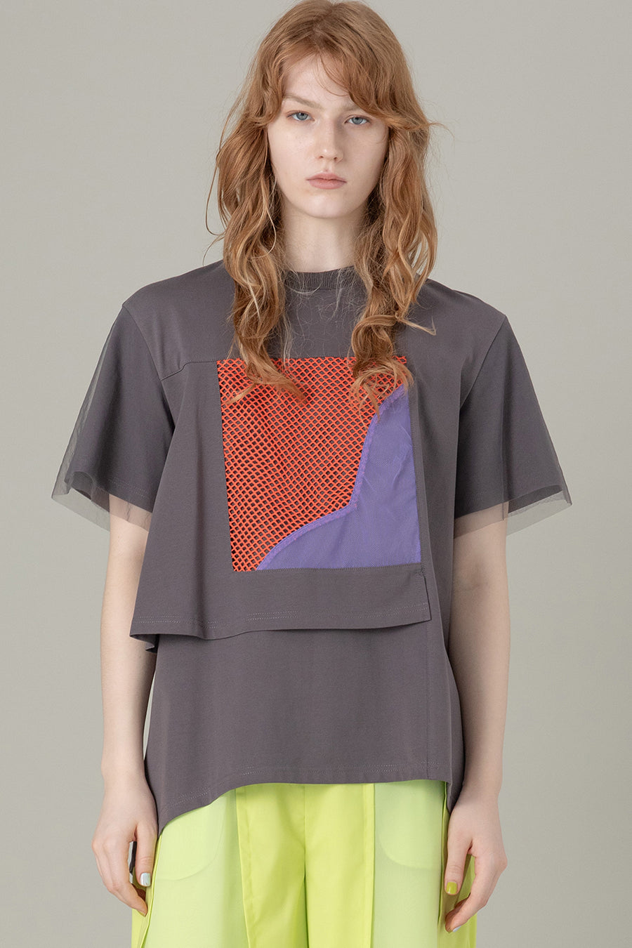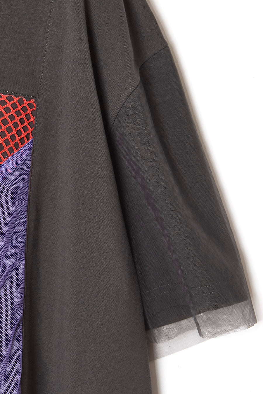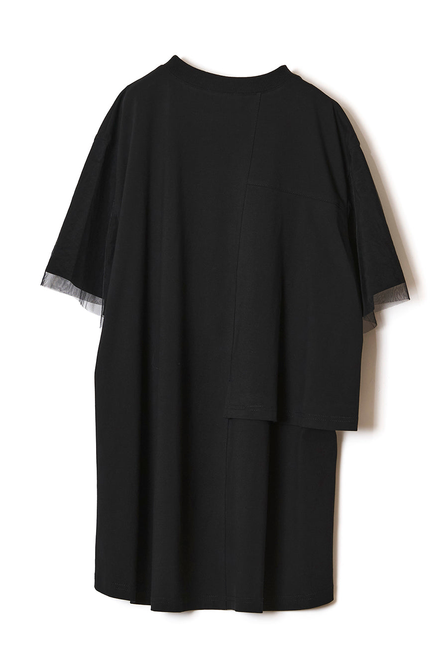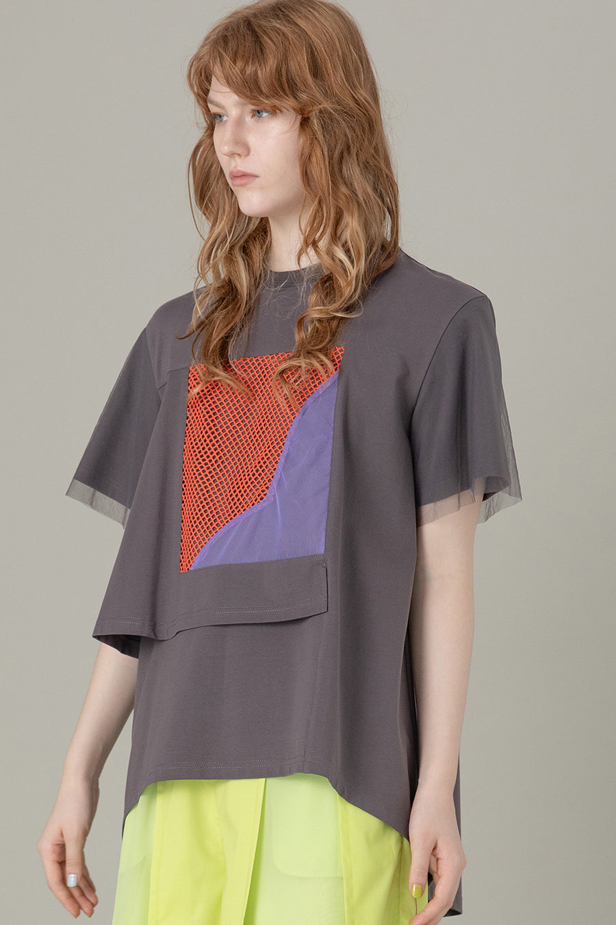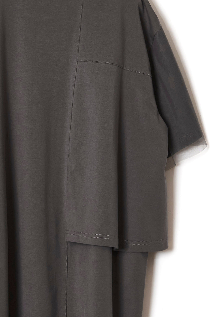 大メッシュと小メッシュを配色にして、アートのような切り替えをフロントに埋め込んだデザインTシャツ。カットソーは綺麗な目面の天竺で、真夏まで着用可能なドライタッチな生地感。右身頃はレイヤードデザインなので、フロントのアート風メッシュからインナーが透けること無く、立体的で動きのあるディティールに仕上がっており、裾はボトムにインすると、短丈Tシャツ風に見え、スタイリングの幅も広げてくれる。丈は前後差をつけ、後ろはヒップが隠れる程の丈感。袖はチュールを重ねてシアー感を取り入れたさりげないデザインポイント。バストやアームホールはゆとりのあるオーバーサイジングなので肌離れが良く、快適にご着用可能。