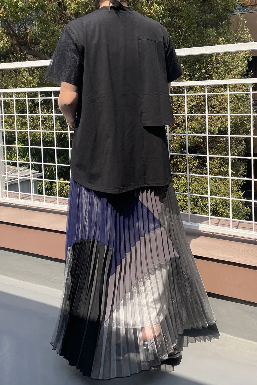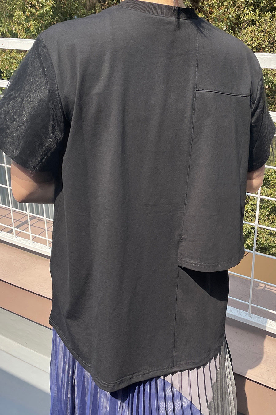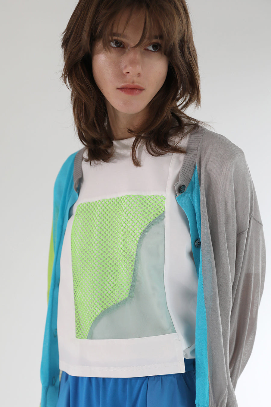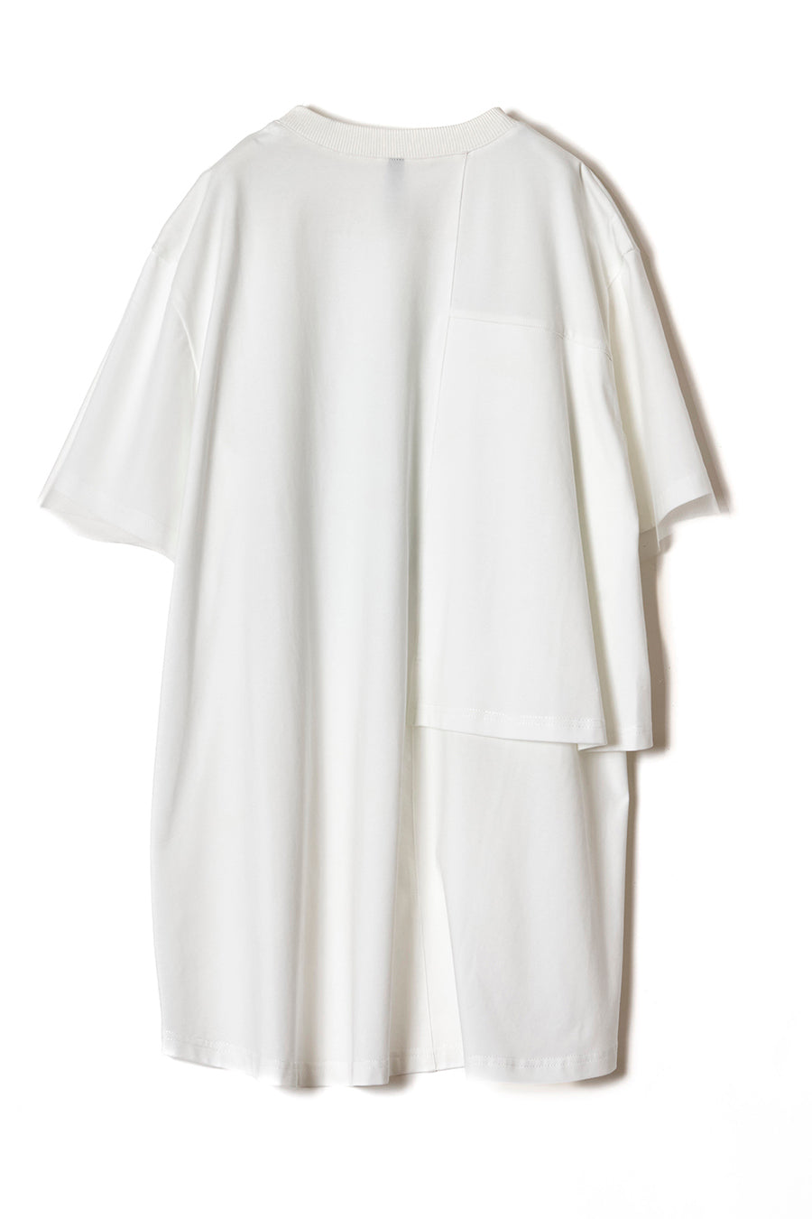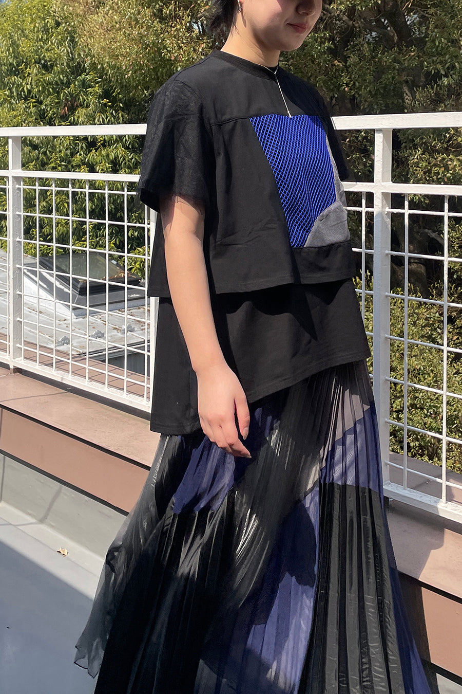 大メッシュと小メッシュを配色にして、アートのような切り替えをフロントに埋め込んだデザインTシャツ。カットソーは綺麗な目面の天竺で、真夏まで着用可能なドライタッチな生地感。右身頃はレイヤードデザインなので、フロントのアート風メッシュからインナーが透けること無く、立体的で動きのあるディティールに仕上がっており、裾はボトムにインすると、短丈Tシャツ風に見え、スタイリングの幅も広げてくれる。丈は前後差をつけ、後ろはヒップが隠れる程の丈感。袖はチュールを重ねてシアー感を取り入れたさりげないデザインポイント。バストやアームホールはゆとりのあるオーバーサイジングなので肌離れが良く、快適にご着用可能。