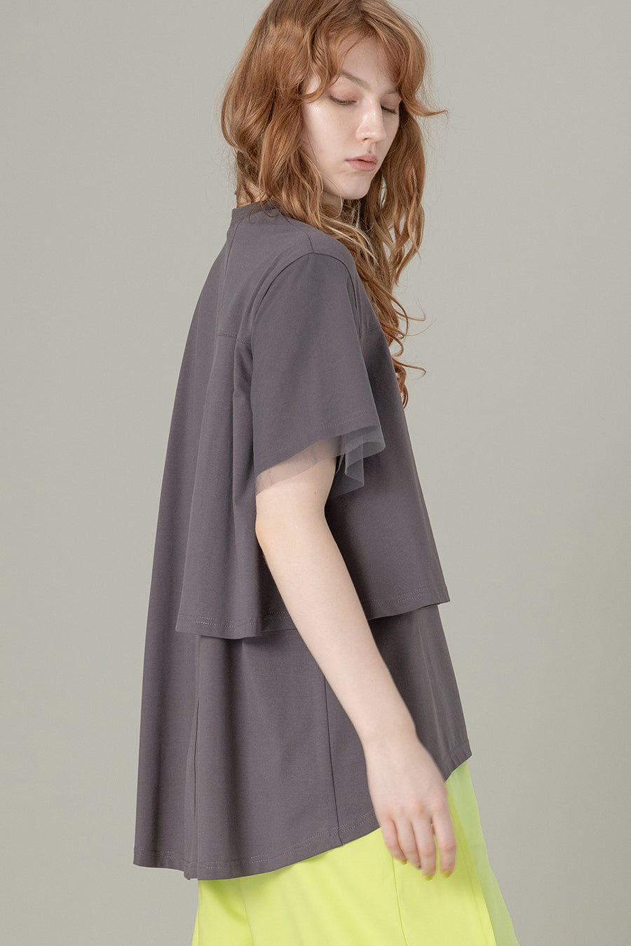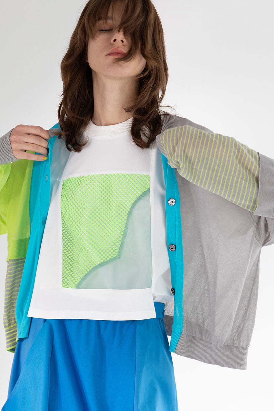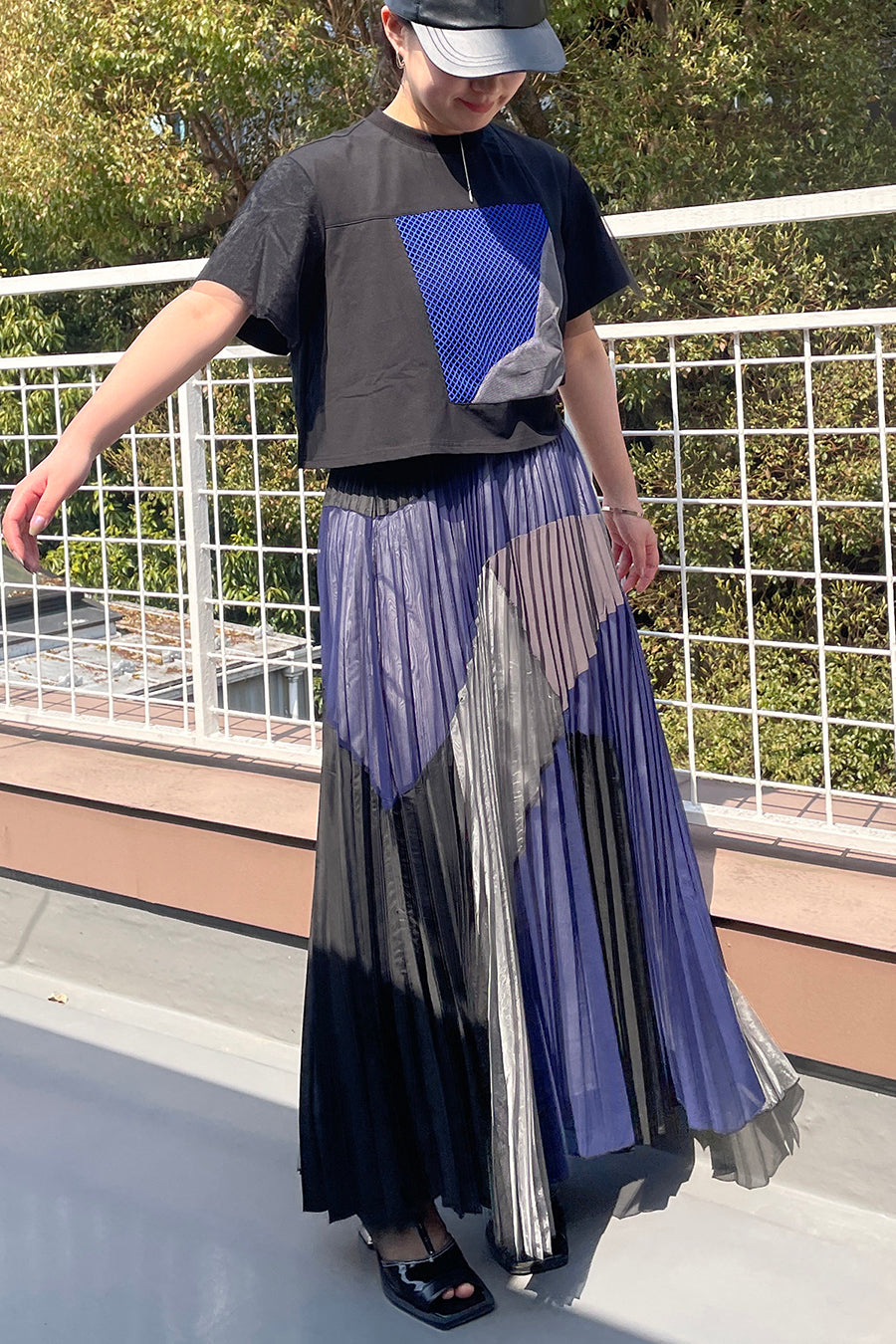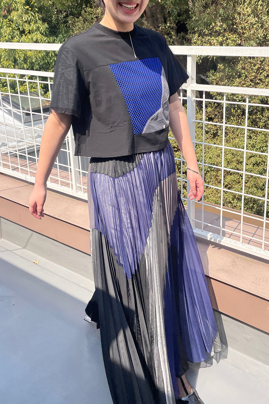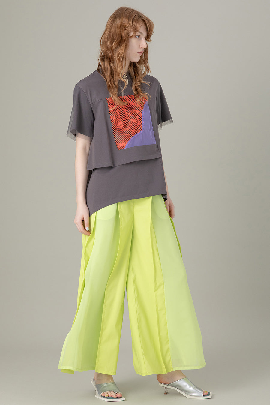 大メッシュと小メッシュを配色にして、アートのような切り替えをフロントに埋め込んだデザインTシャツ。カットソーは綺麗な目面の天竺で、真夏まで着用可能なドライタッチな生地感。右身頃はレイヤードデザインなので、フロントのアート風メッシュからインナーが透けること無く、立体的で動きのあるディティールに仕上がっており、裾はボトムにインすると、短丈Tシャツ風に見え、スタイリングの幅も広げてくれる。丈は前後差をつけ、後ろはヒップが隠れる程の丈感。袖はチュールを重ねてシアー感を取り入れたさりげないデザインポイント。バストやアームホールはゆとりのあるオーバーサイジングなので肌離れが良く、快適にご着用可能。
