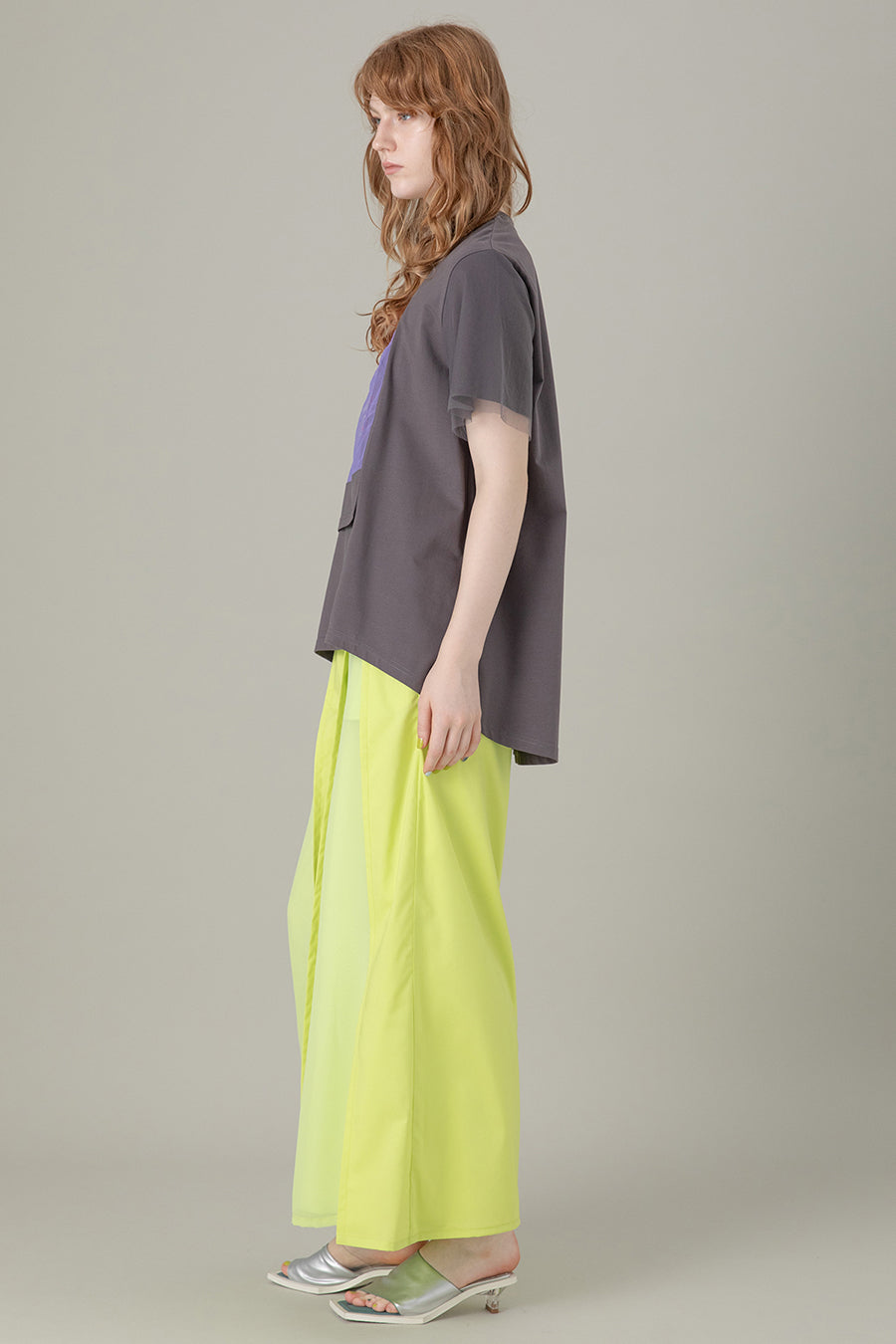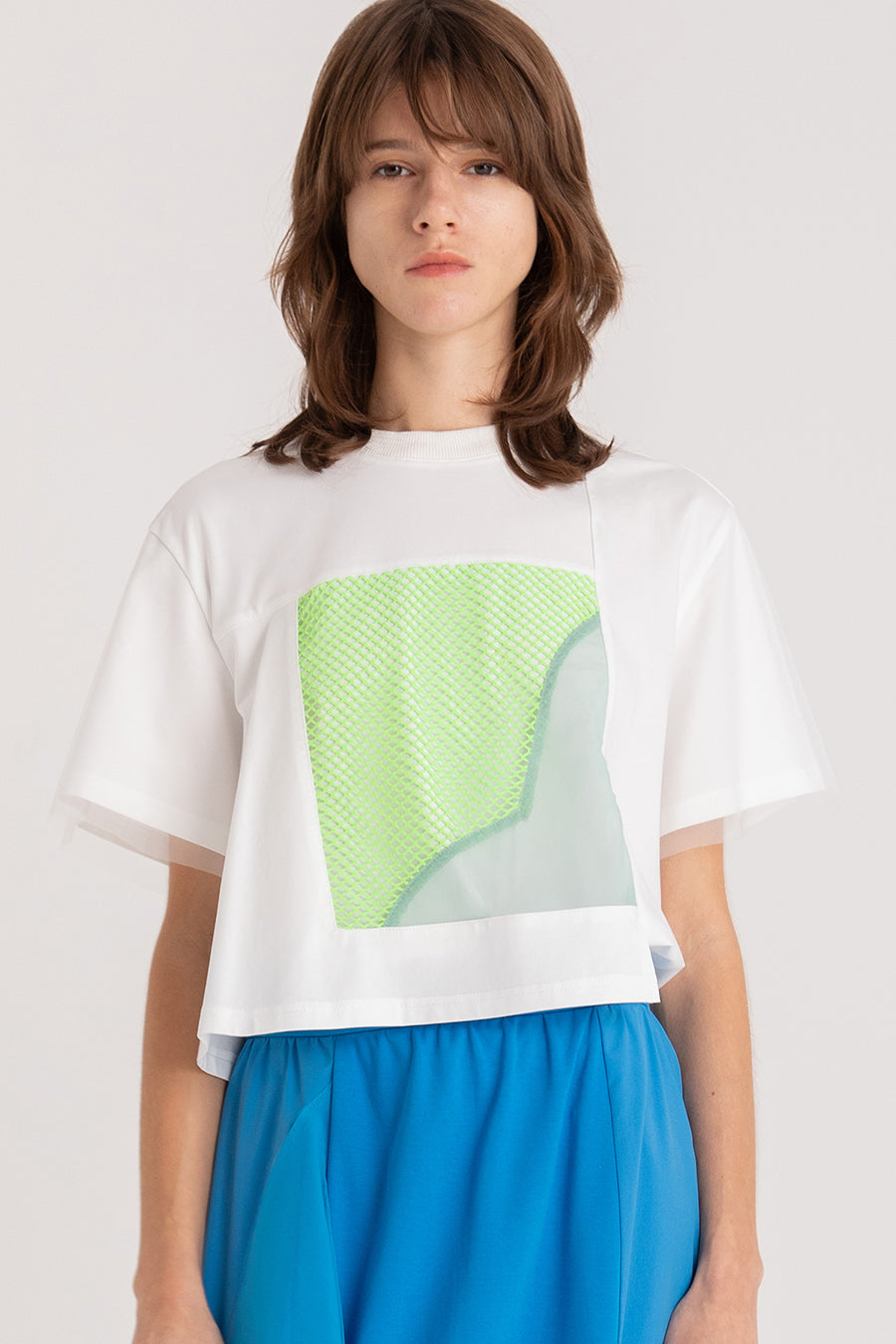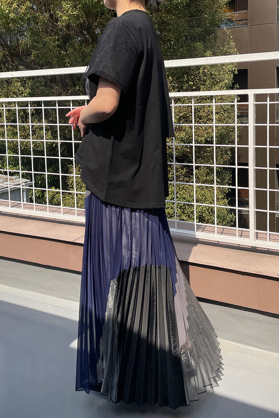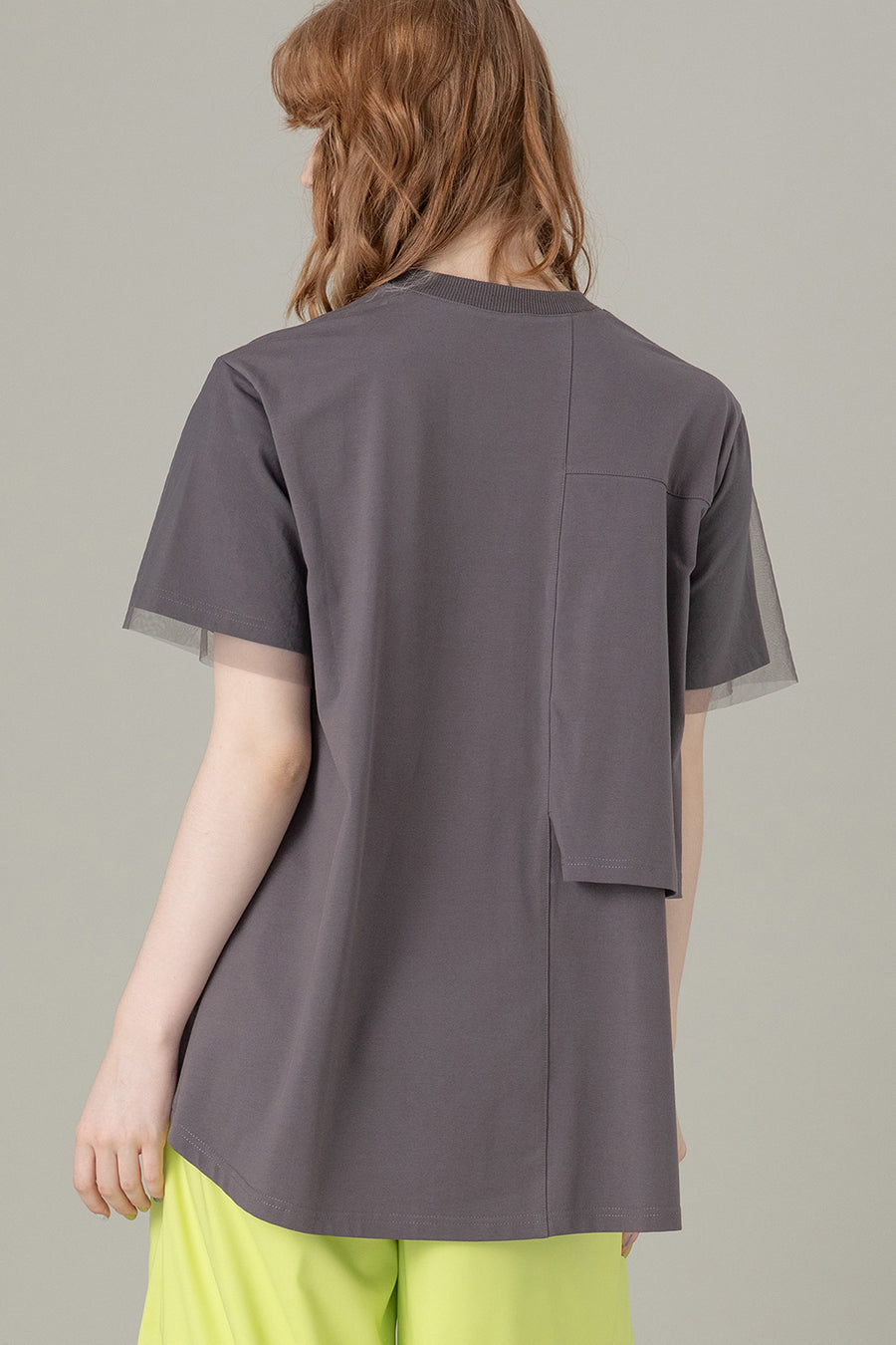 大メッシュと小メッシュを配色にして、アートのような切り替えをフロントに埋め込んだデザインTシャツ。カットソーは綺麗な目面の天竺で、真夏まで着用可能なドライタッチな生地感。右身頃はレイヤードデザインなので、フロントのアート風メッシュからインナーが透けること無く、立体的で動きのあるディティールに仕上がっており、裾はボトムにインすると、短丈Tシャツ風に見え、スタイリングの幅も広げてくれる。丈は前後差をつけ、後ろはヒップが隠れる程の丈感。袖はチュールを重ねてシアー感を取り入れたさりげないデザインポイント。バストやアームホールはゆとりのあるオーバーサイジングなので肌離れが良く、快適にご着用可能。