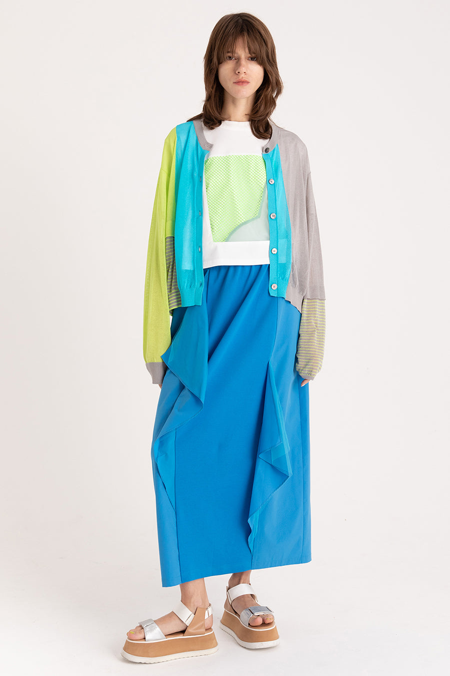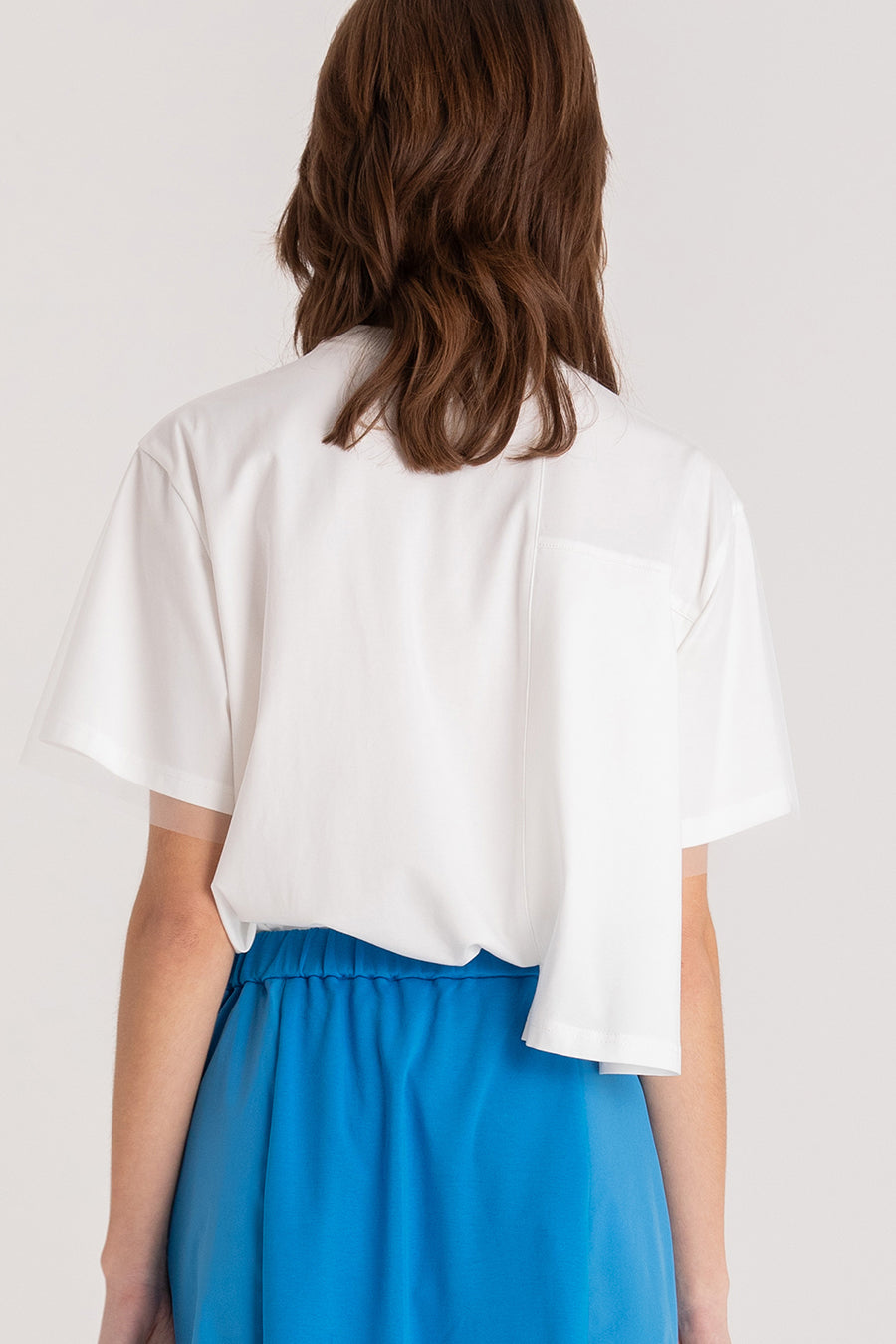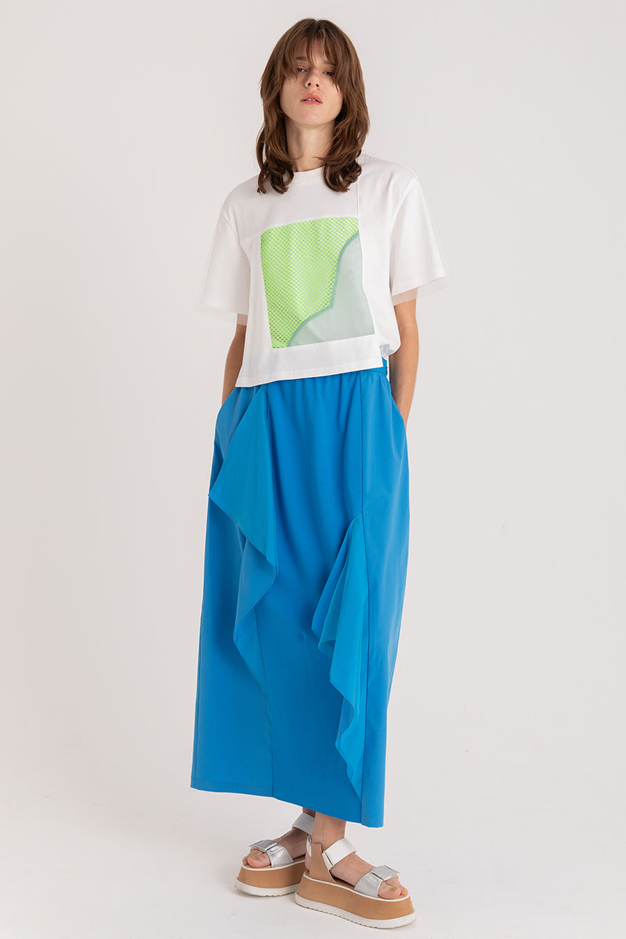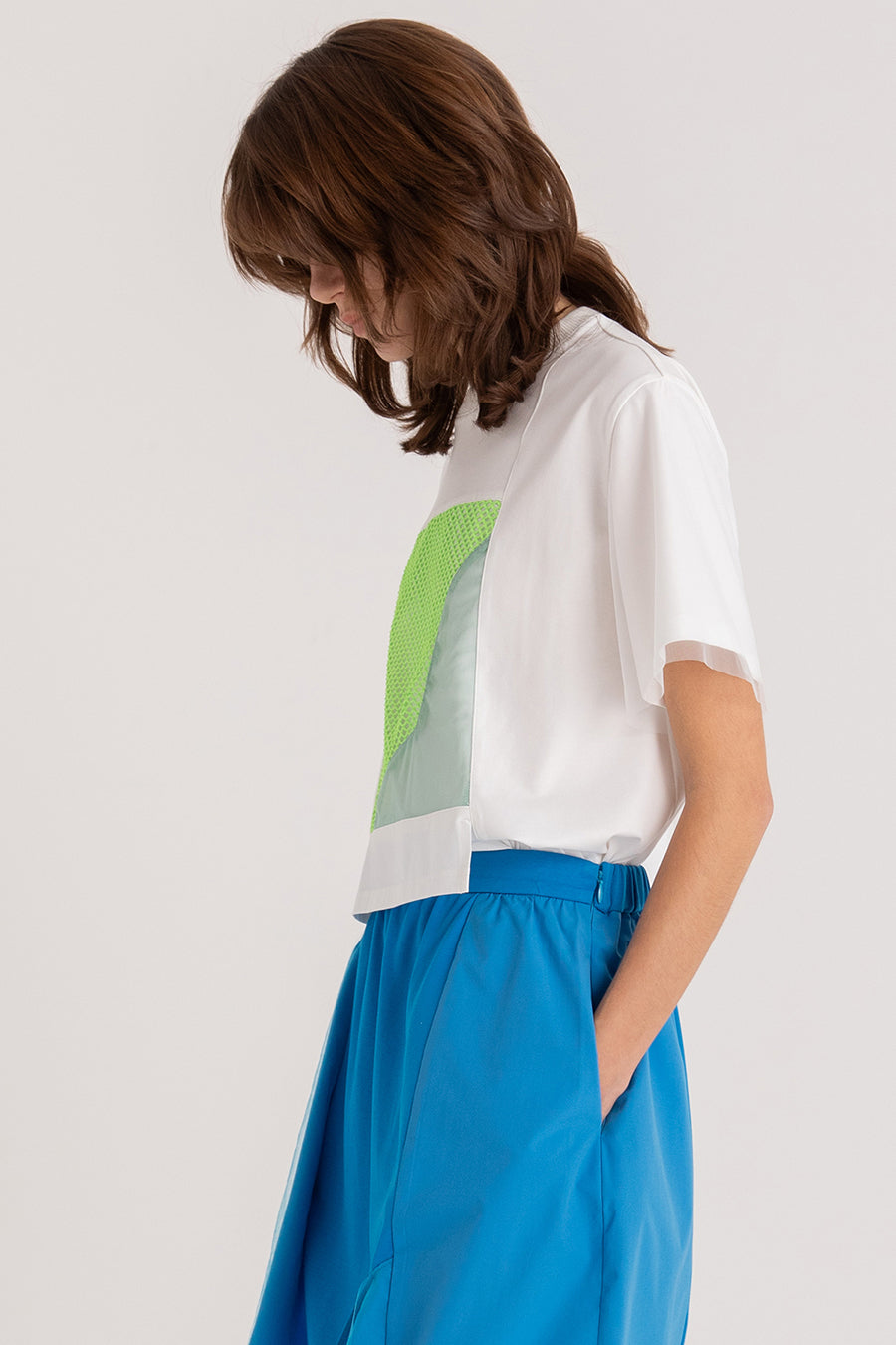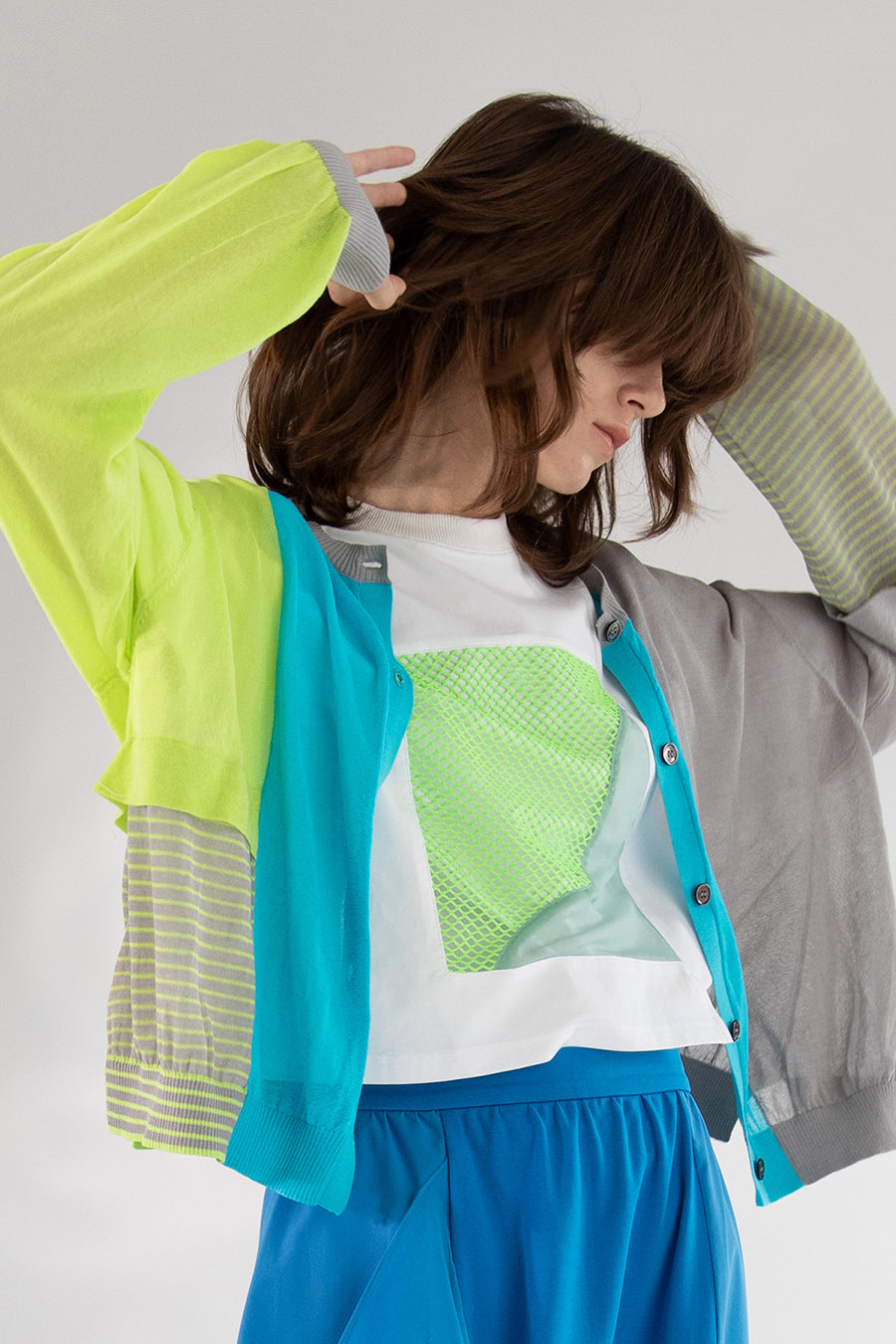 大メッシュと小メッシュを配色にして、アートのような切り替えをフロントに埋め込んだデザインTシャツ。カットソーは綺麗な目面の天竺で、真夏まで着用可能なドライタッチな生地感。右身頃はレイヤードデザインなので、フロントのアート風メッシュからインナーが透けること無く、立体的で動きのあるディティールに仕上がっており、裾はボトムにインすると、短丈Tシャツ風に見え、スタイリングの幅も広げてくれる。丈は前後差をつけ、後ろはヒップが隠れる程の丈感。袖はチュールを重ねてシアー感を取り入れたさりげないデザインポイント。バストやアームホールはゆとりのあるオーバーサイジングなので肌離れが良く、快適にご着用可能。