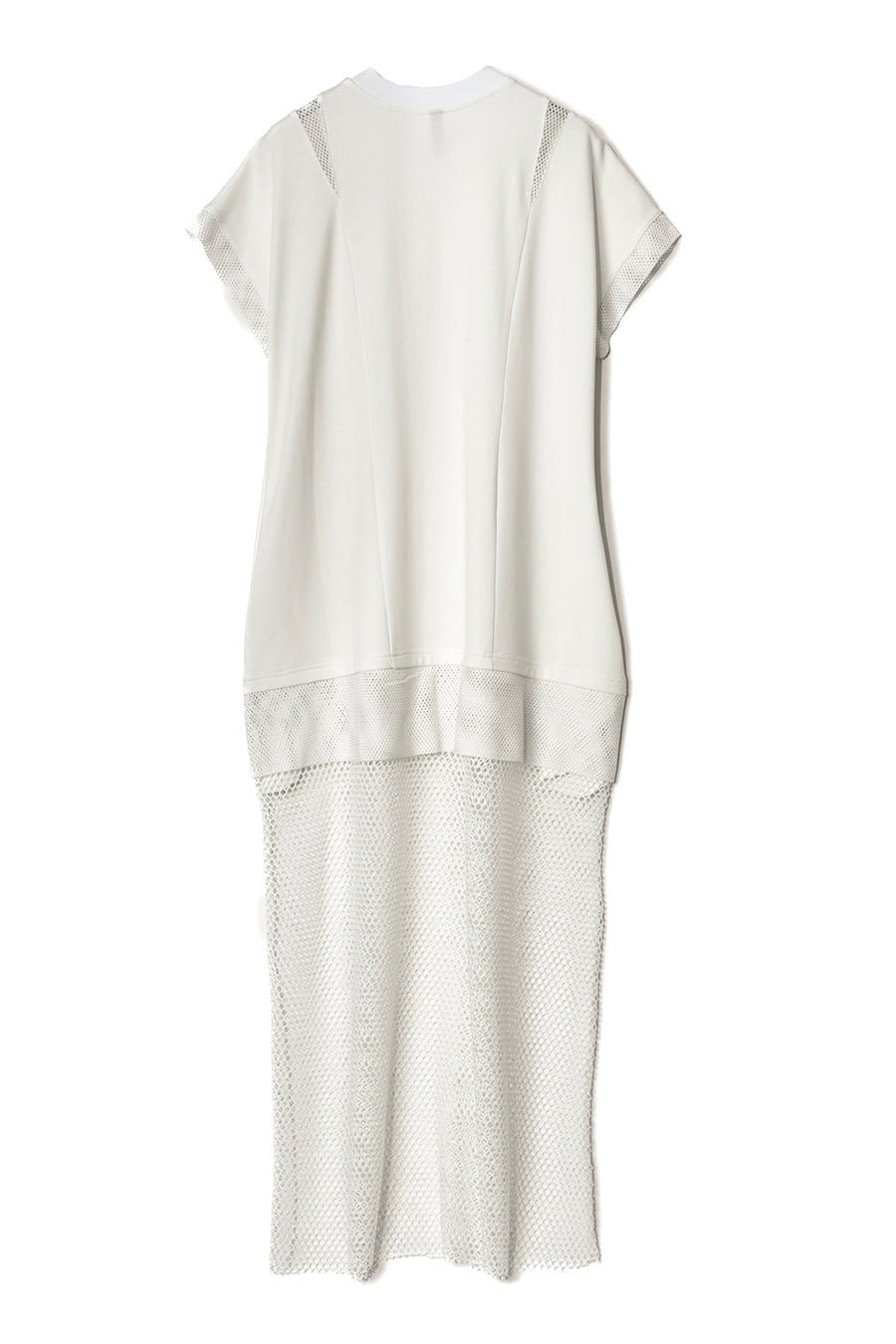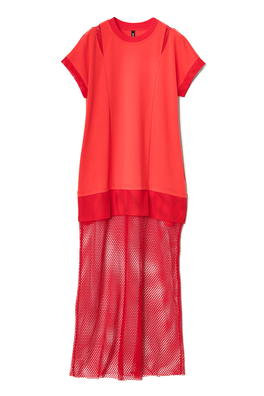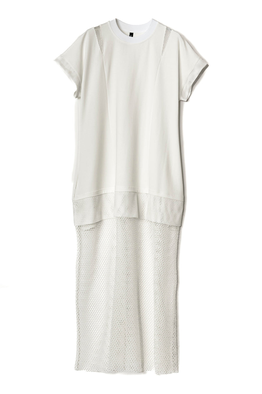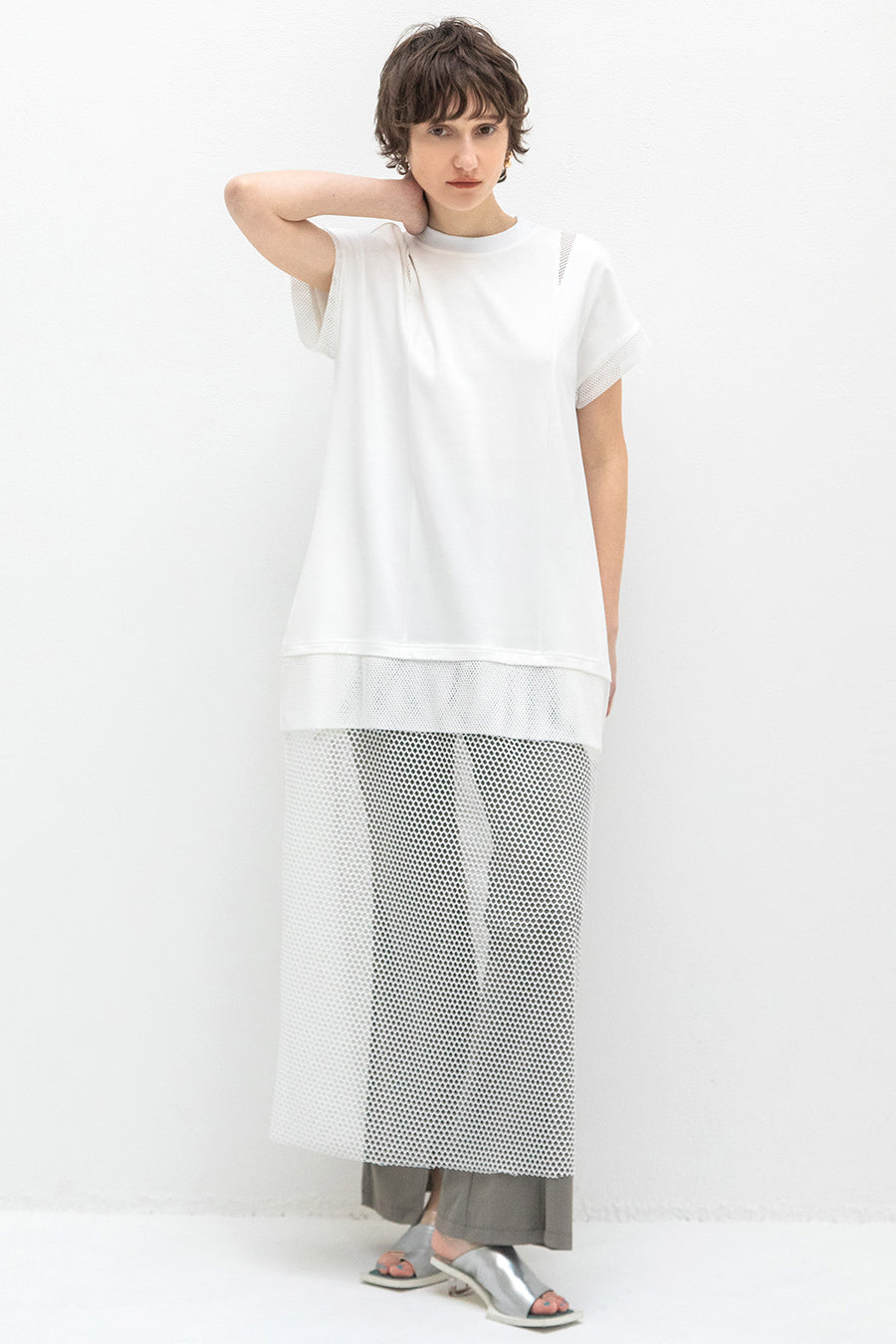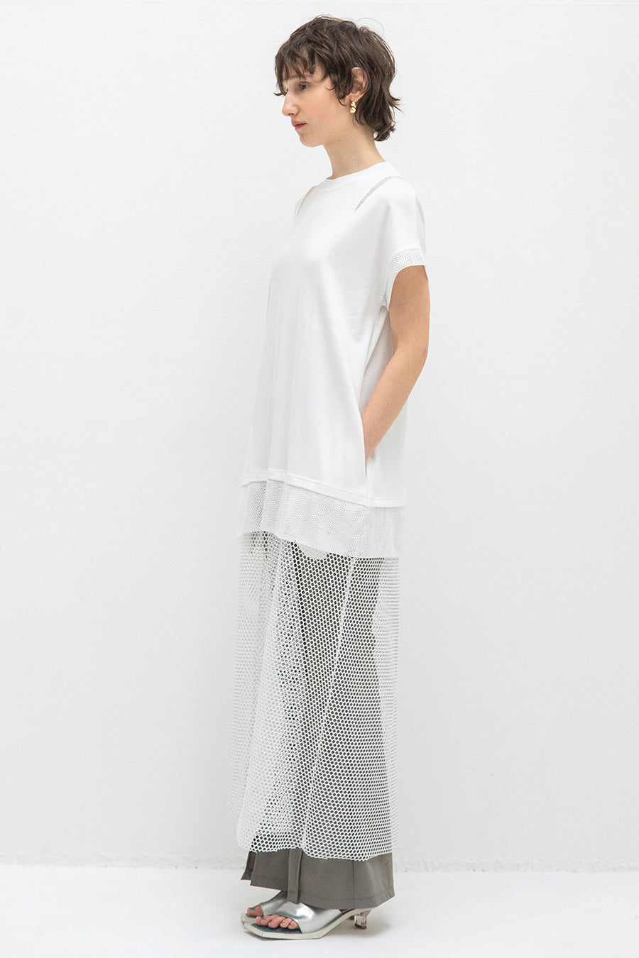 コットンスムースTシャツの裾から小メッシュが覗き、さらに大メッシュのスカートがレイヤードされた涼し気な軽いワンピース。スカート部分は裏無しで透けて