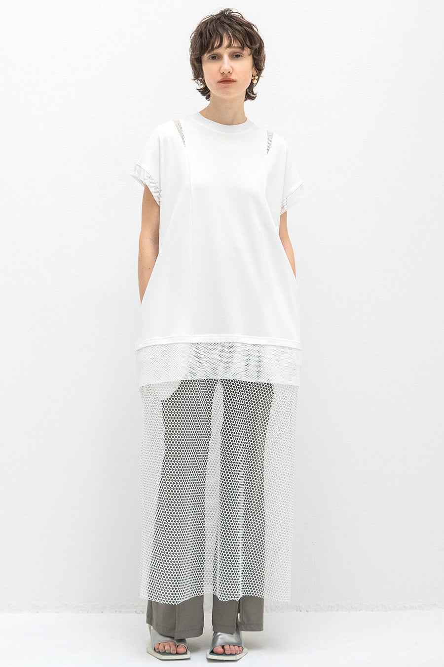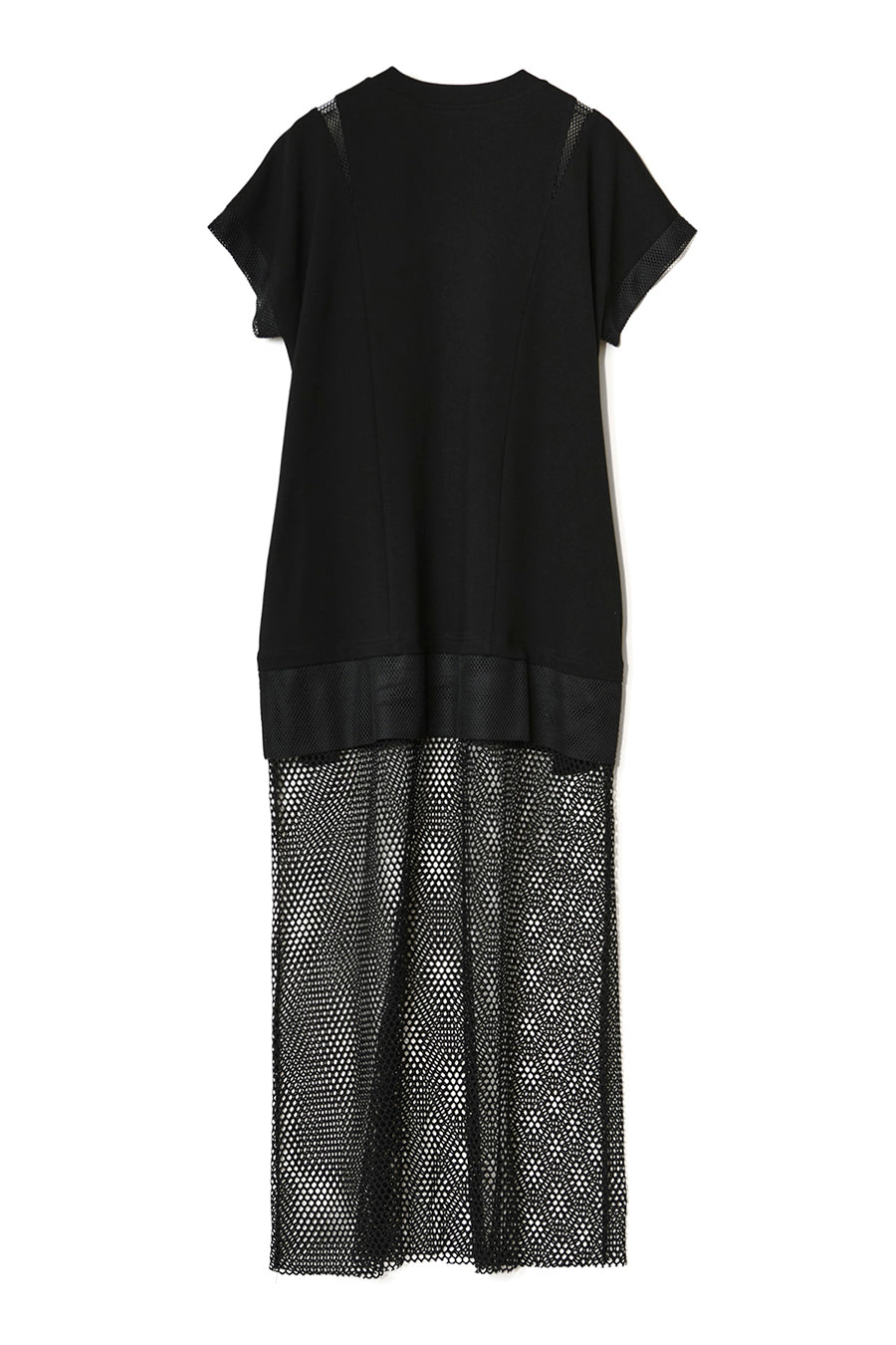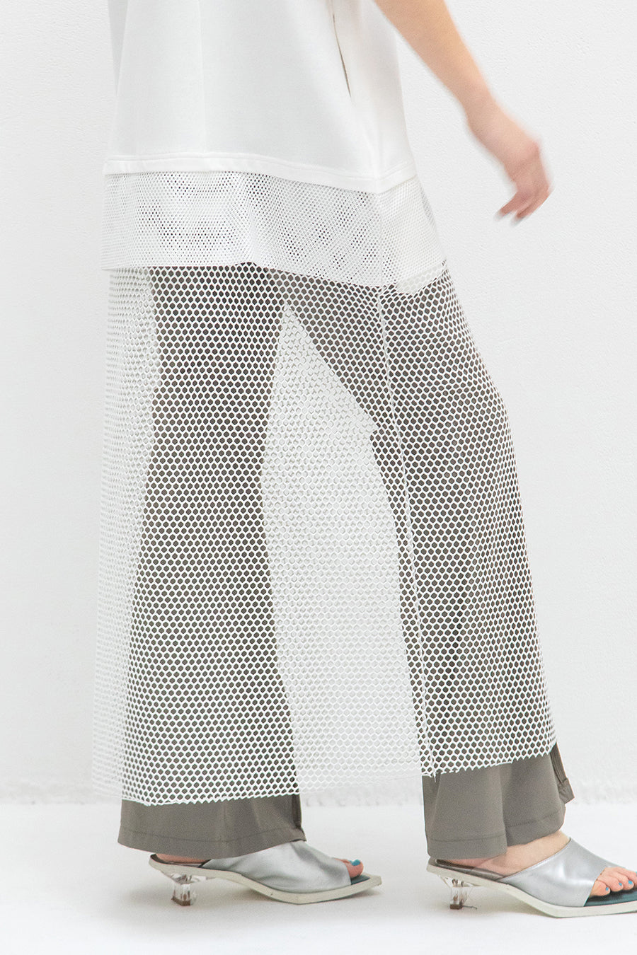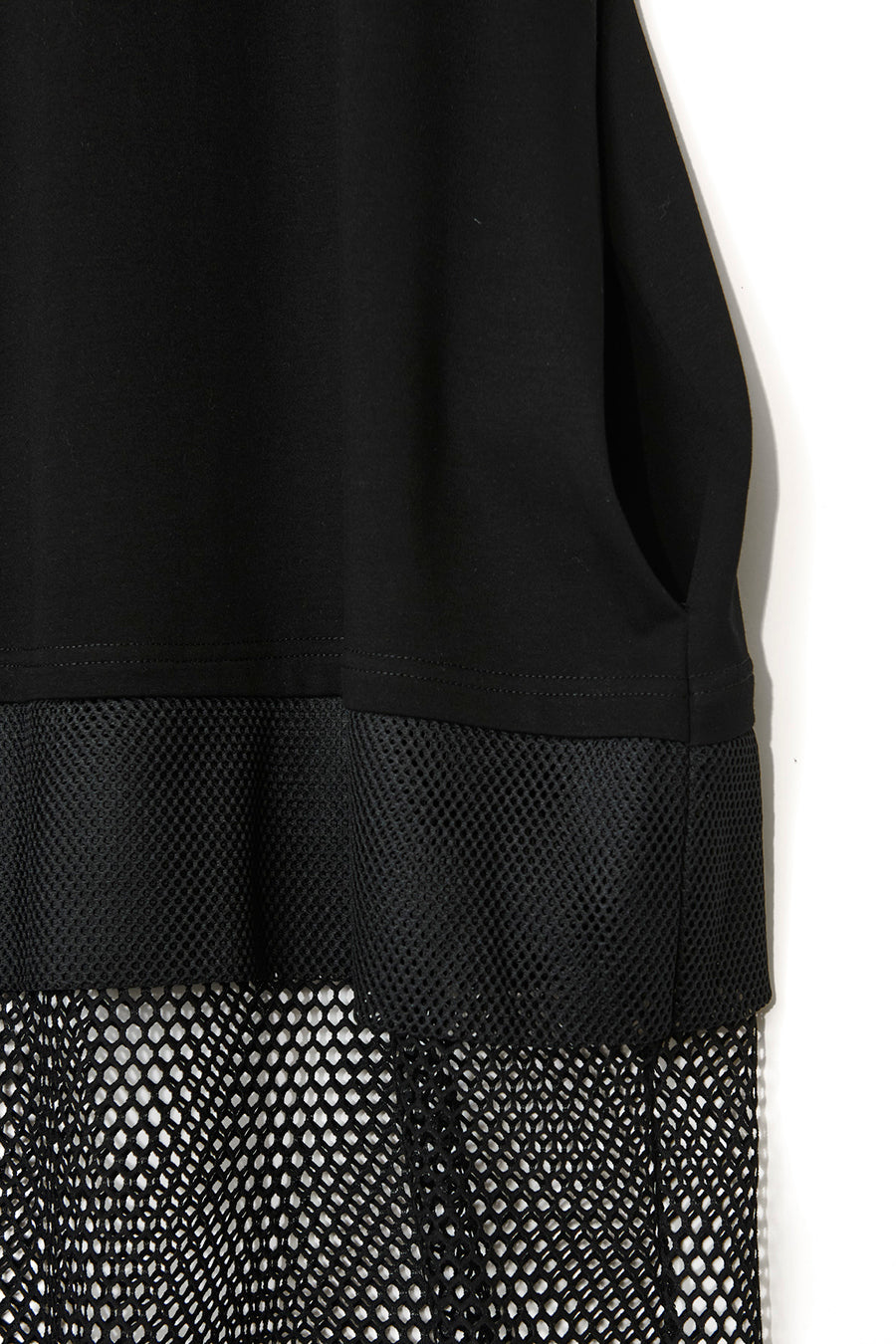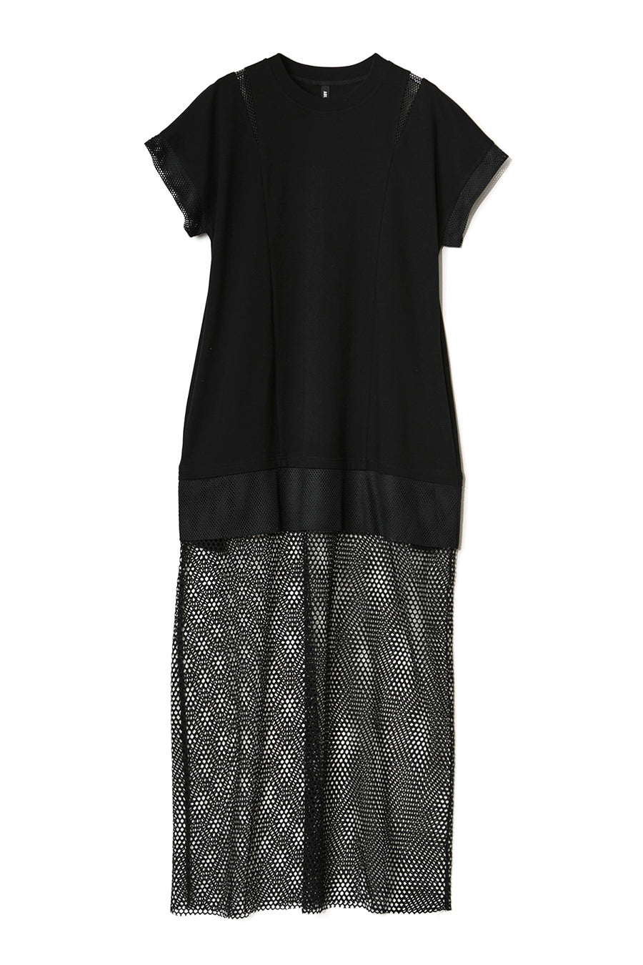 コットンスムースTシャツの裾から小メッシュが覗き、さらに大メッシュのスカートがレイヤードされた涼し気な軽いワンピース。スカート部分は裏無しで透けて