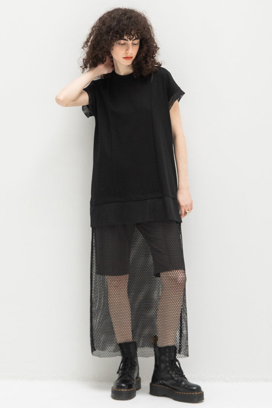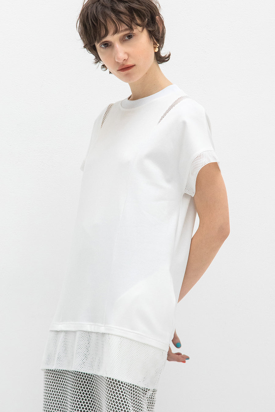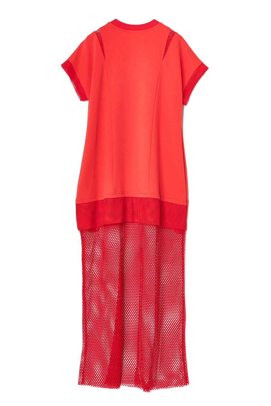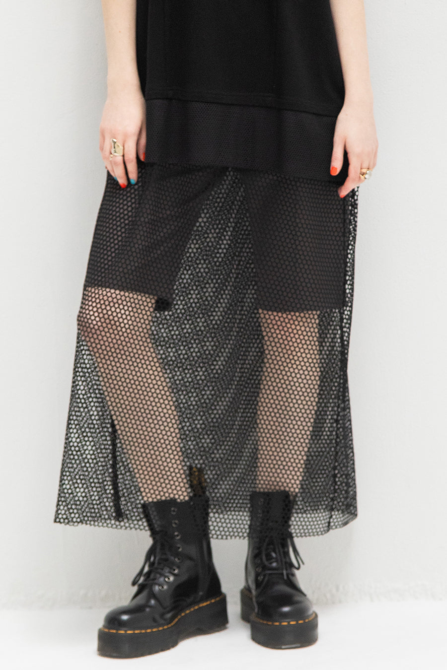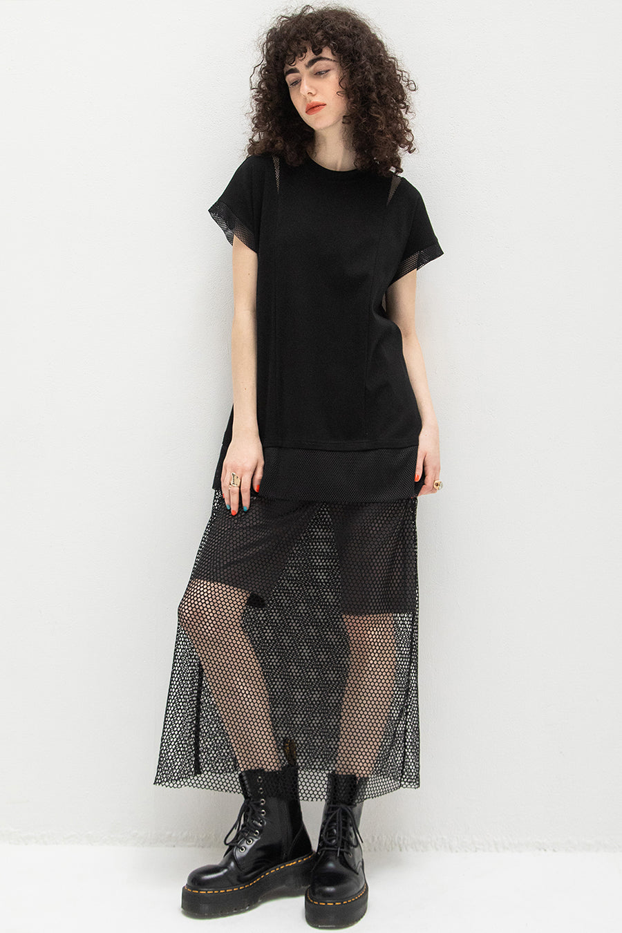 コットンスムースTシャツの裾から小メッシュが覗き、さらに大メッシュのスカートがレイヤードされた涼し気な軽いワンピース。スカート部分は裏無しで透けて