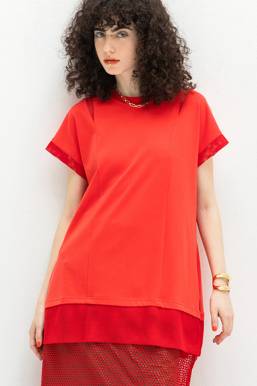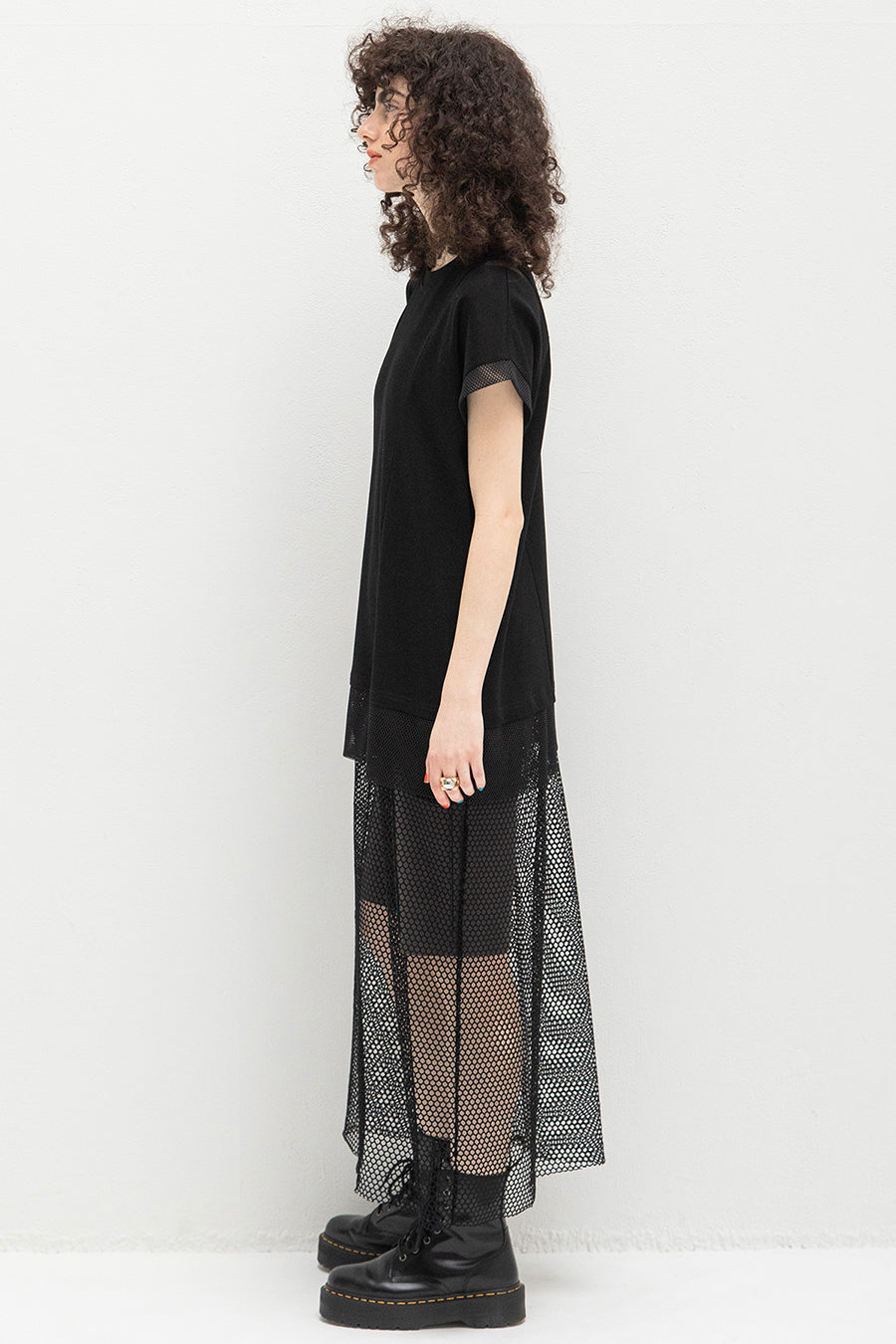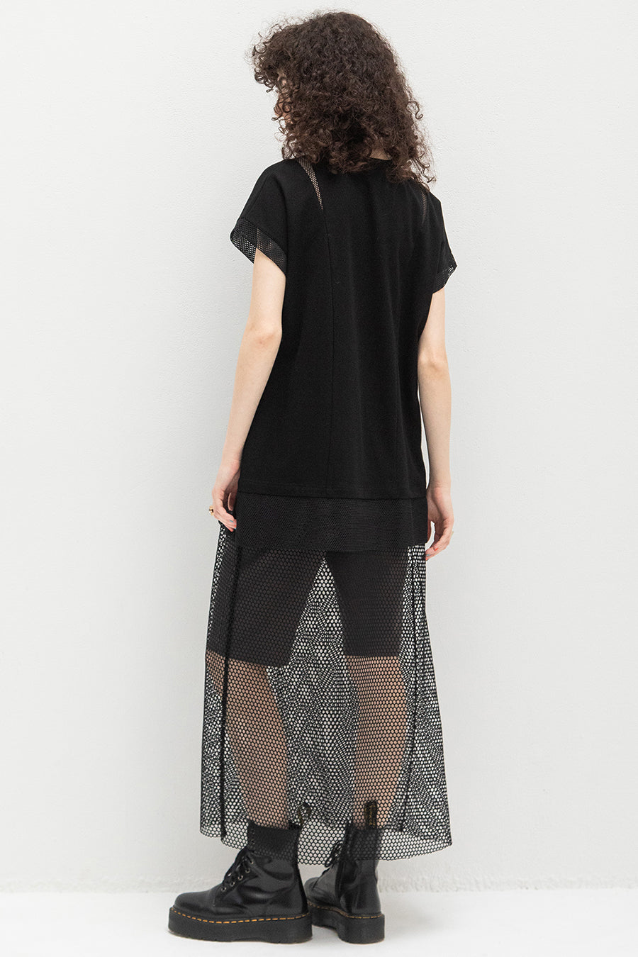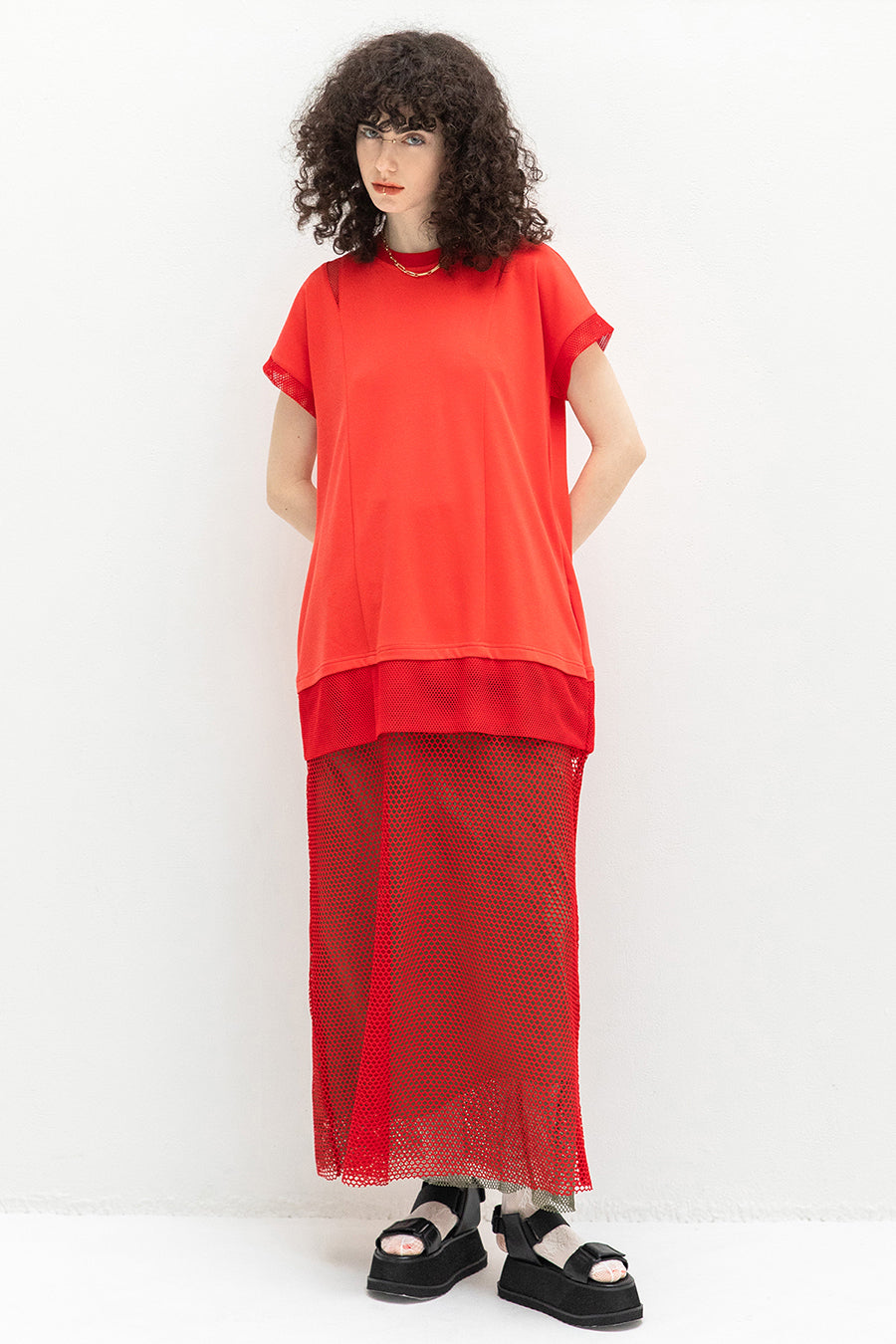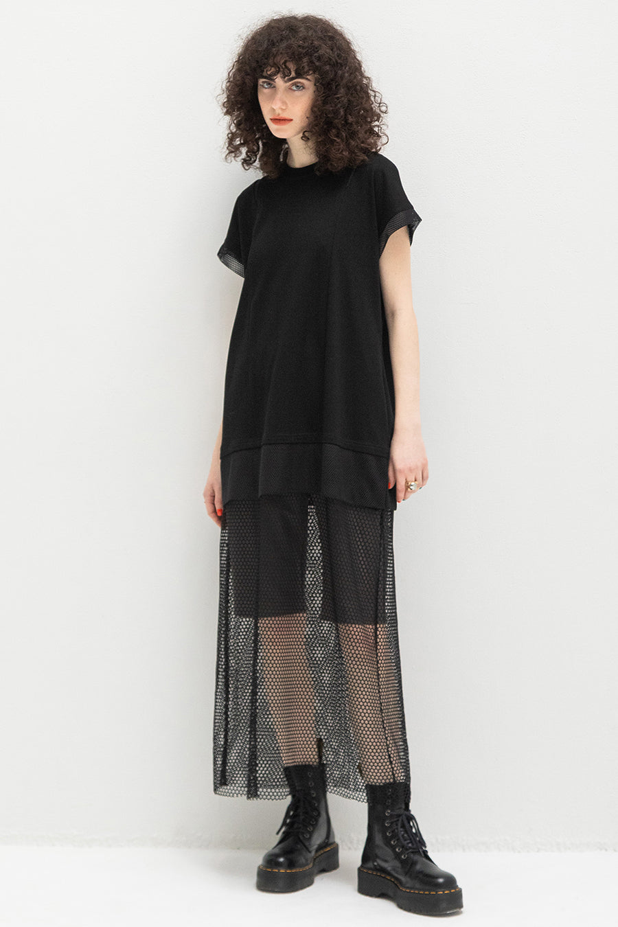 コットンスムースTシャツの裾から小メッシュが覗き、さらに大メッシュのスカートがレイヤードされた涼し気な軽いワンピース。スカート部分は裏無しで透けて