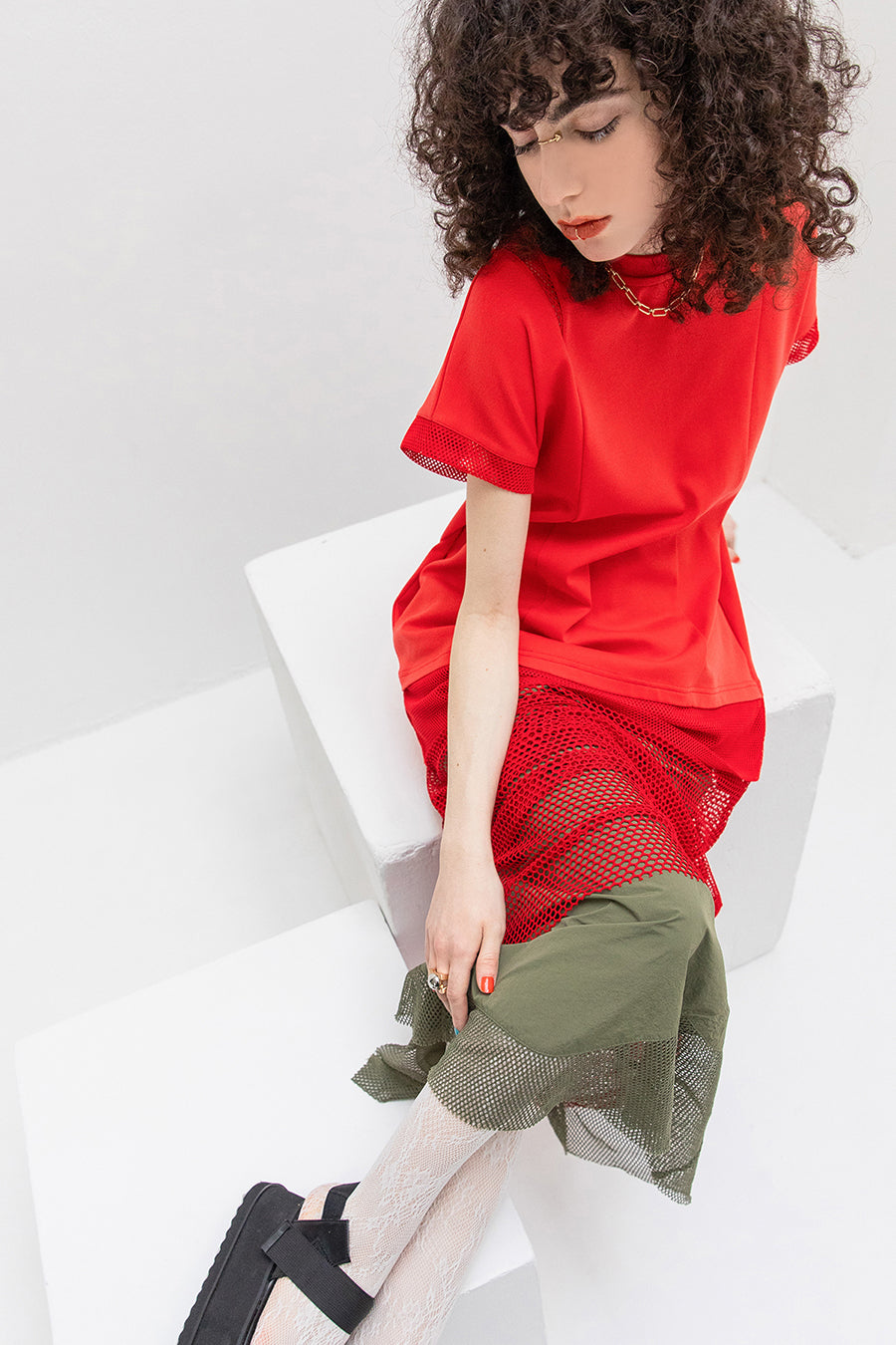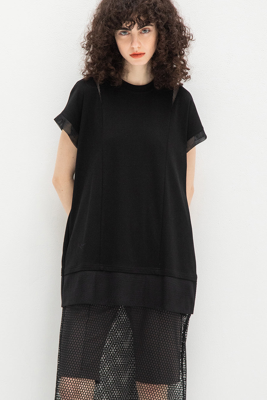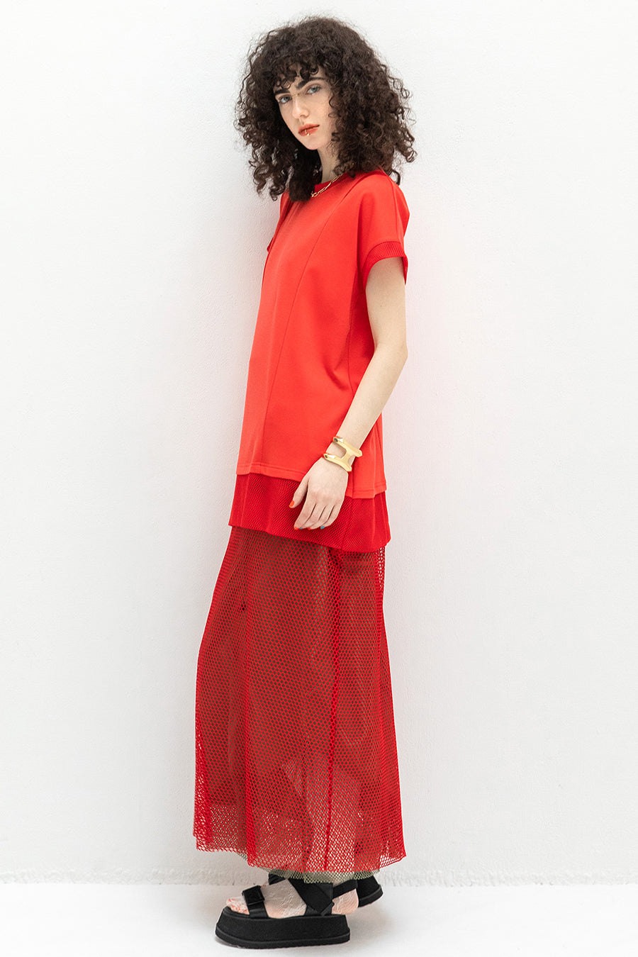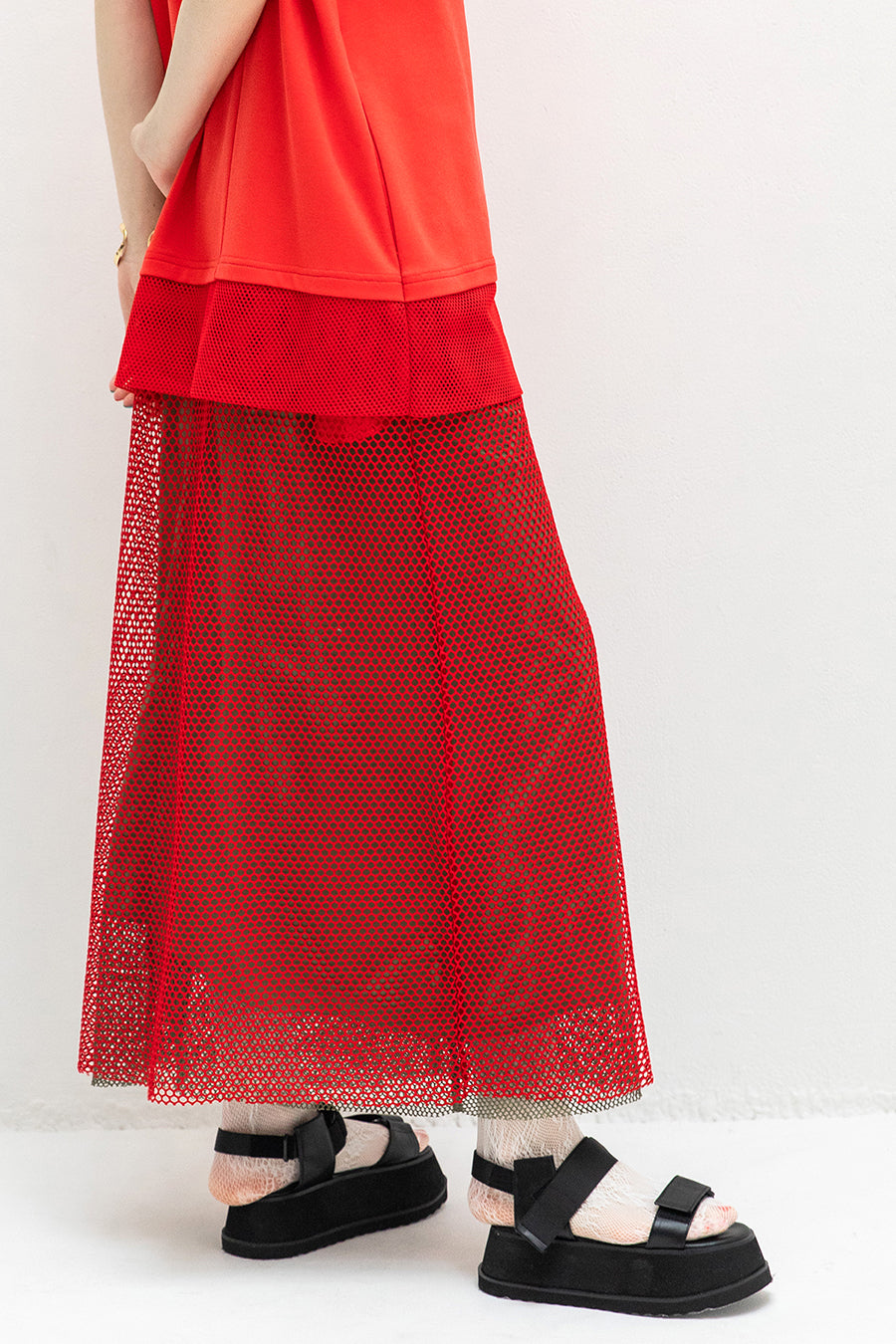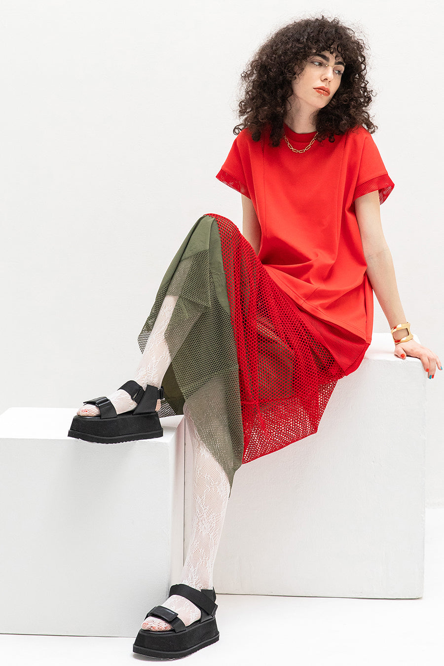 コットンスムースTシャツの裾から小メッシュが覗き、さらに大メッシュのスカートがレイヤードされた涼し気な軽いワンピース。スカート部分は裏無しで透けて