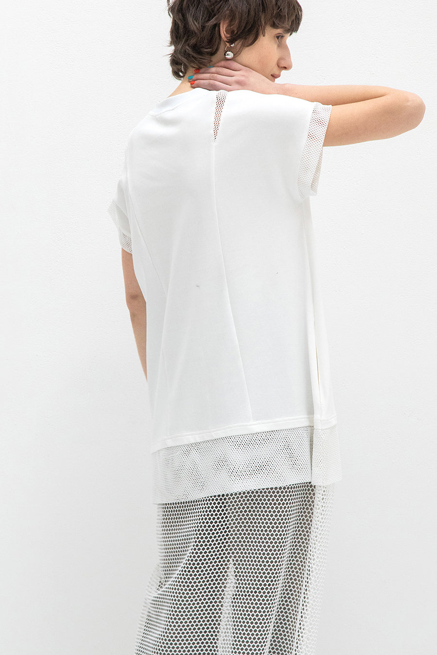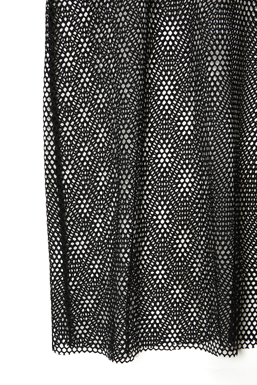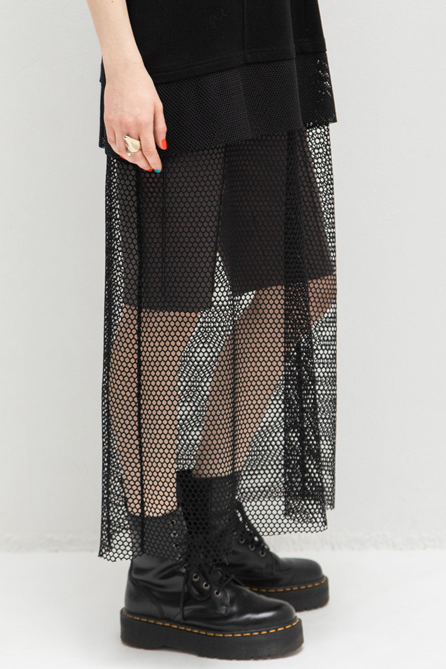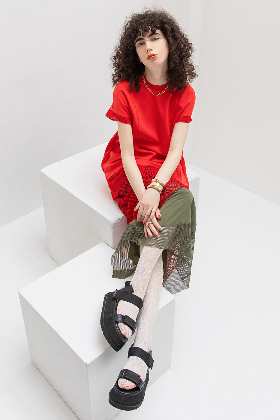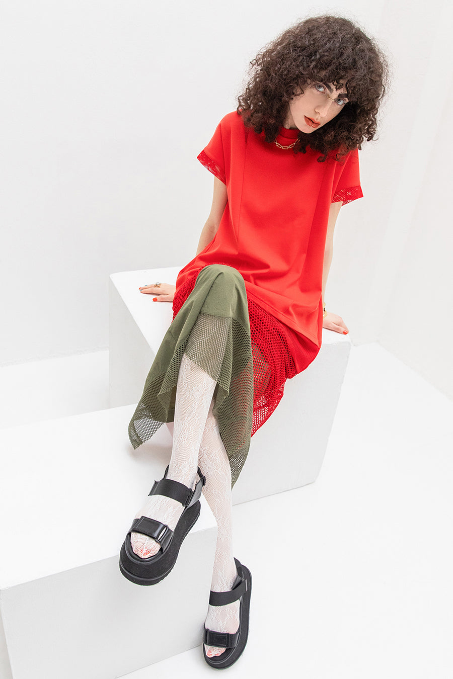 コットンスムースTシャツの裾から小メッシュが覗き、さらに大メッシュのスカートがレイヤードされた涼し気な軽いワンピース。スカート部分は裏無しで透けて