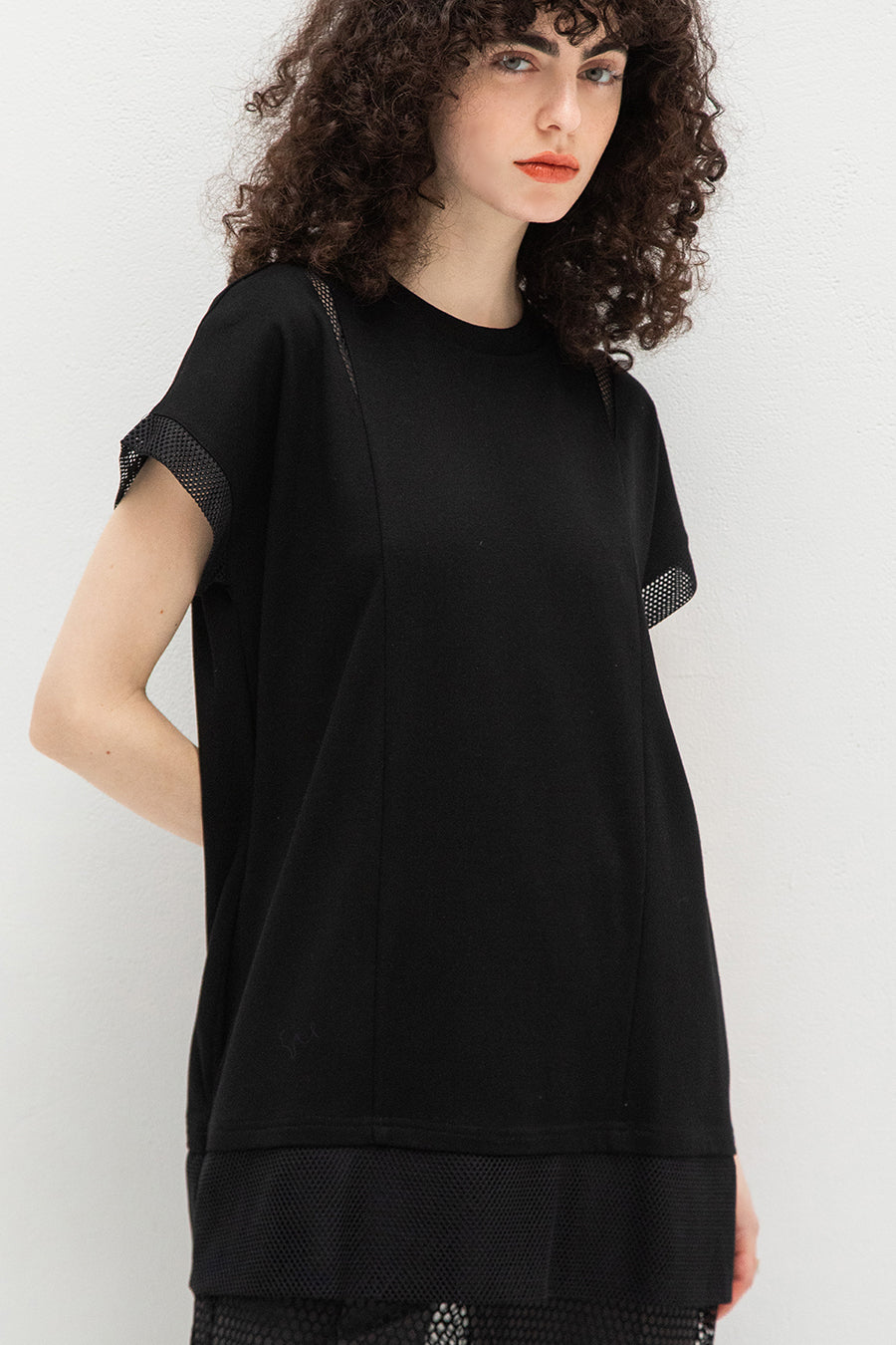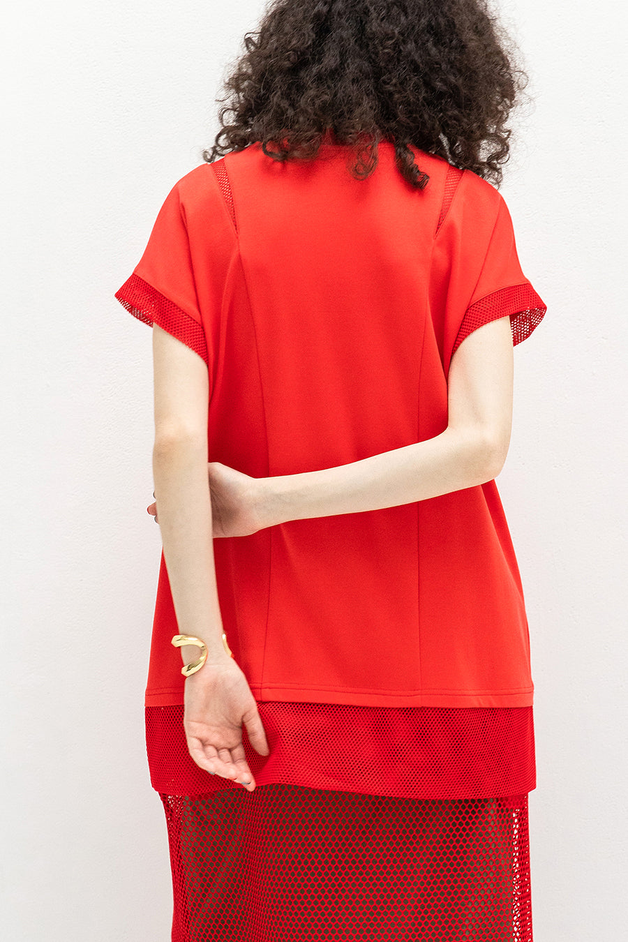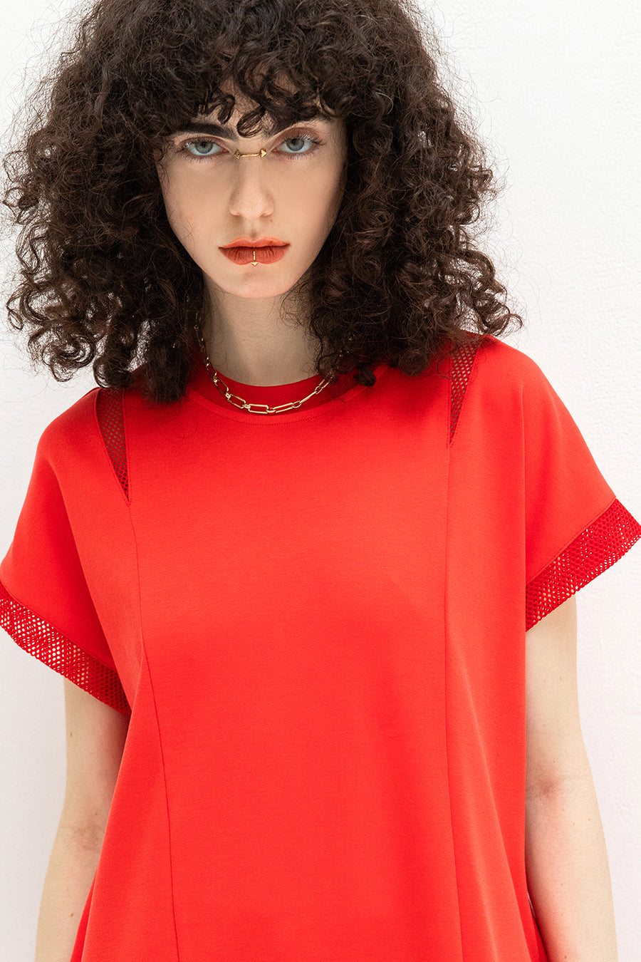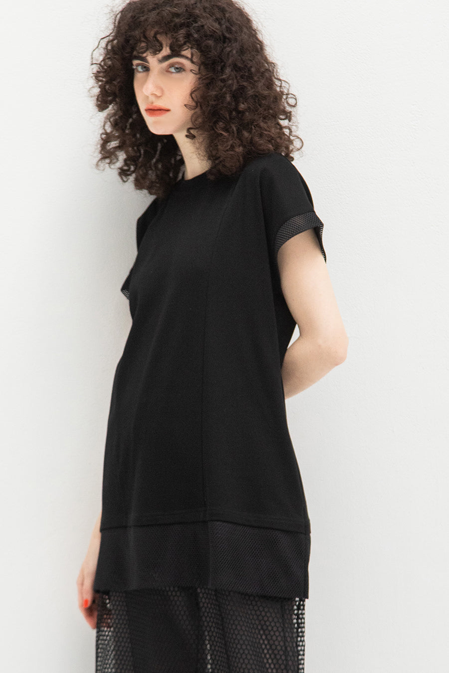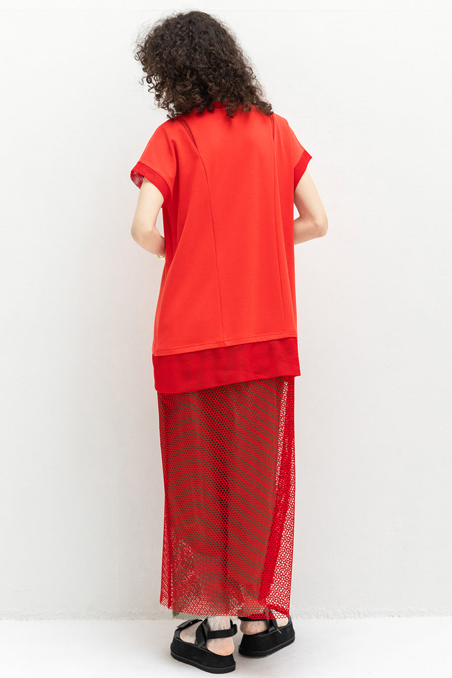 コットンスムースTシャツの裾から小メッシュが覗き、さらに大メッシュのスカートがレイヤードされた涼し気な軽いワンピース。スカート部分は裏無しで透けて