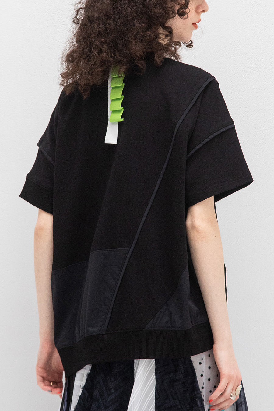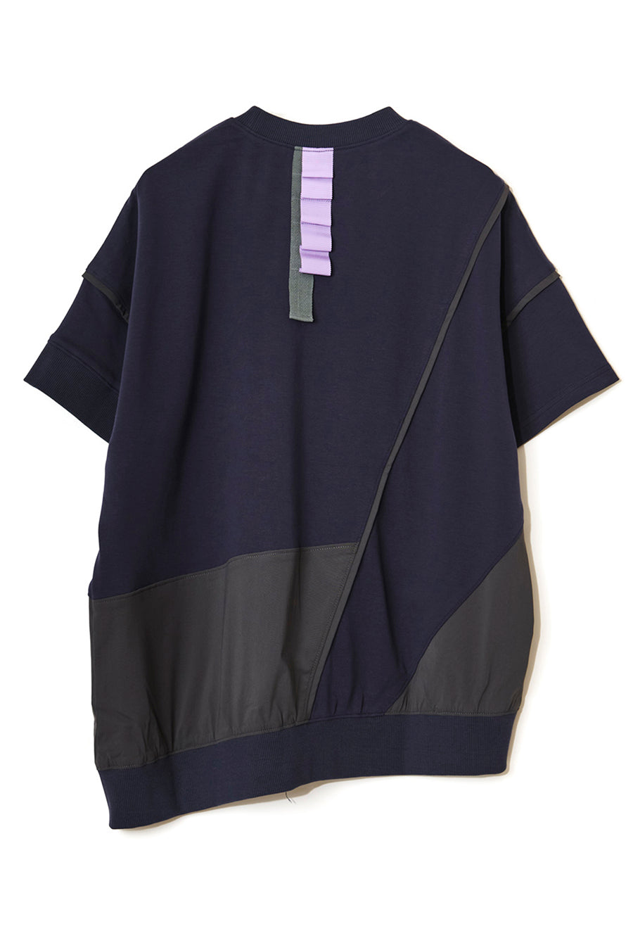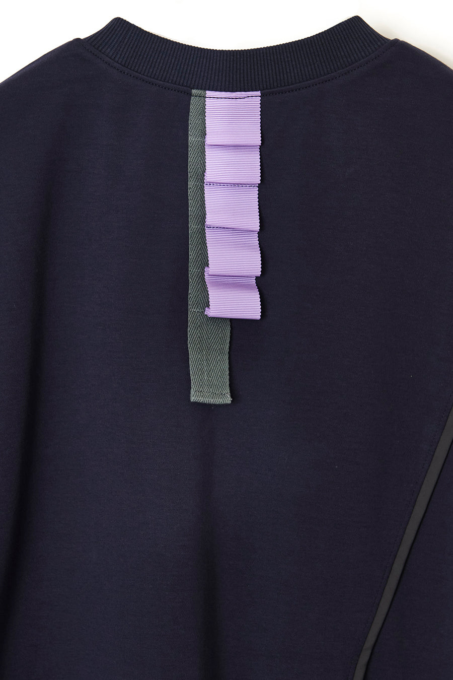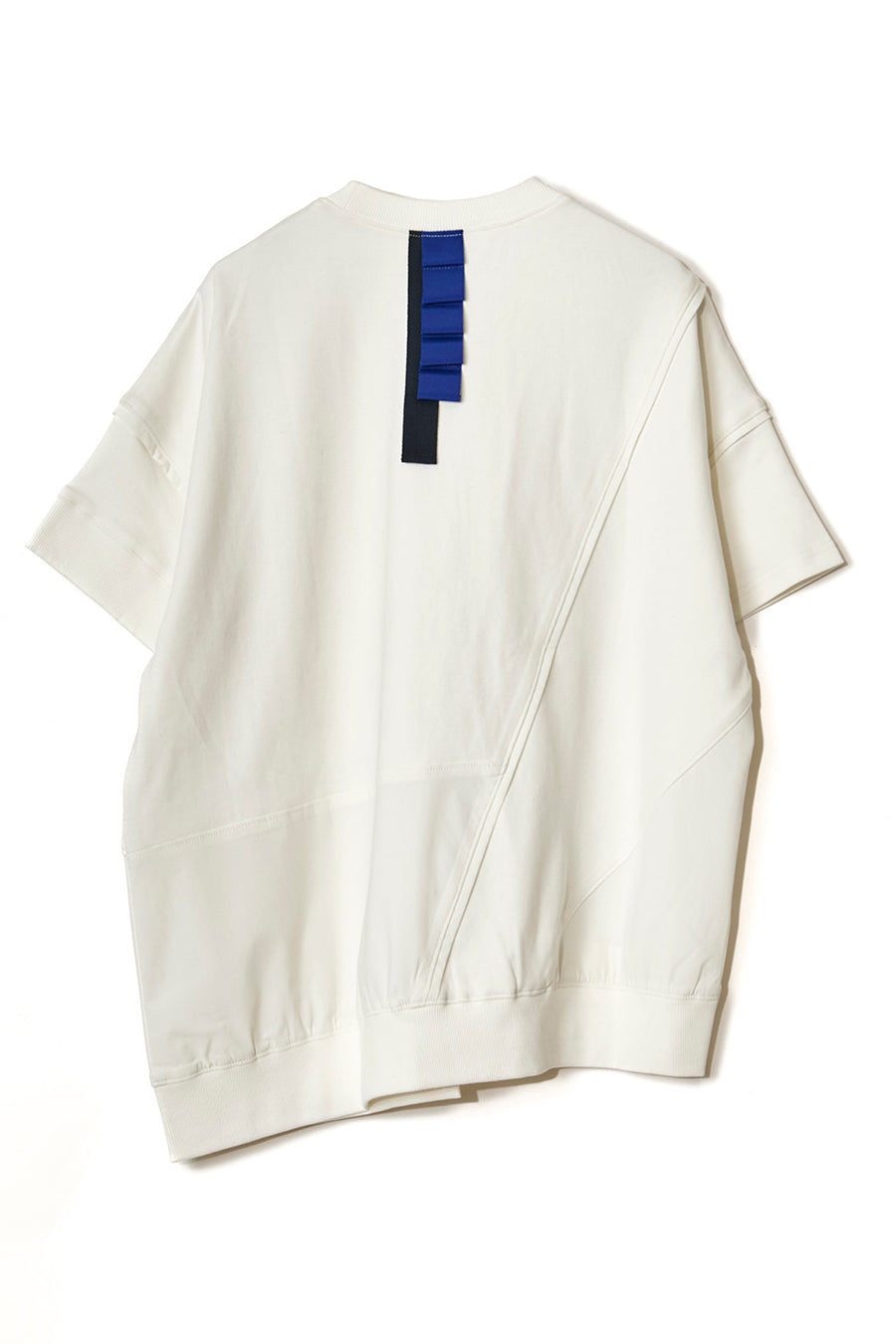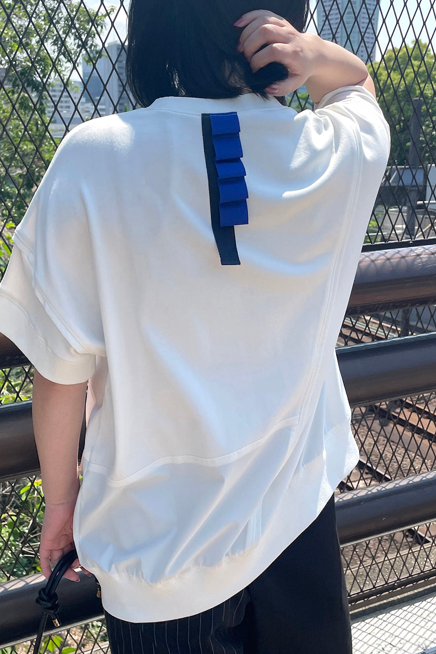 れ、挟みパイピング、PVCのピスネーム、後ろ襟ぐりには配色のテープやタックテープを挟み、遊び心あるカジュアルダウンしたアイテム。オーバーシルエッ
