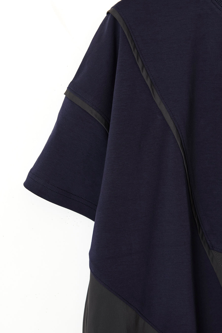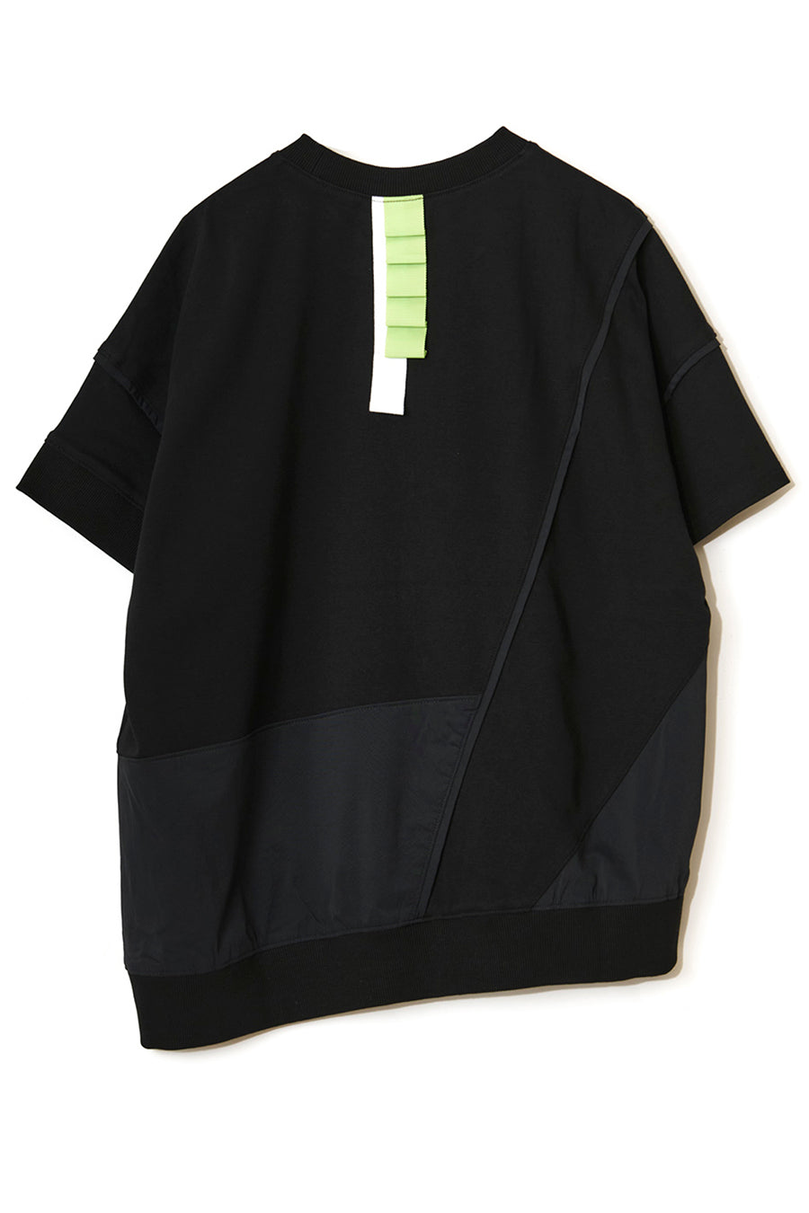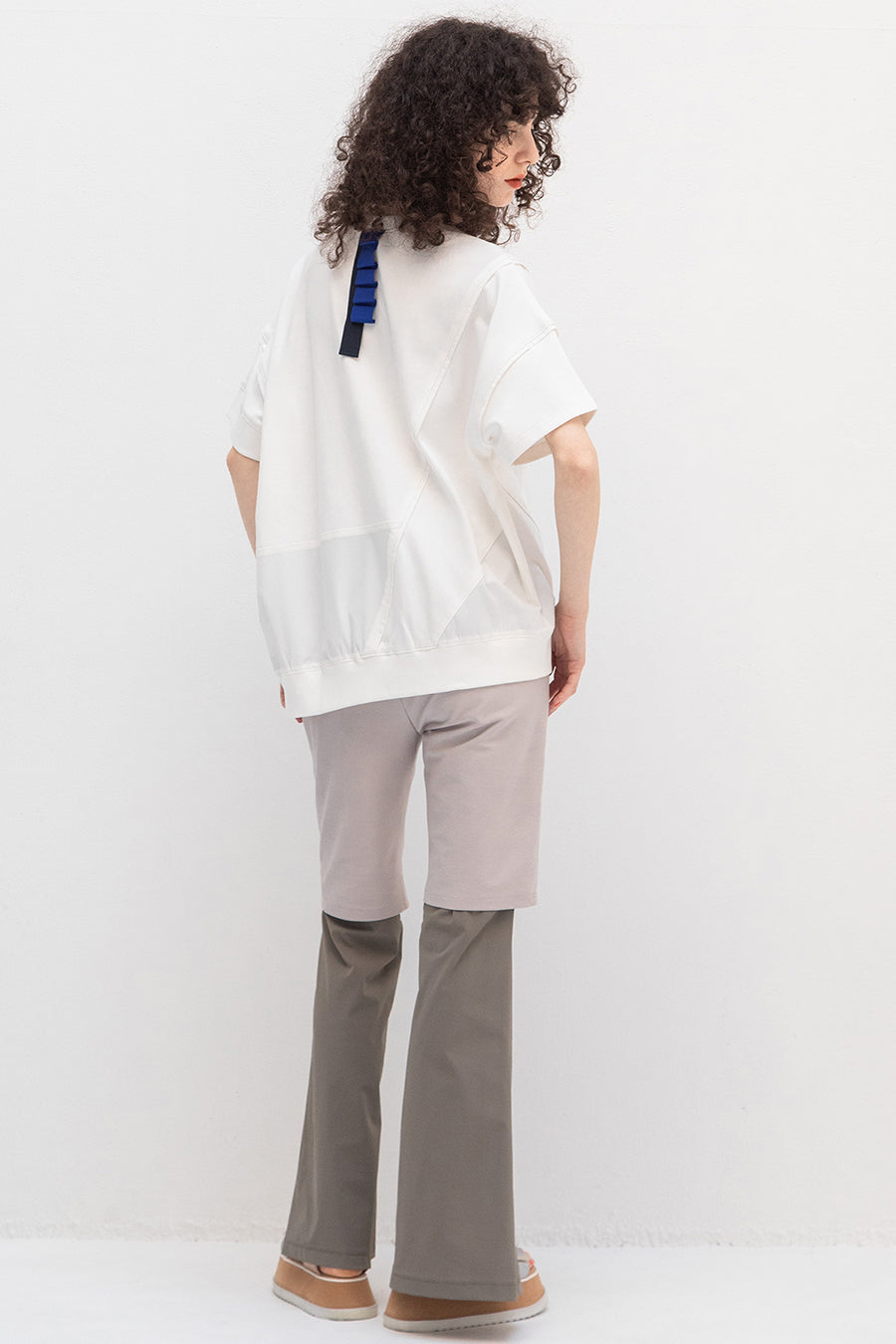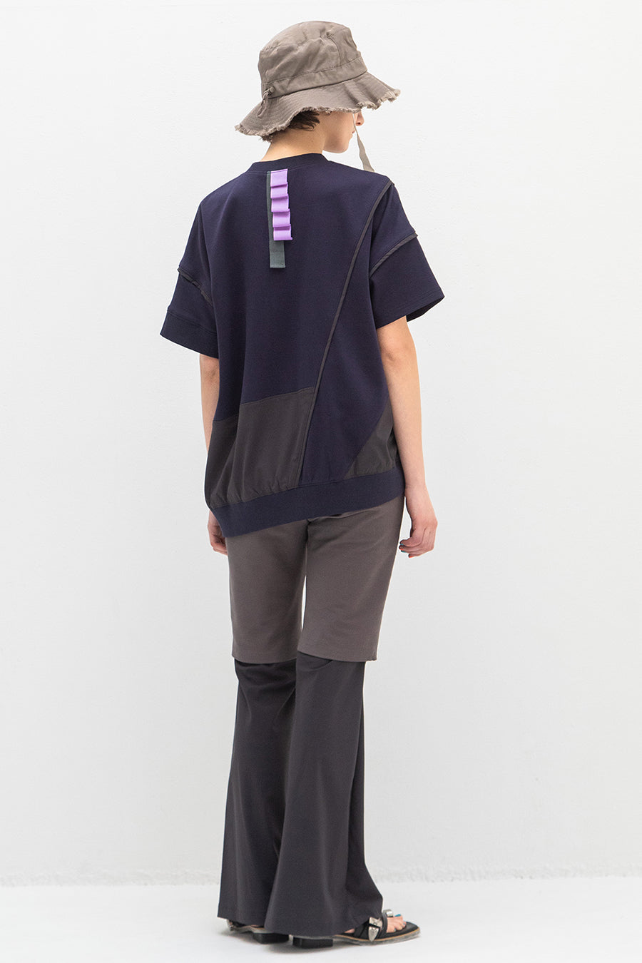 れ、挟みパイピング、PVCのピスネーム、後ろ襟ぐりには配色のテープやタックテープを挟み、遊び心あるカジュアルダウンしたアイテム。オーバーシルエッ