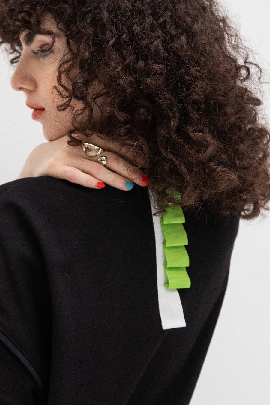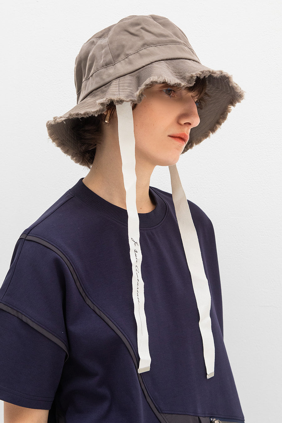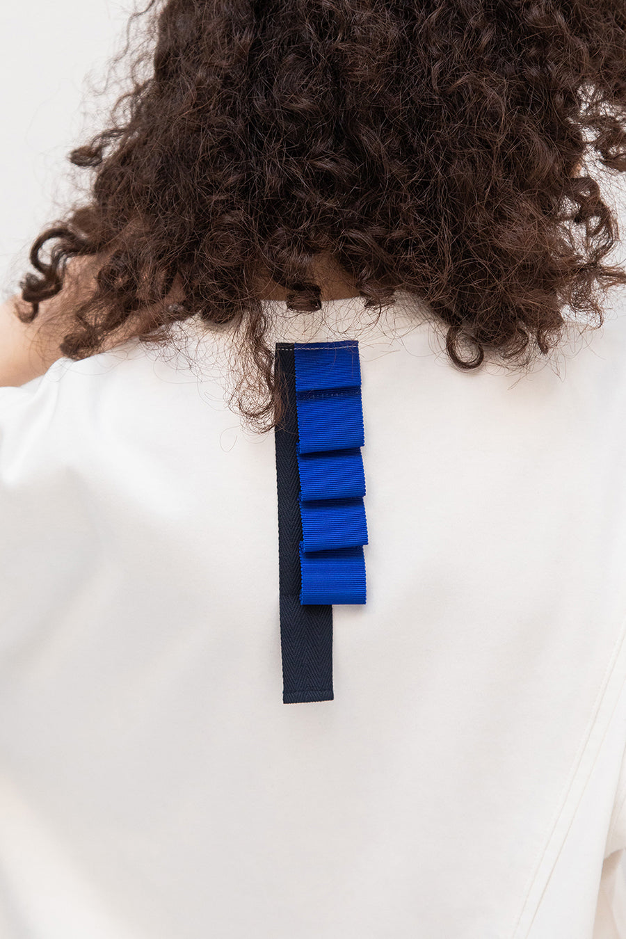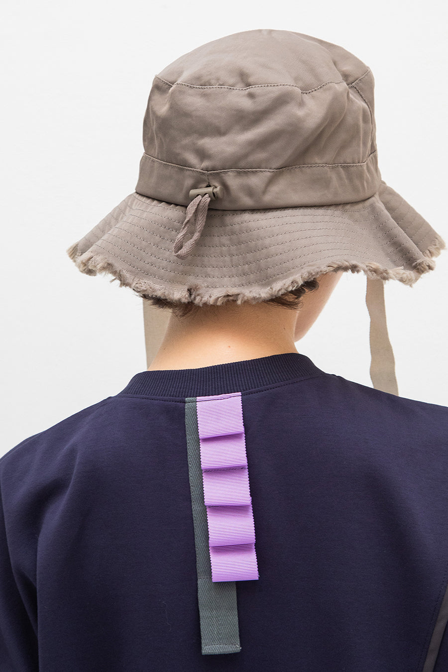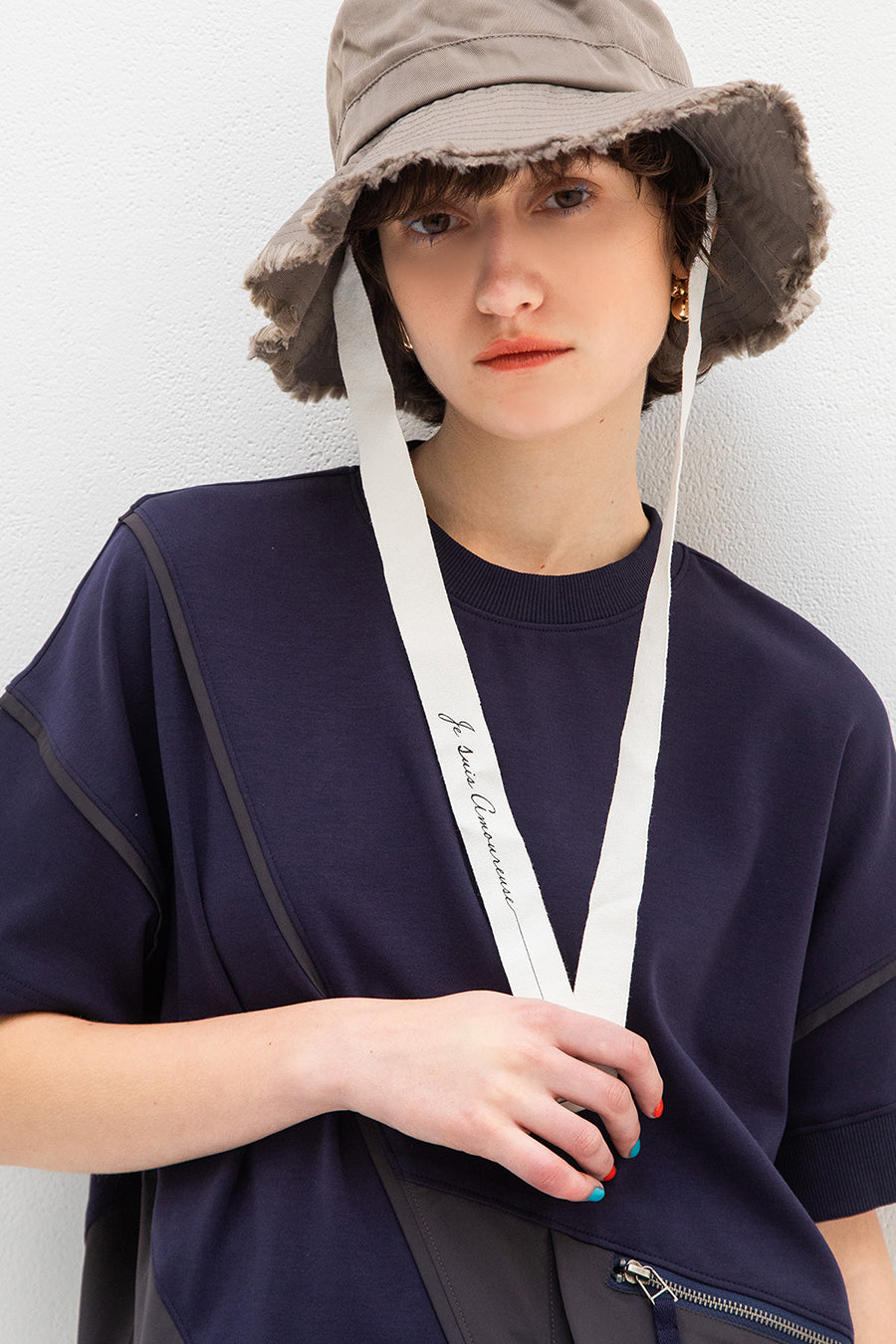 れ、挟みパイピング、PVCのピスネーム、後ろ襟ぐりには配色のテープやタックテープを挟み、遊び心あるカジュアルダウンしたアイテム。オーバーシルエッ
