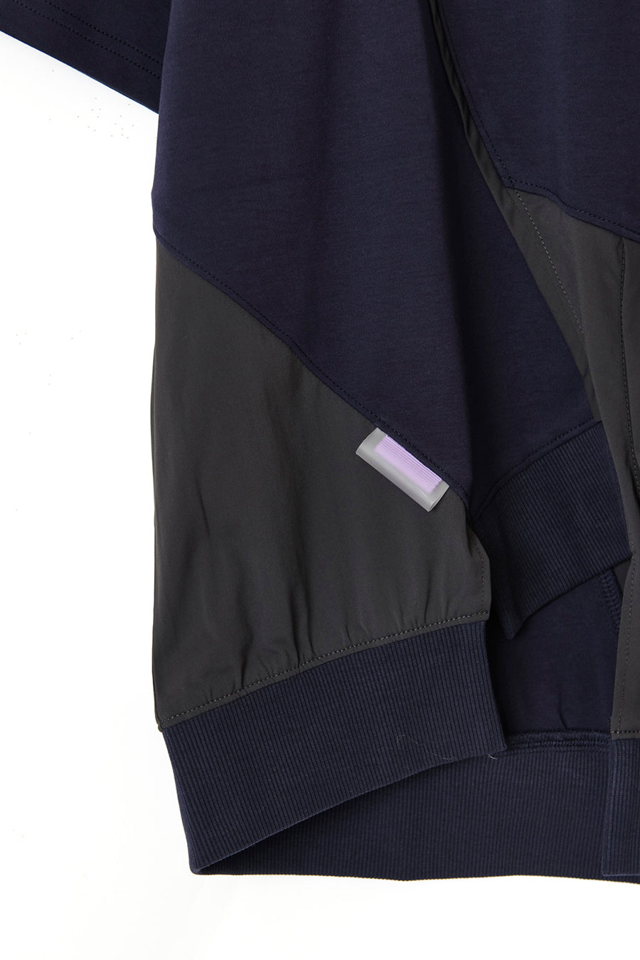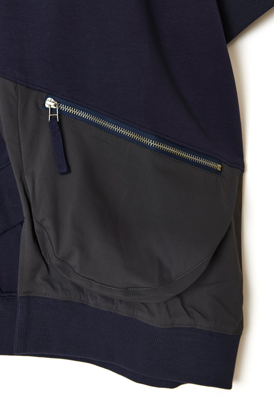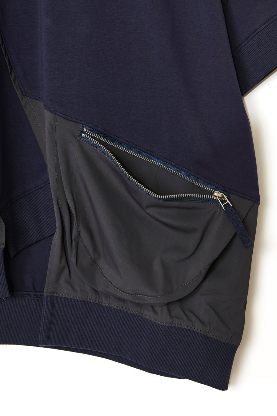 タオルなどが入る大きさで、機能性も抜群。コットンスムースストレッチとナイロンストレッチの異素材コンビネーション。アシンメトリーに斜めに切り替えを入