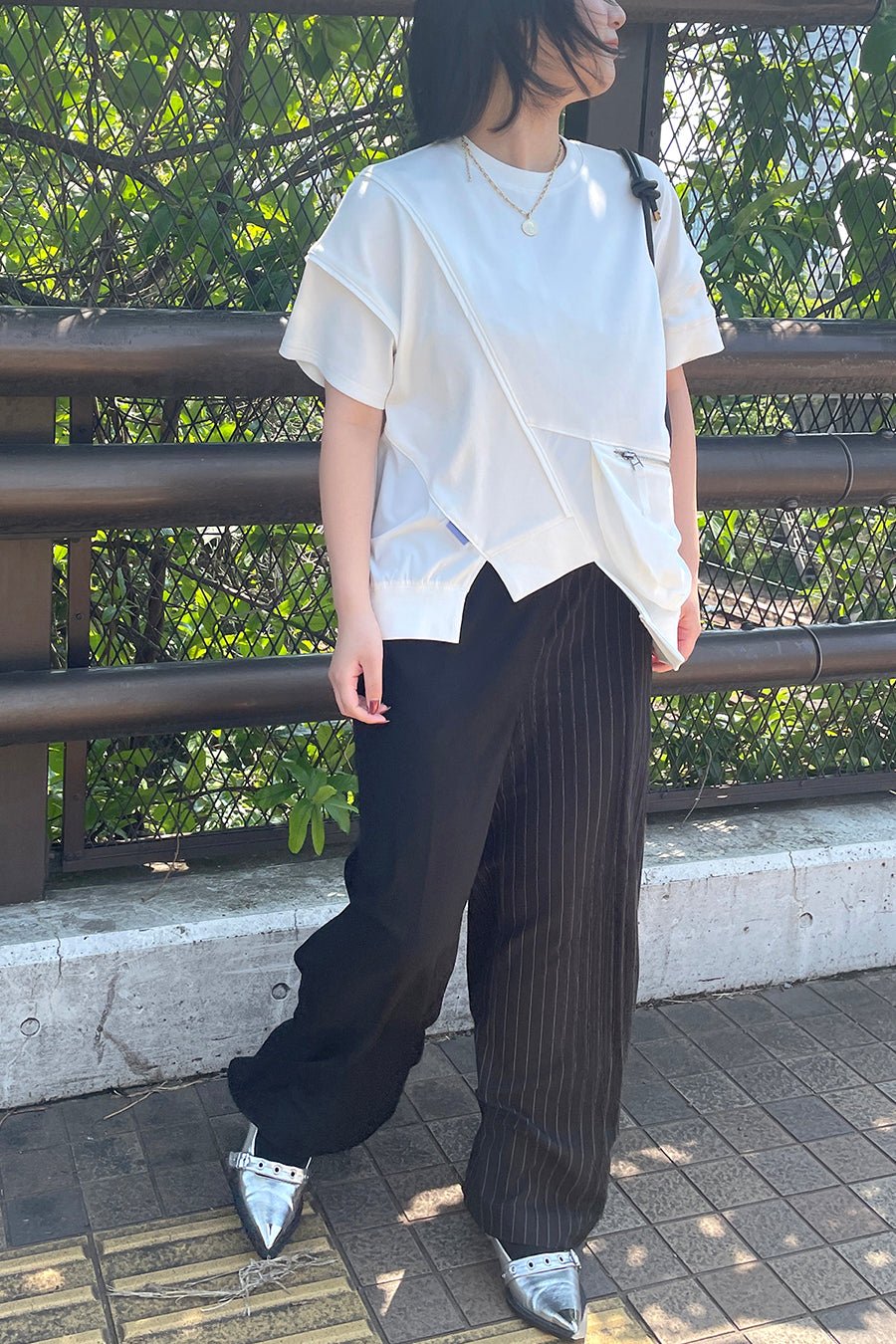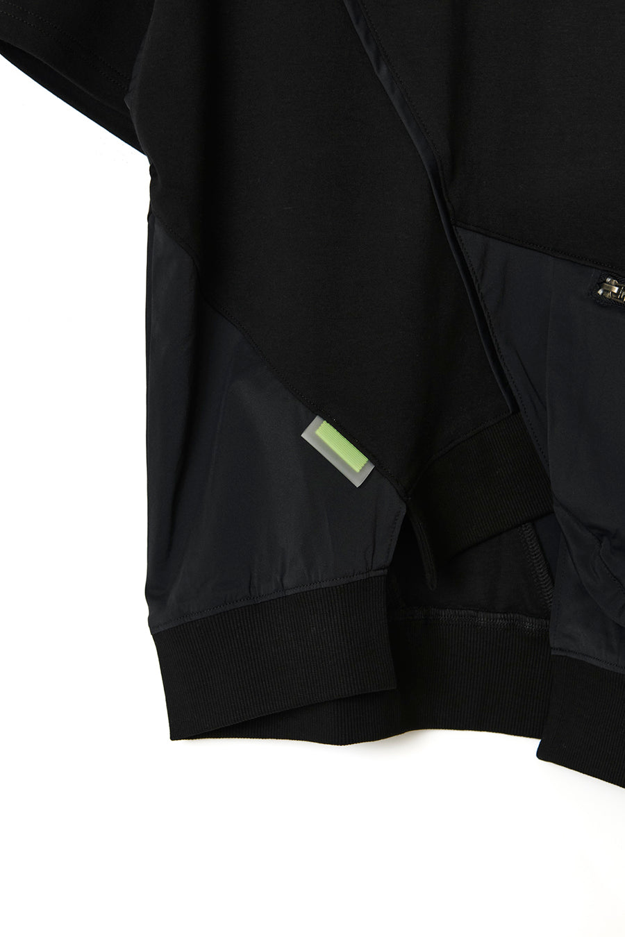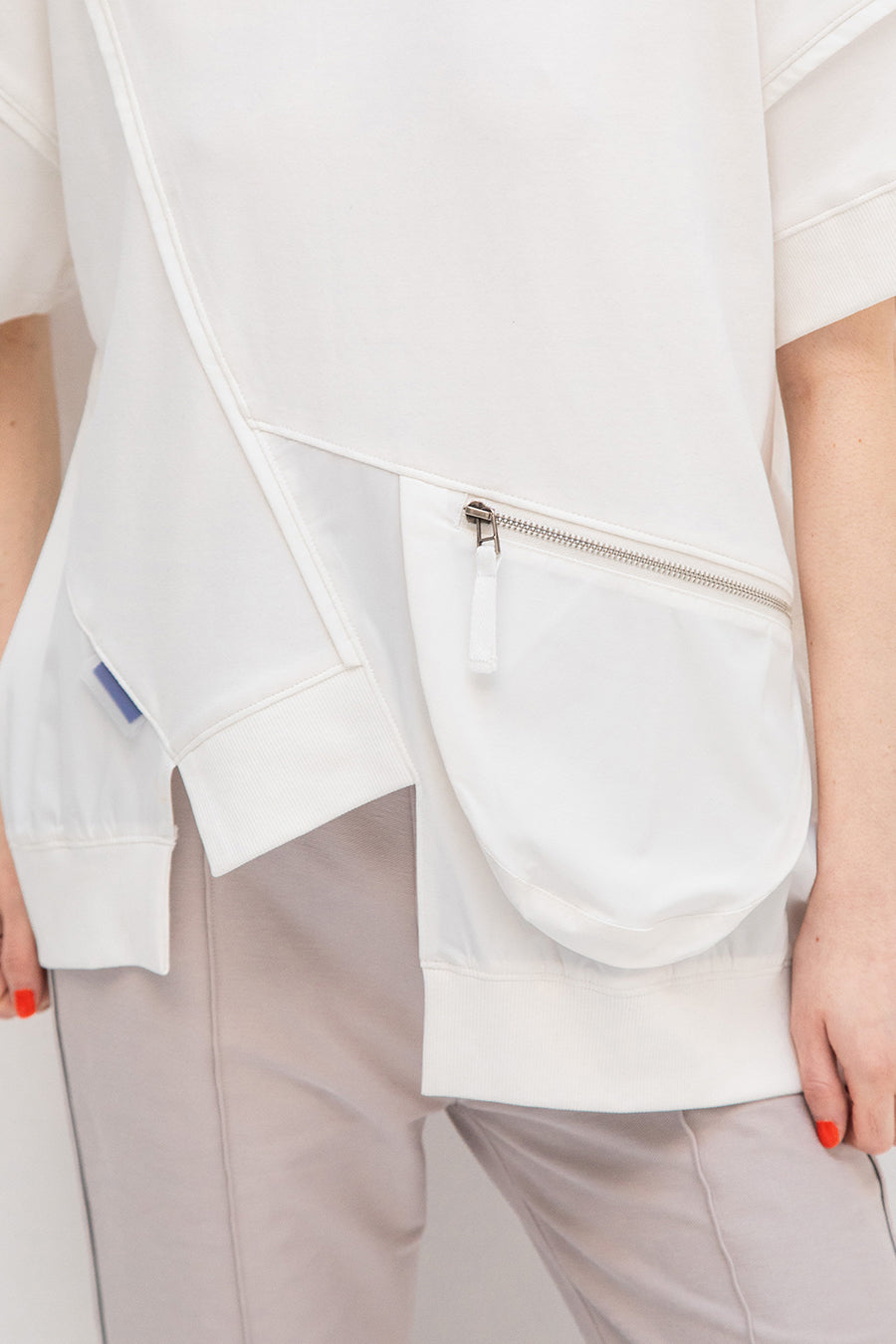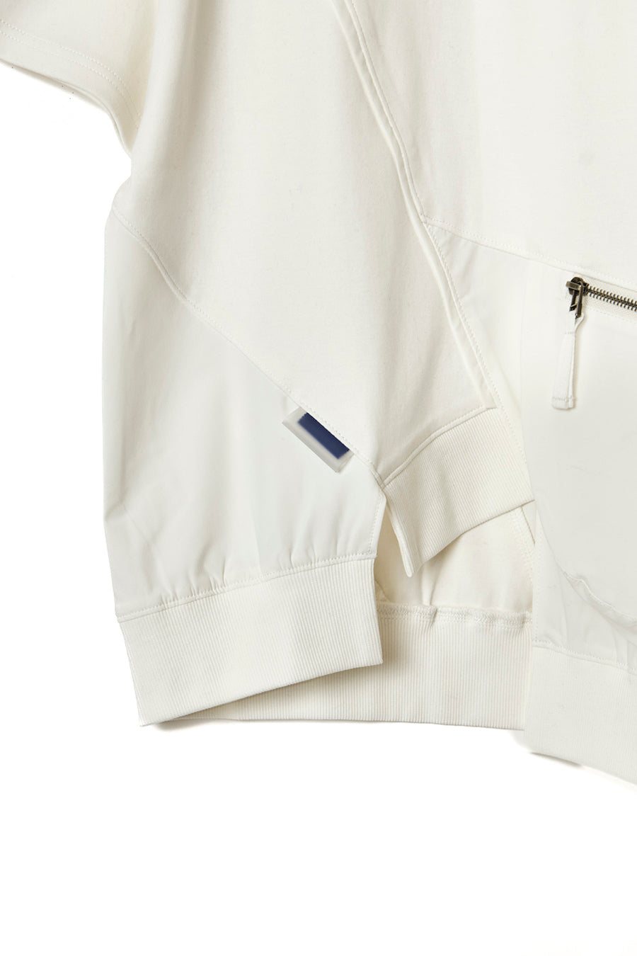タオルなどが入る大きさで、機能性も抜群。コットンスムースストレッチとナイロンストレッチの異素材コンビネーション。アシンメトリーに斜めに切り替えを入