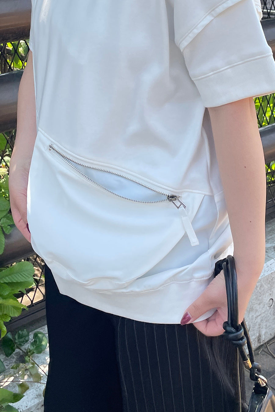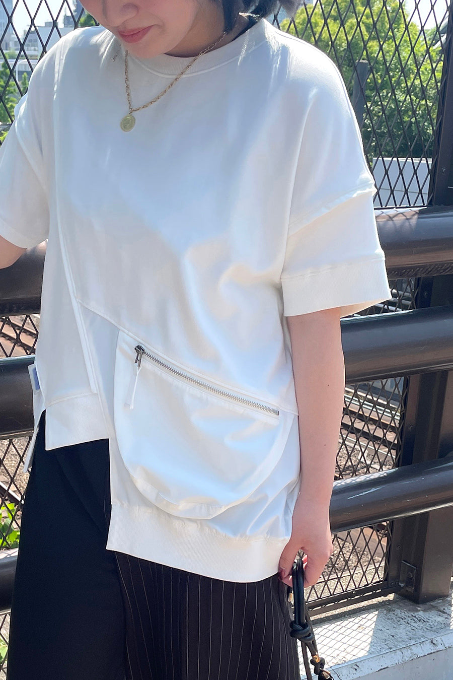 レジャーシーンでも着れるように、ポケットの中身が落ちないファスナー開閉のマチポケットを付けたT-シャツ。ポケットは携帯電話、カード小銭入れ、ハンド