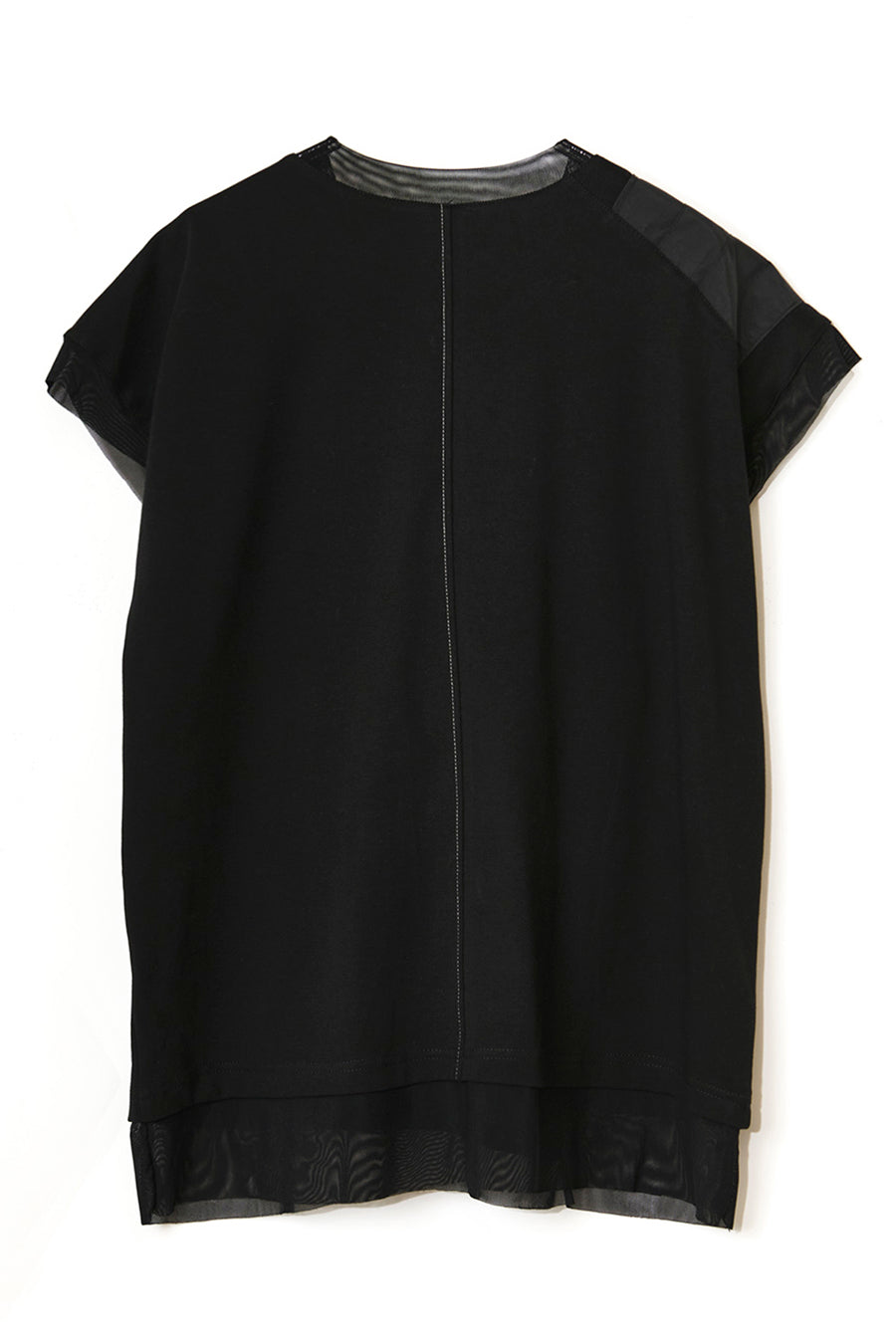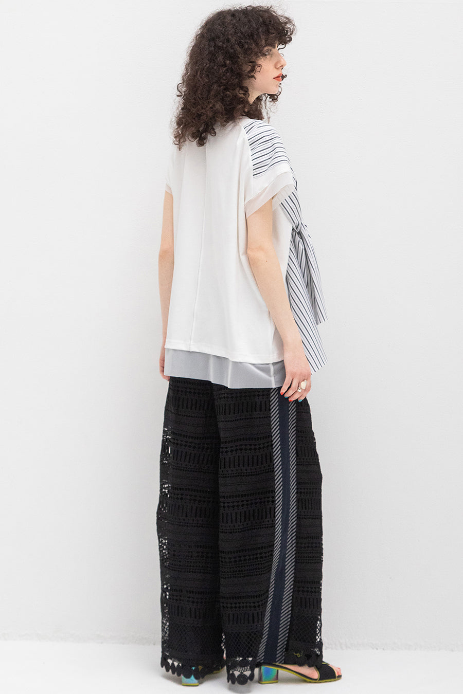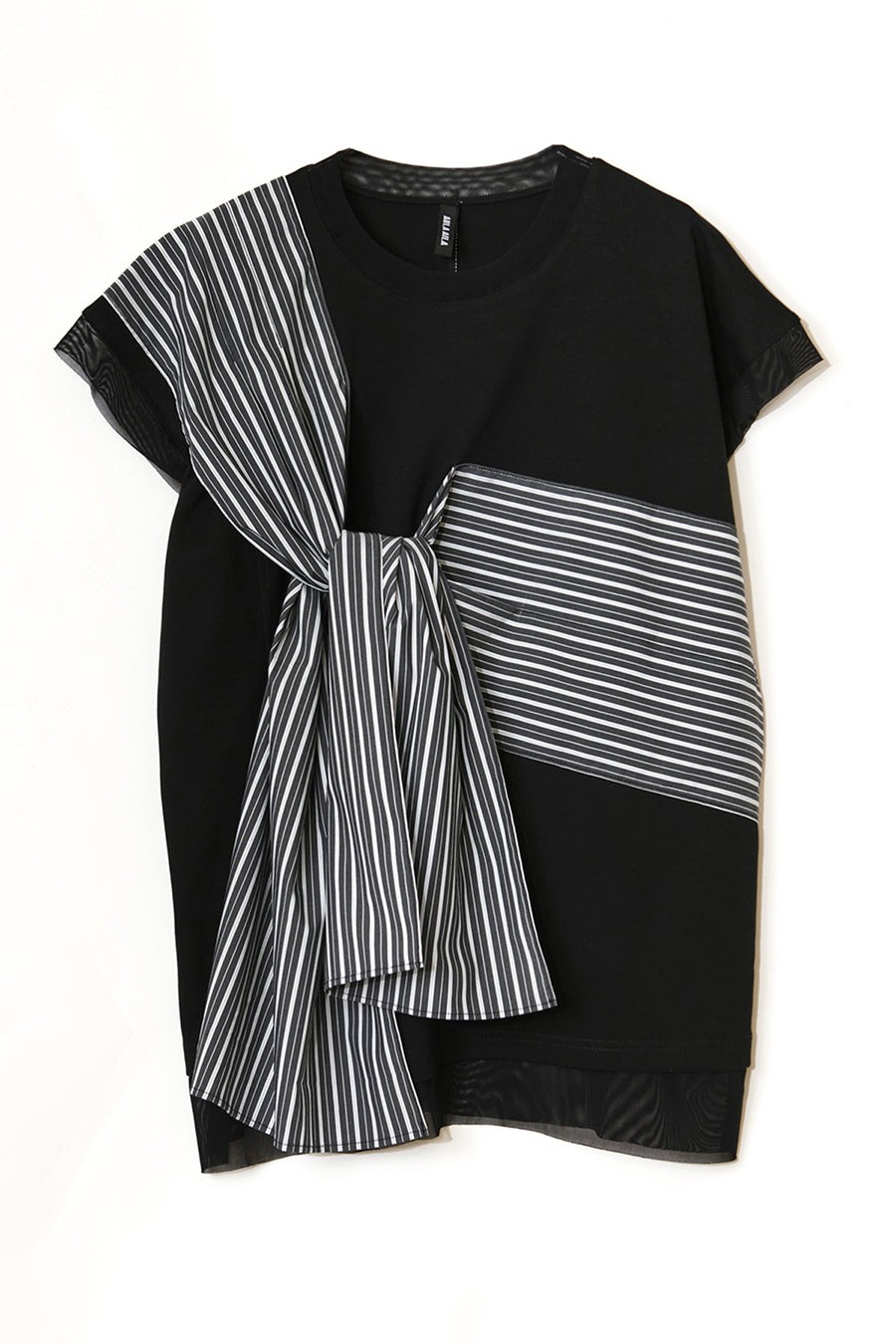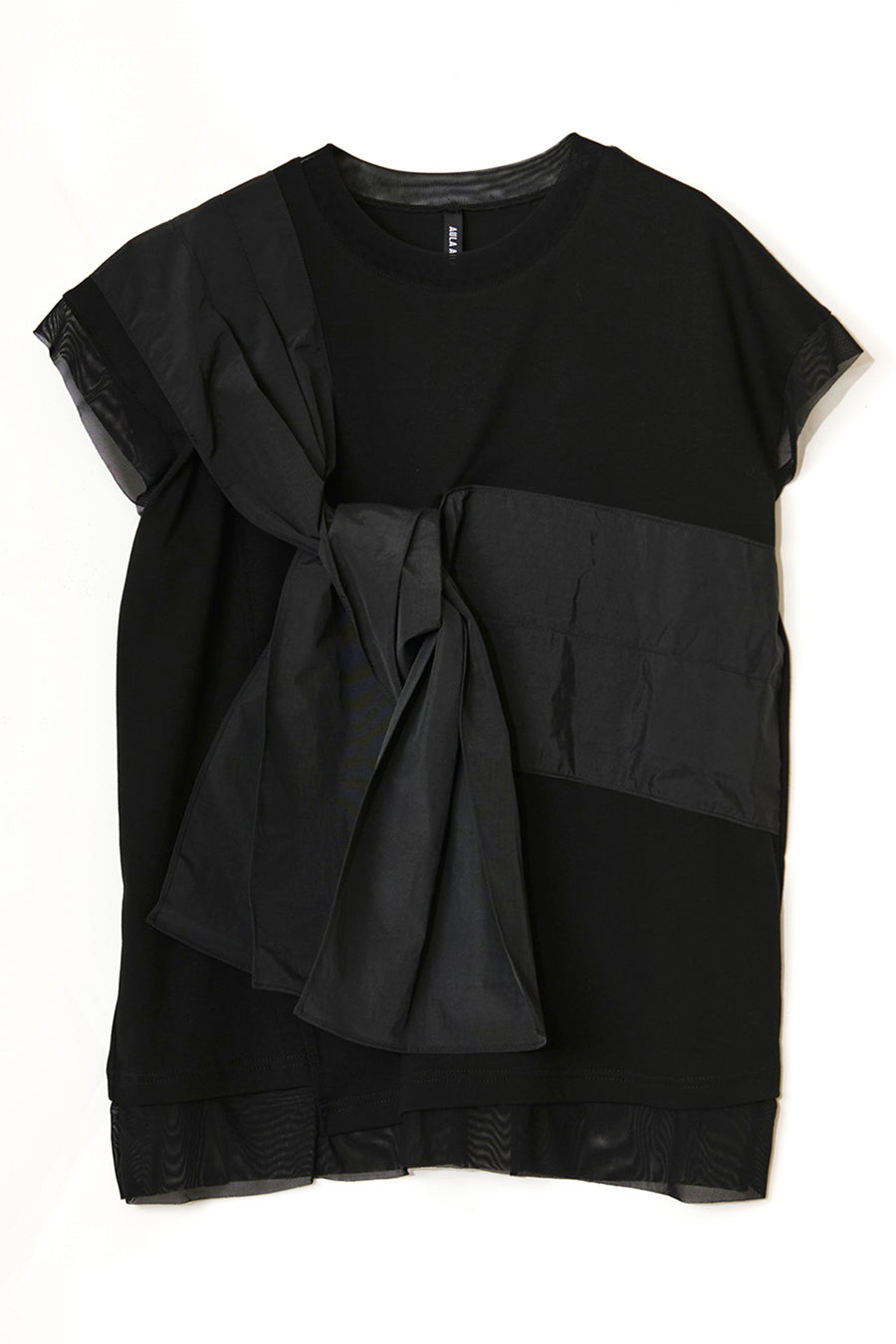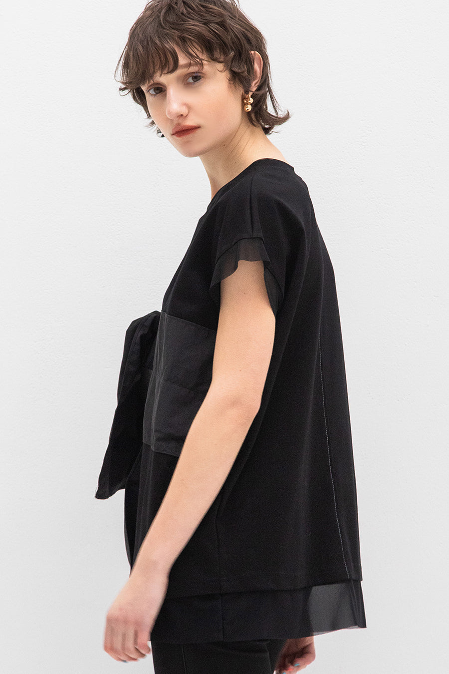 前身頃の右肩から左身頃脇に別布のリボンつけ、結ぶと大きなリボンが目を惹くTシャツ。襟ぐり、袖口、裾からは、チュールが覗きシアー感が涼し気な夏