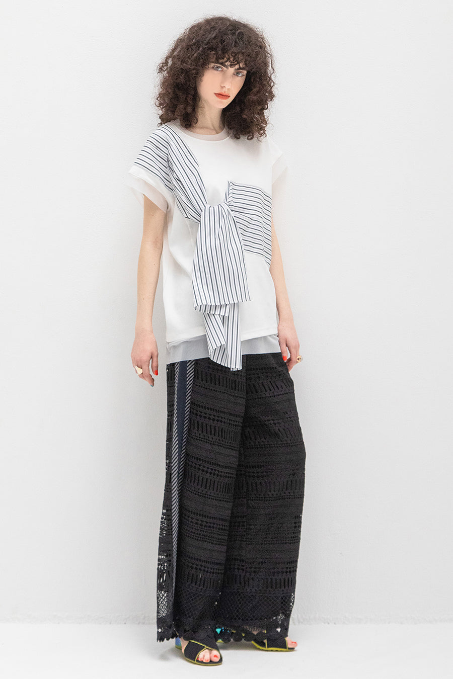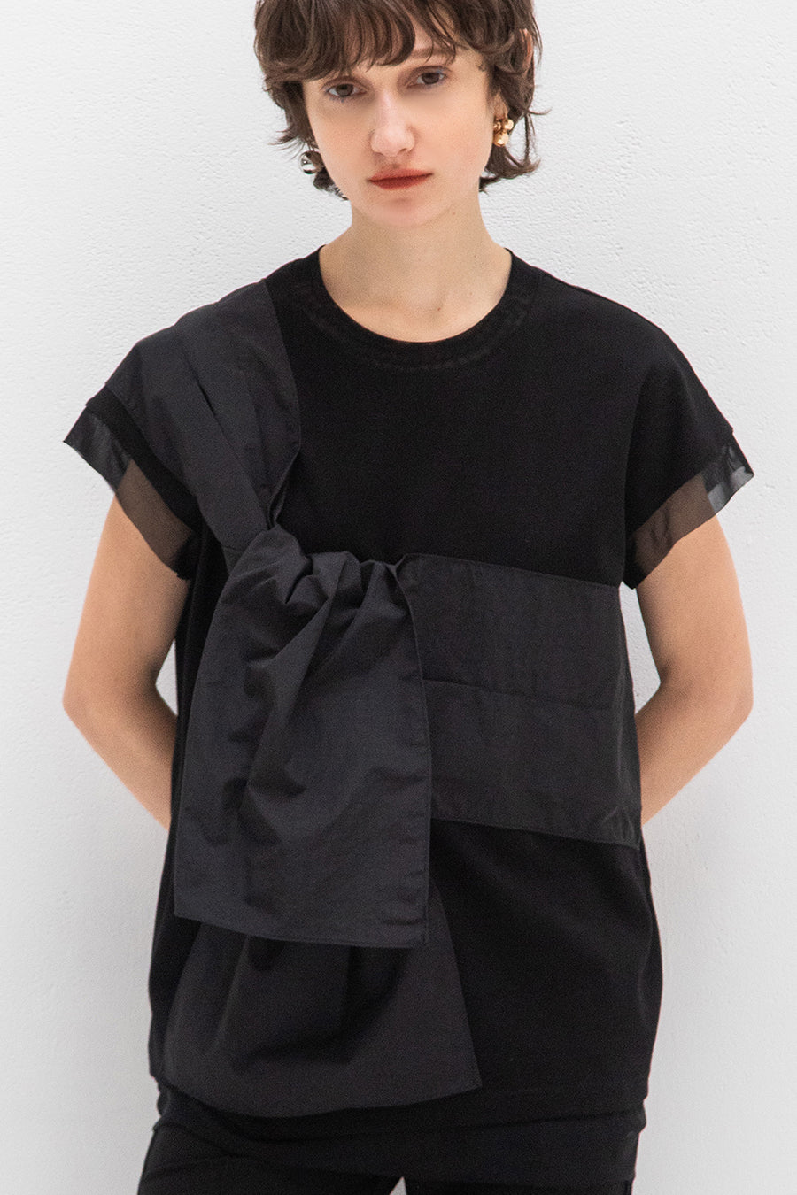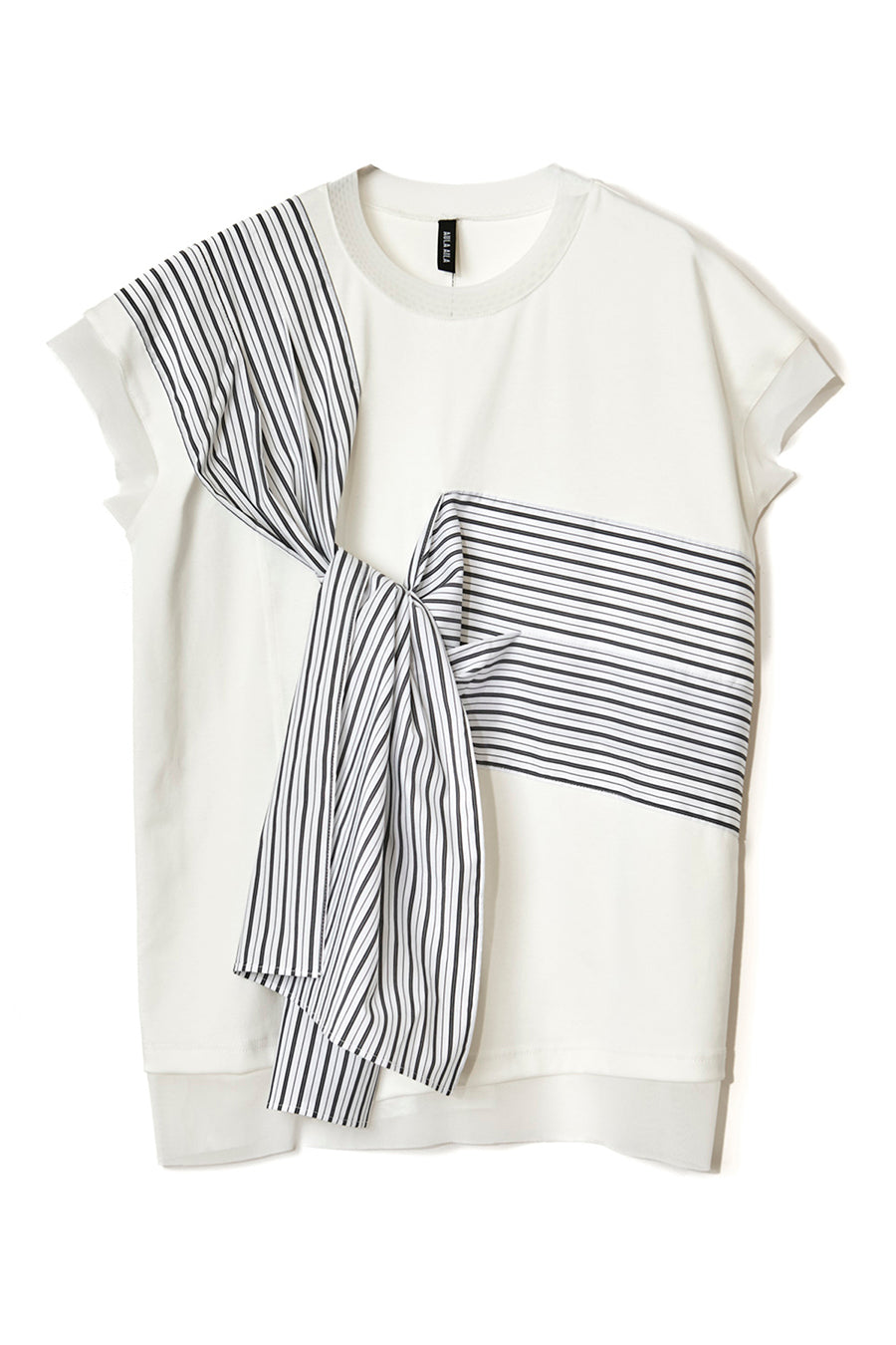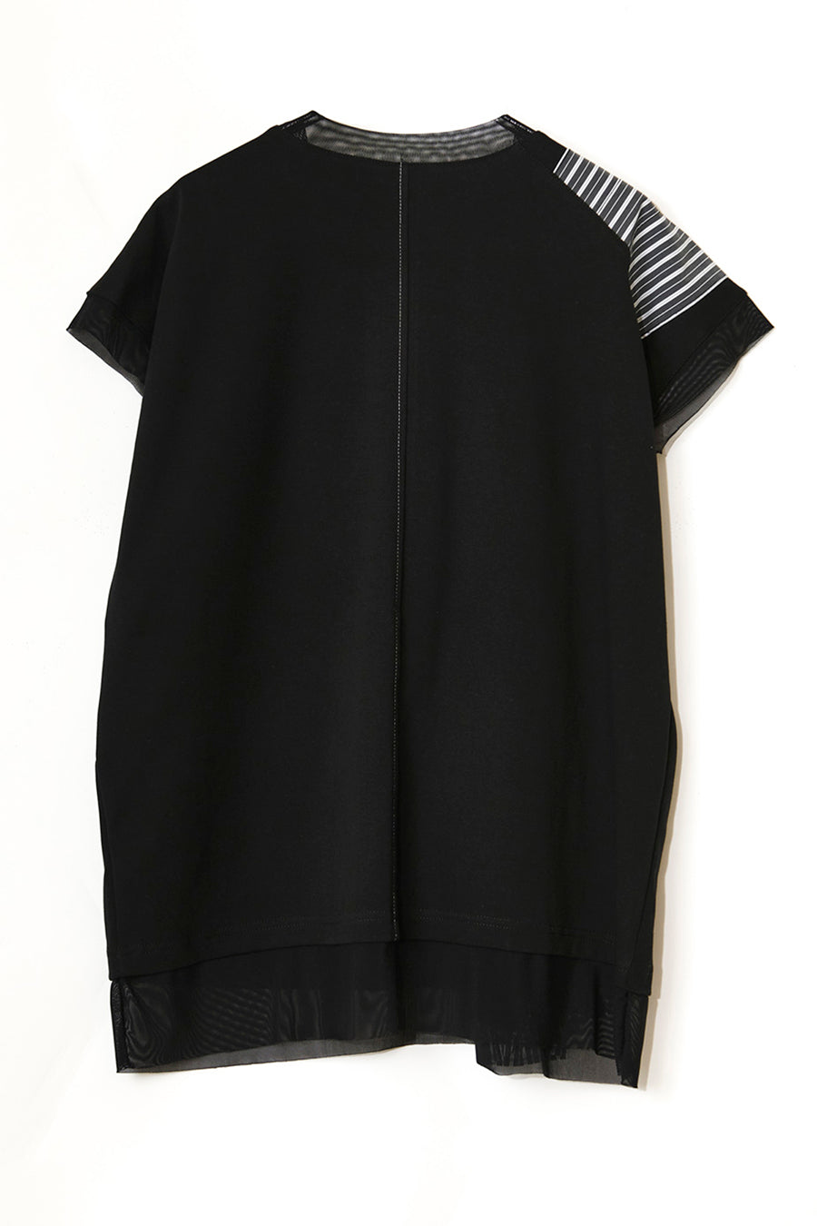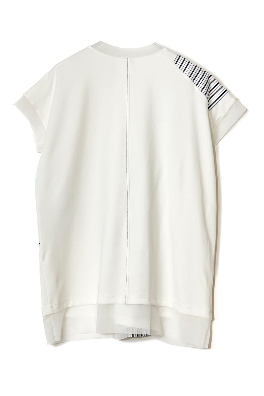 前身頃の右肩から左身頃脇に別布のリボンつけ、結ぶと大きなリボンが目を惹くTシャツ。襟ぐり、袖口、裾からは、チュールが覗きシアー感が涼し気な夏