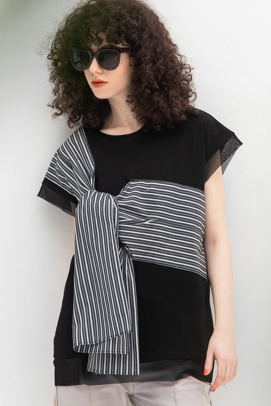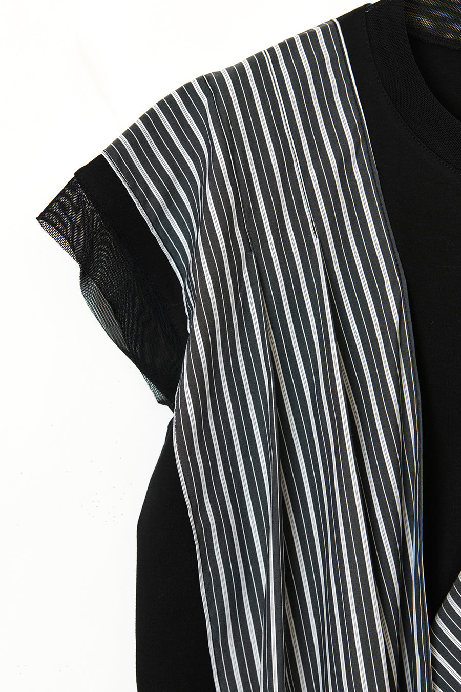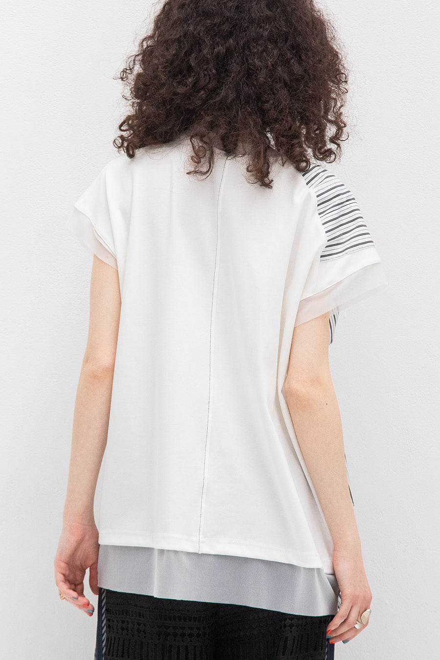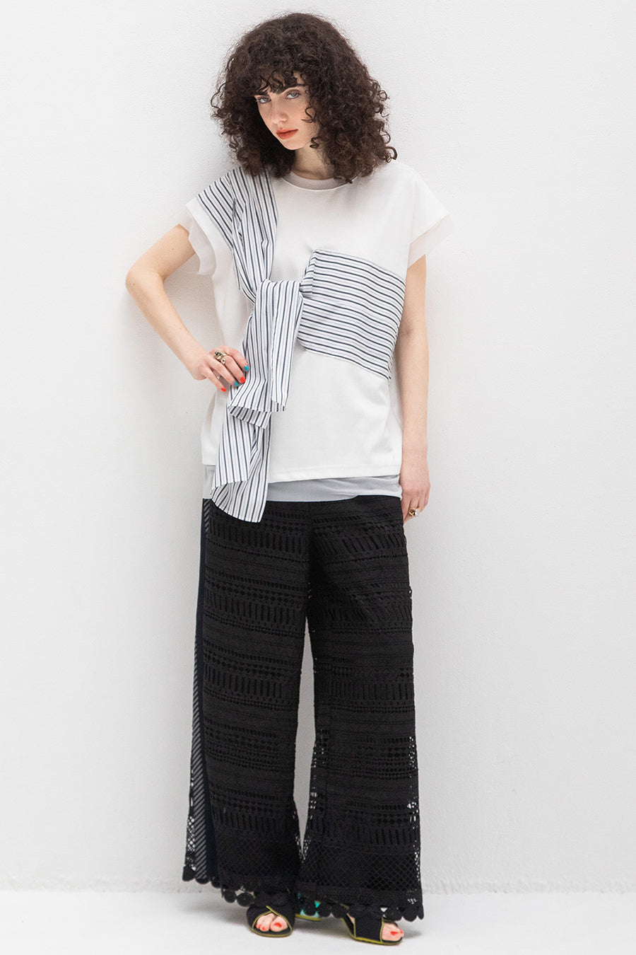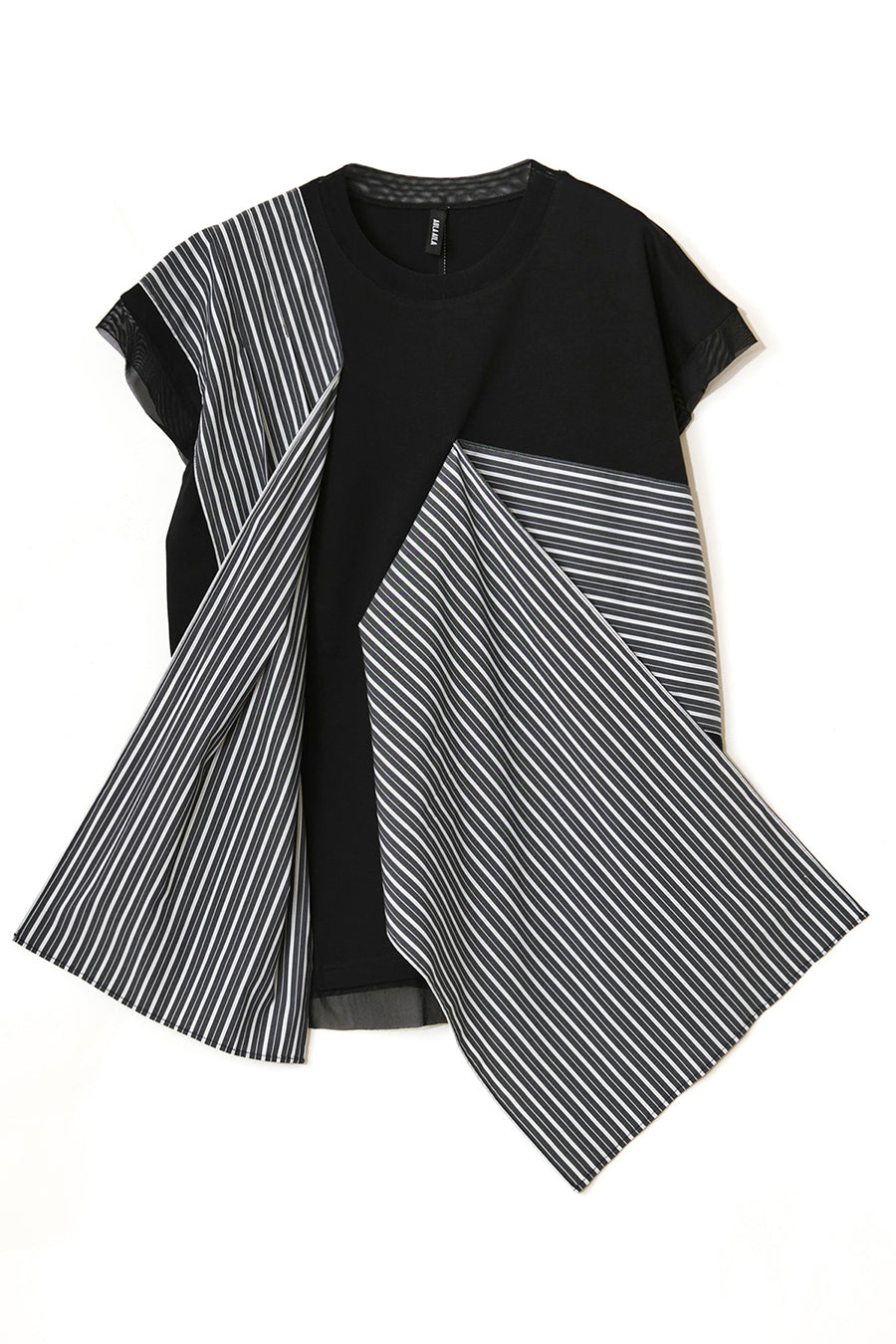 前身頃の右肩から左身頃脇に別布のリボンつけ、結ぶと大きなリボンが目を惹くTシャツ。襟ぐり、袖口、裾からは、チュールが覗きシアー感が涼し気な夏