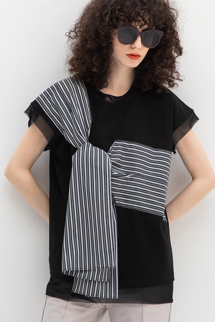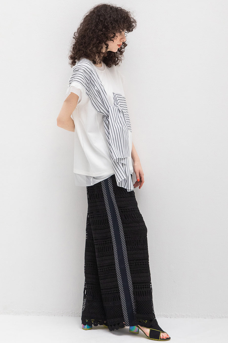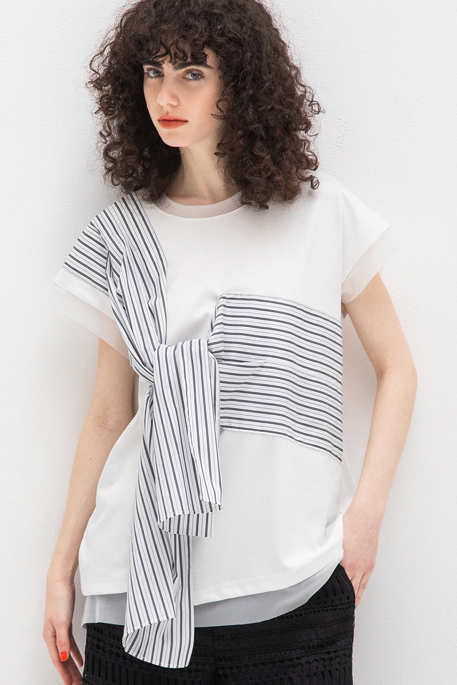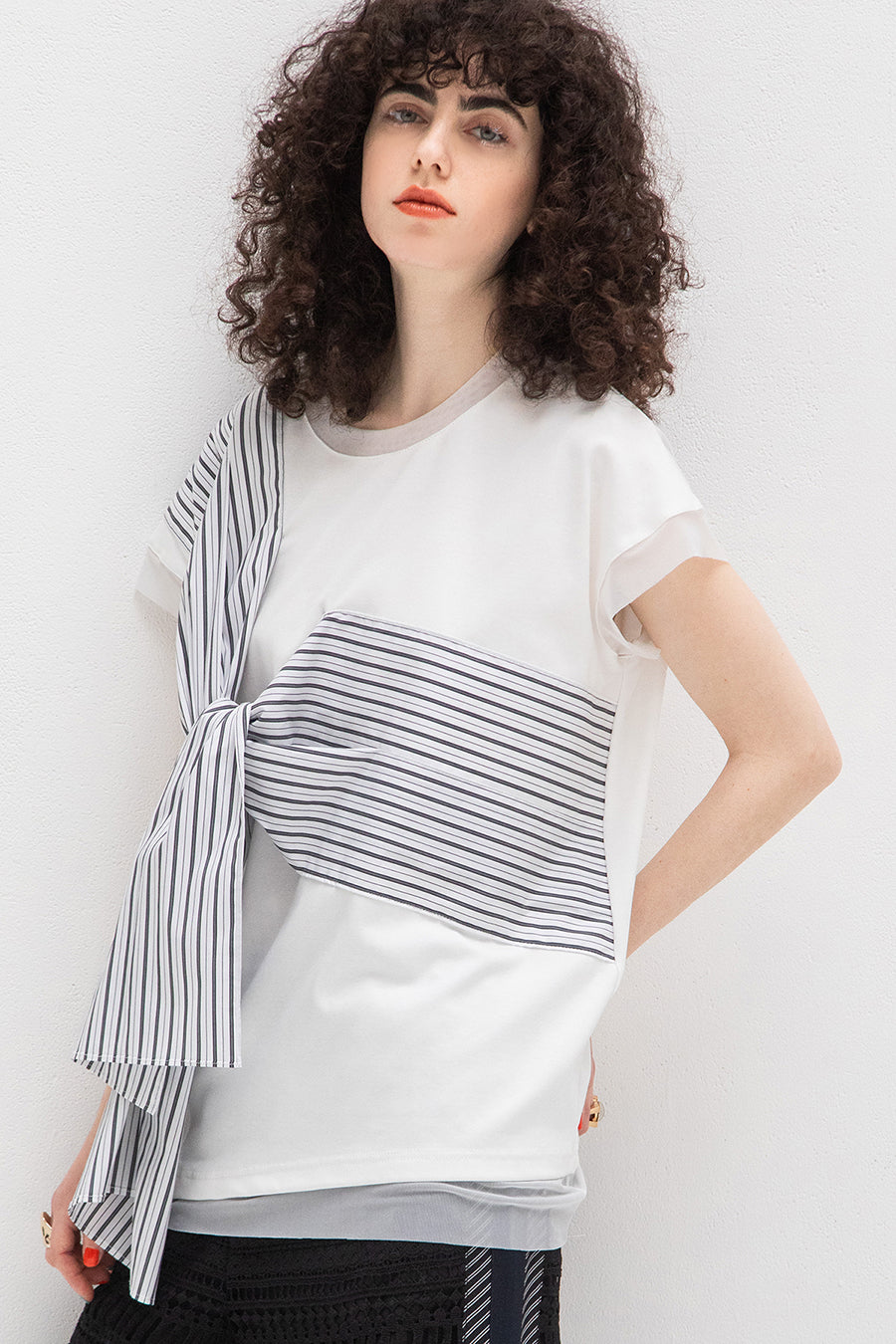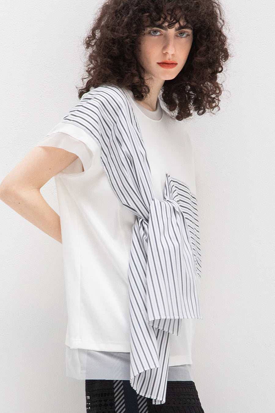 前身頃の右肩から左身頃脇に別布のリボンつけ、結ぶと大きなリボンが目を惹くTシャツ。襟ぐり、袖口、裾からは、チュールが覗きシアー感が涼し気な夏