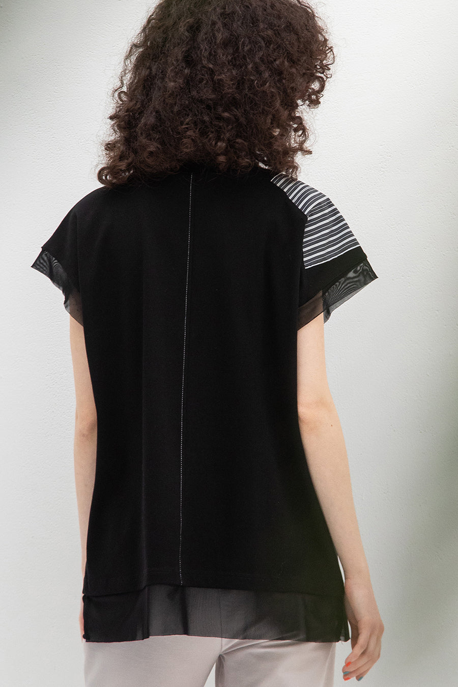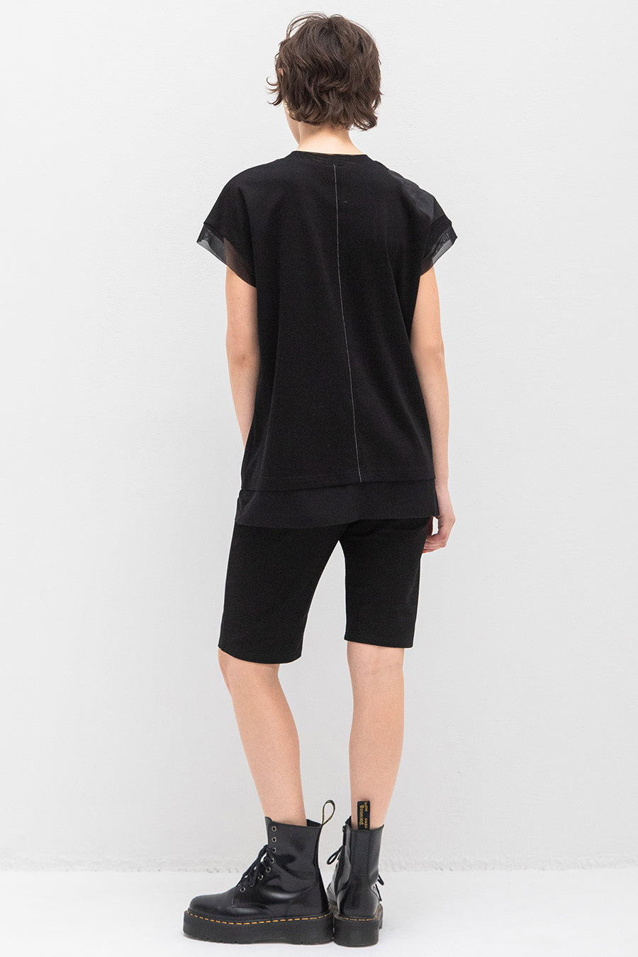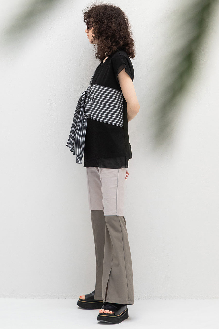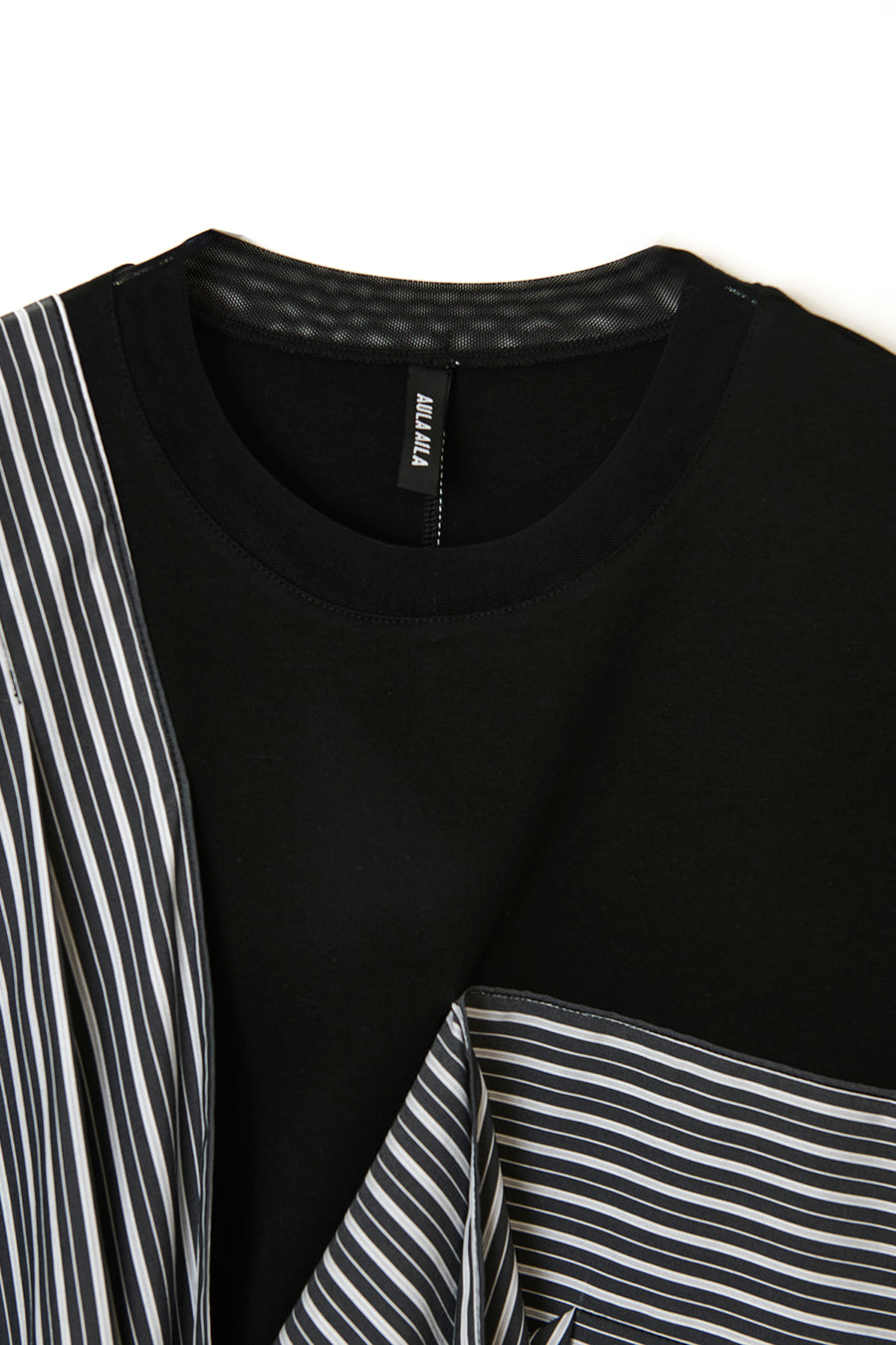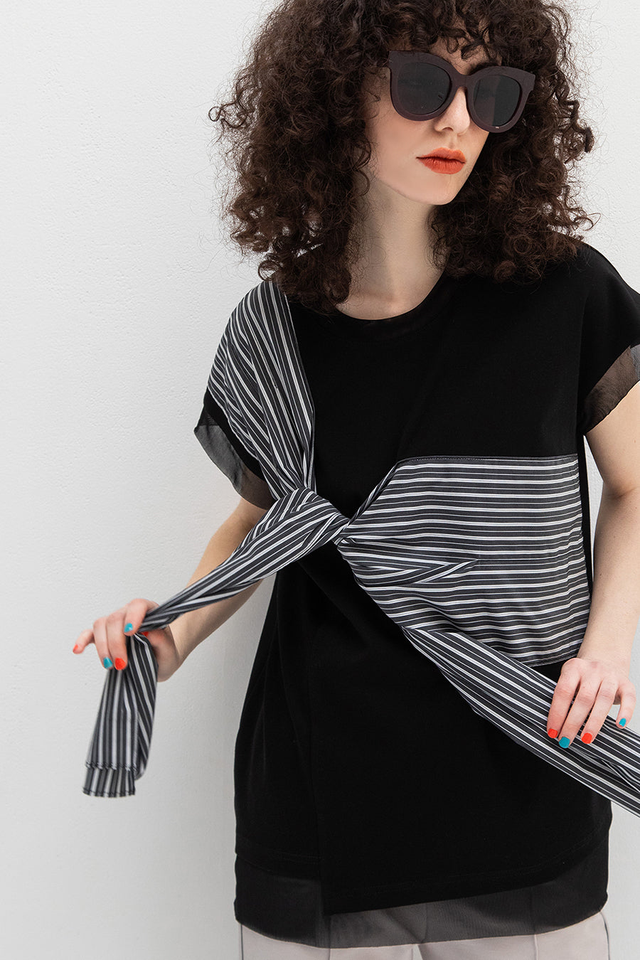 前身頃の右肩から左身頃脇に別布のリボンつけ、結ぶと大きなリボンが目を惹くTシャツ。襟ぐり、袖口、裾からは、チュールが覗きシアー感が涼し気な夏