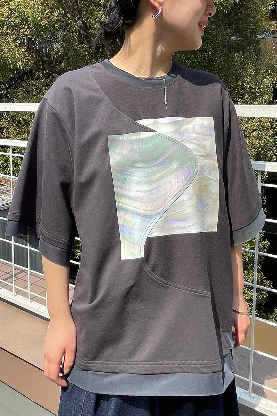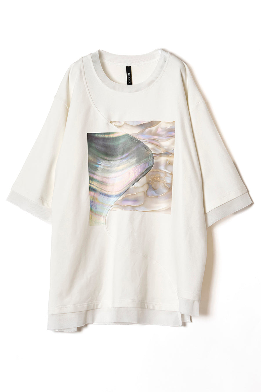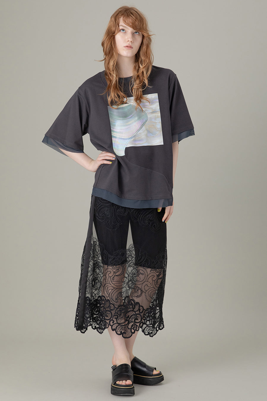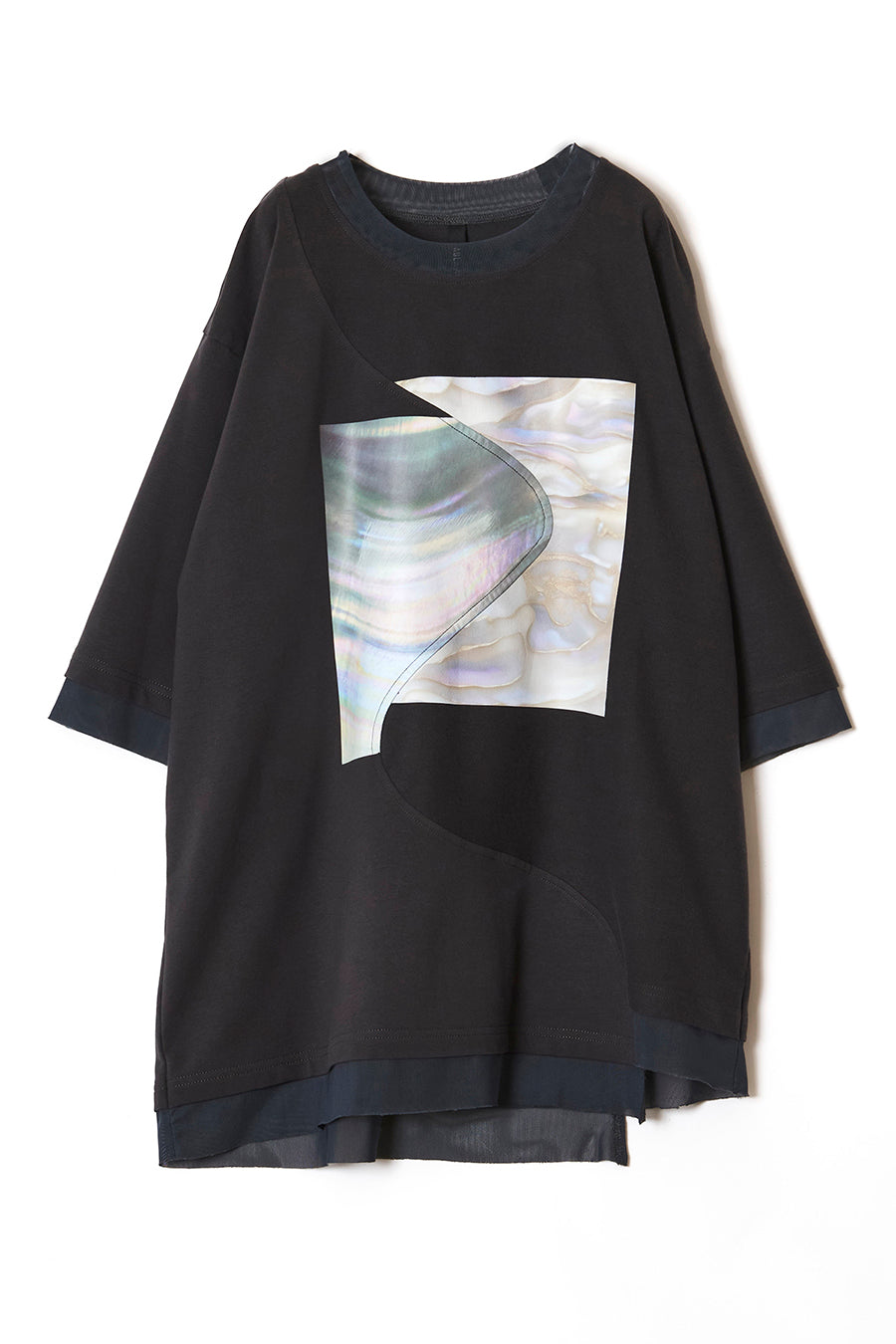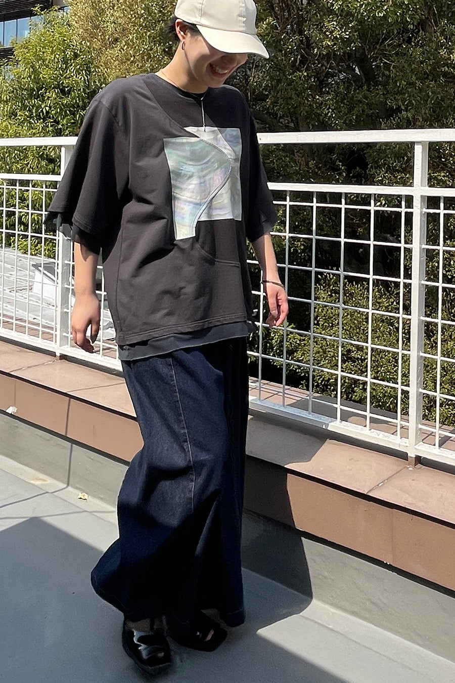 毎シーズン好評なプリントTは、今シーズンは2つのシェルプリントをコンビネーション。フロントは左右にカービーな切り替えを入れ、グラフィックもそれに合わせて、切り替えた仕上がりに。肌触り、伸縮性が良く、シワにもなりにくいストレッチ裏毛を採用。右と左で生地の裏表も切り替えて使用し、風合いに変化を出した1枚。オーバーサイズのゆるっとしたシルエットで、裾と太めの5分袖の袖口からはチュールが覗く涼しげなデザイン。