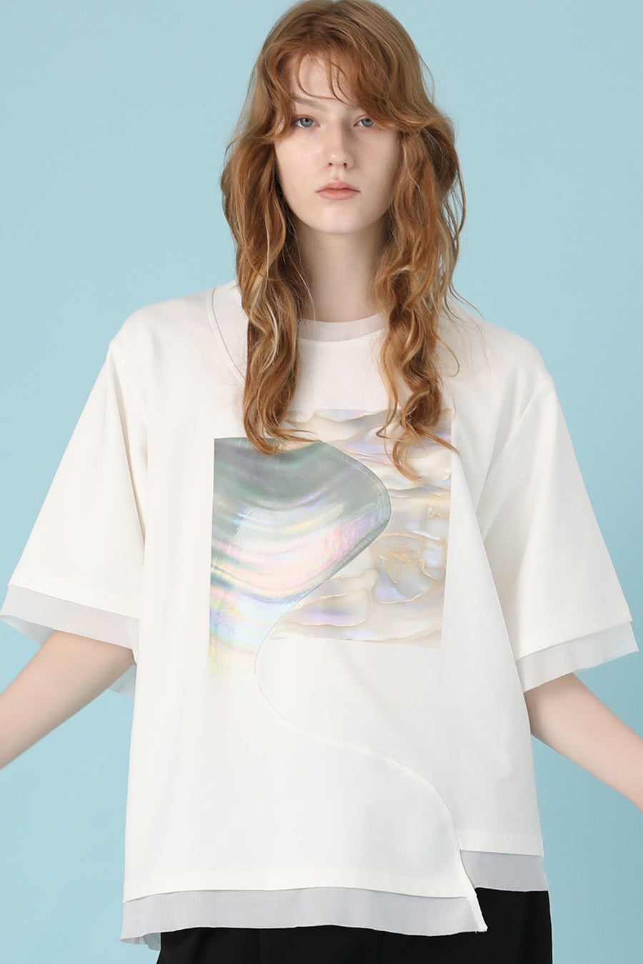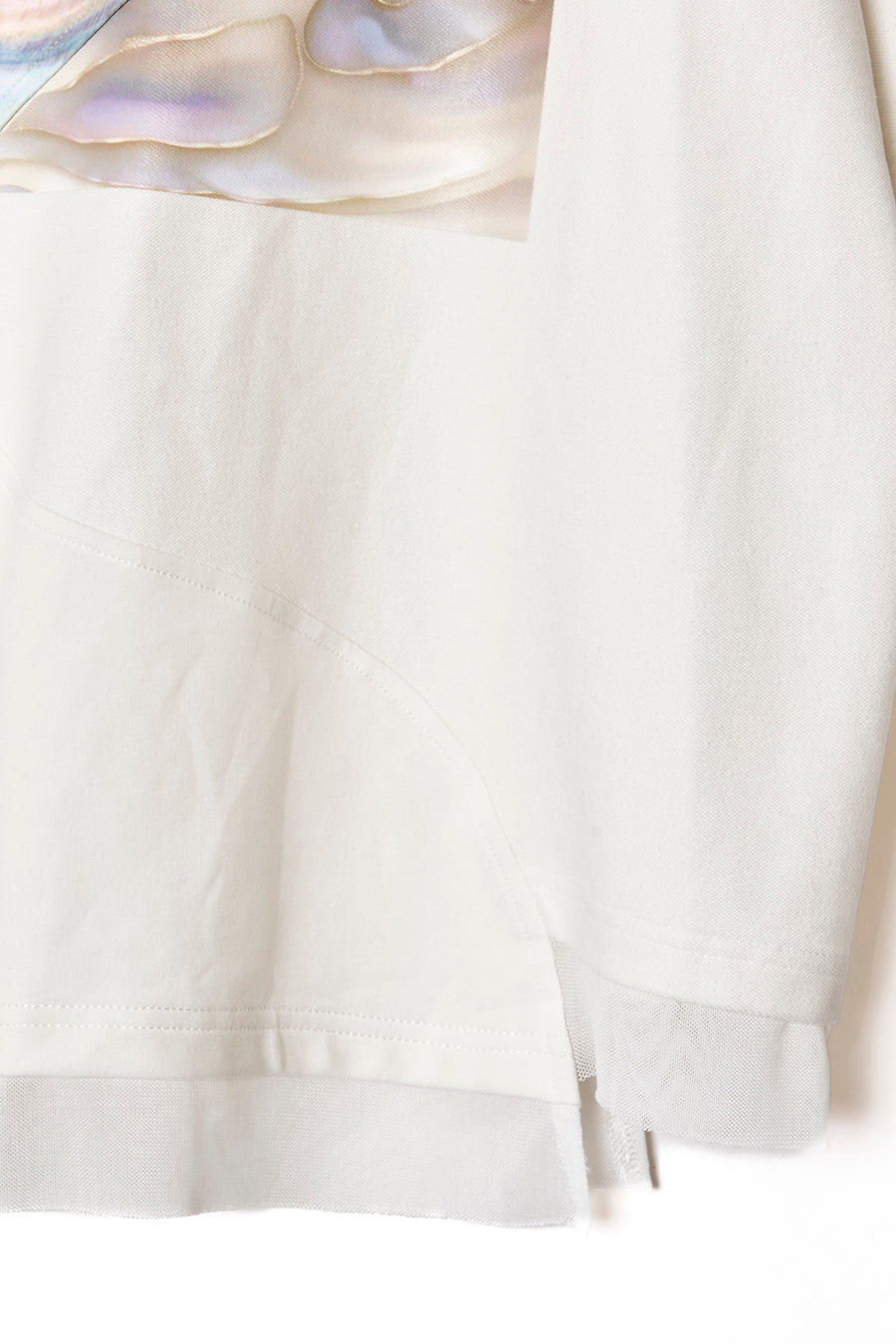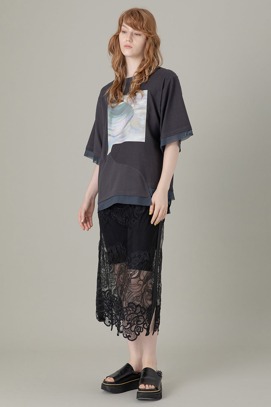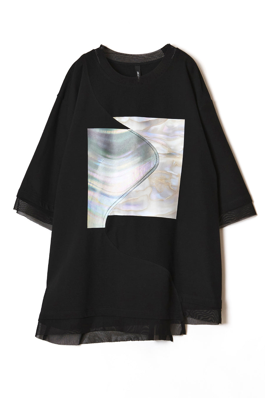 毎シーズン好評なプリントTは、今シーズンは2つのシェルプリントをコンビネーション。フロントは左右にカービーな切り替えを入れ、グラフィックもそれに合わせて、切り替えた仕上がりに。肌触り、伸縮性が良く、シワにもなりにくいストレッチ裏毛を採用。右と左で生地の裏表も切り替えて使用し、風合いに変化を出した1枚。オーバーサイズのゆるっとしたシルエットで、裾と太めの5分袖の袖口からはチュールが覗く涼しげなデザイン。