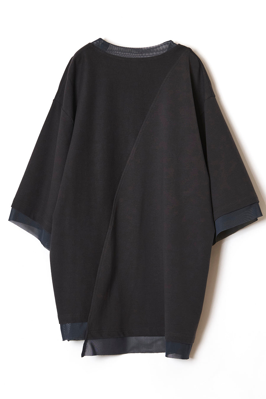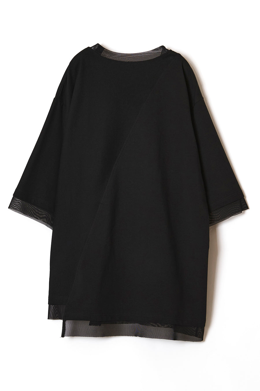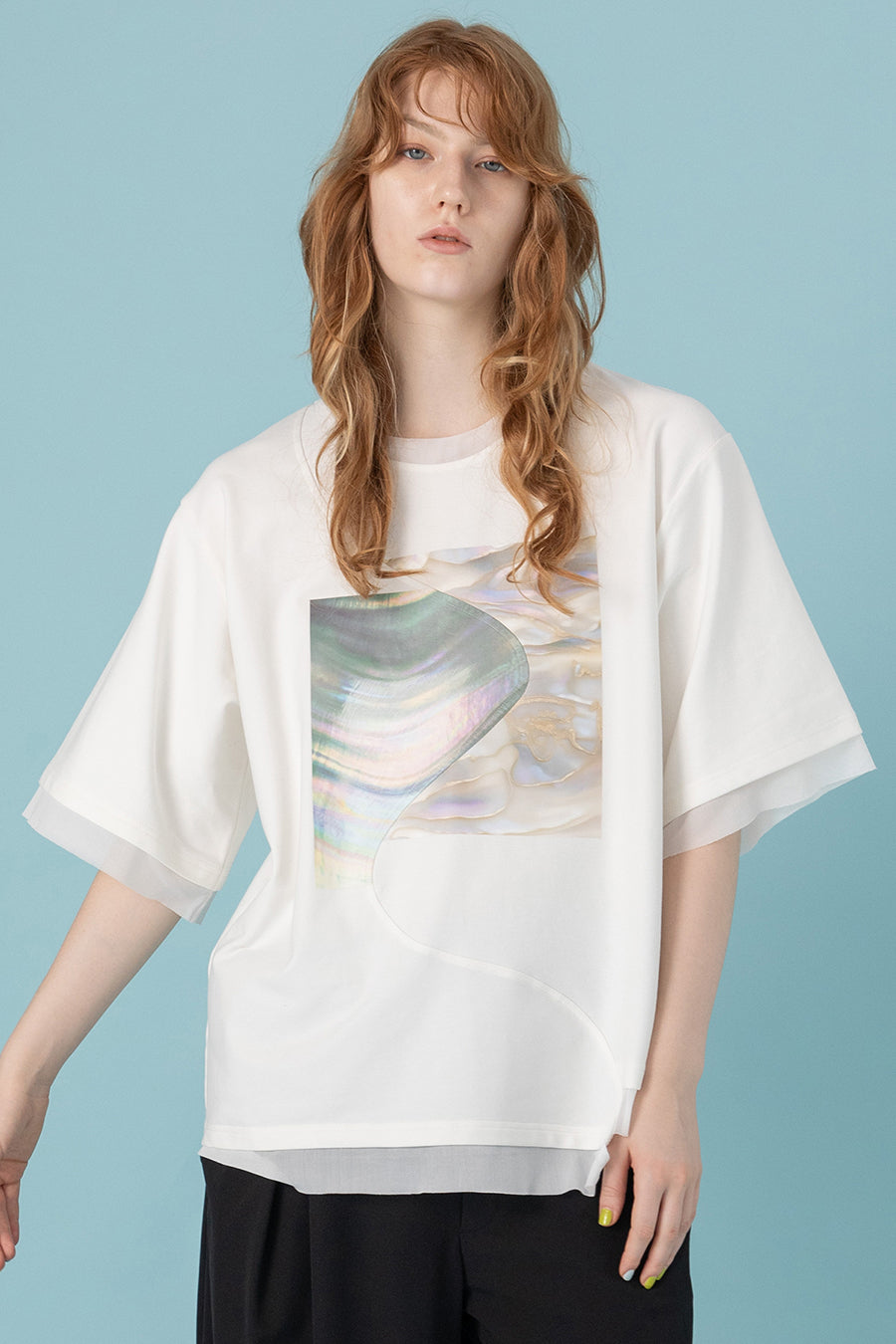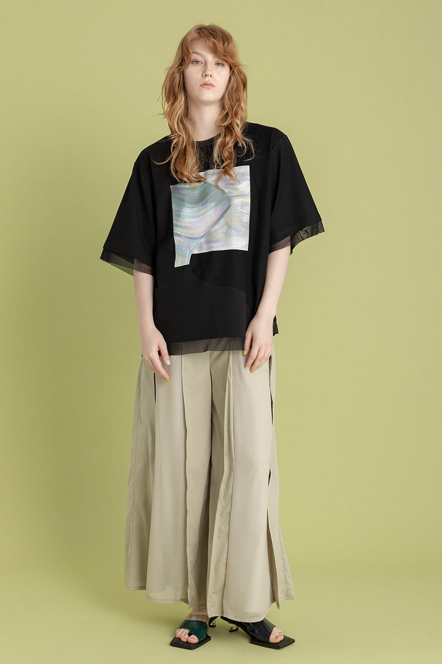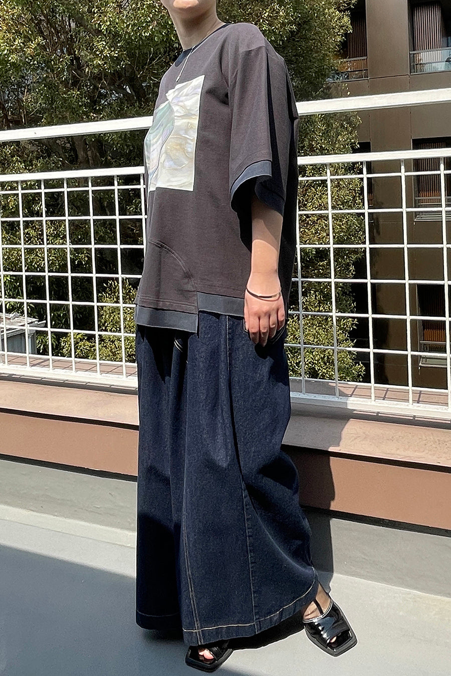 毎シーズン好評なプリントTは、今シーズンは2つのシェルプリントをコンビネーション。フロントは左右にカービーな切り替えを入れ、グラフィックもそれに合わせて、切り替えた仕上がりに。肌触り、伸縮性が良く、シワにもなりにくいストレッチ裏毛を採用。右と左で生地の裏表も切り替えて使用し、風合いに変化を出した1枚。オーバーサイズのゆるっとしたシルエットで、裾と太めの5分袖の袖口からはチュールが覗く涼しげなデザイン。
