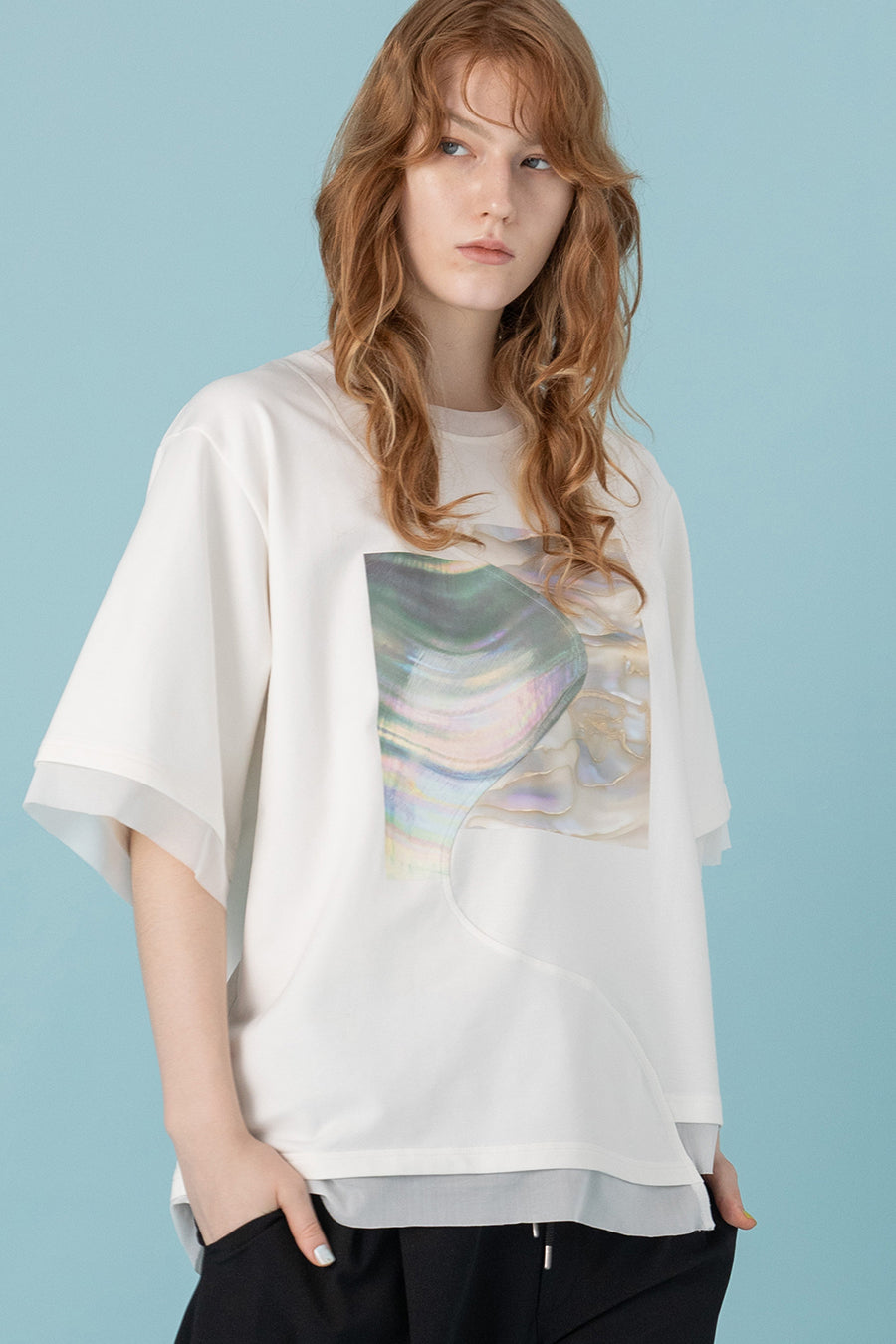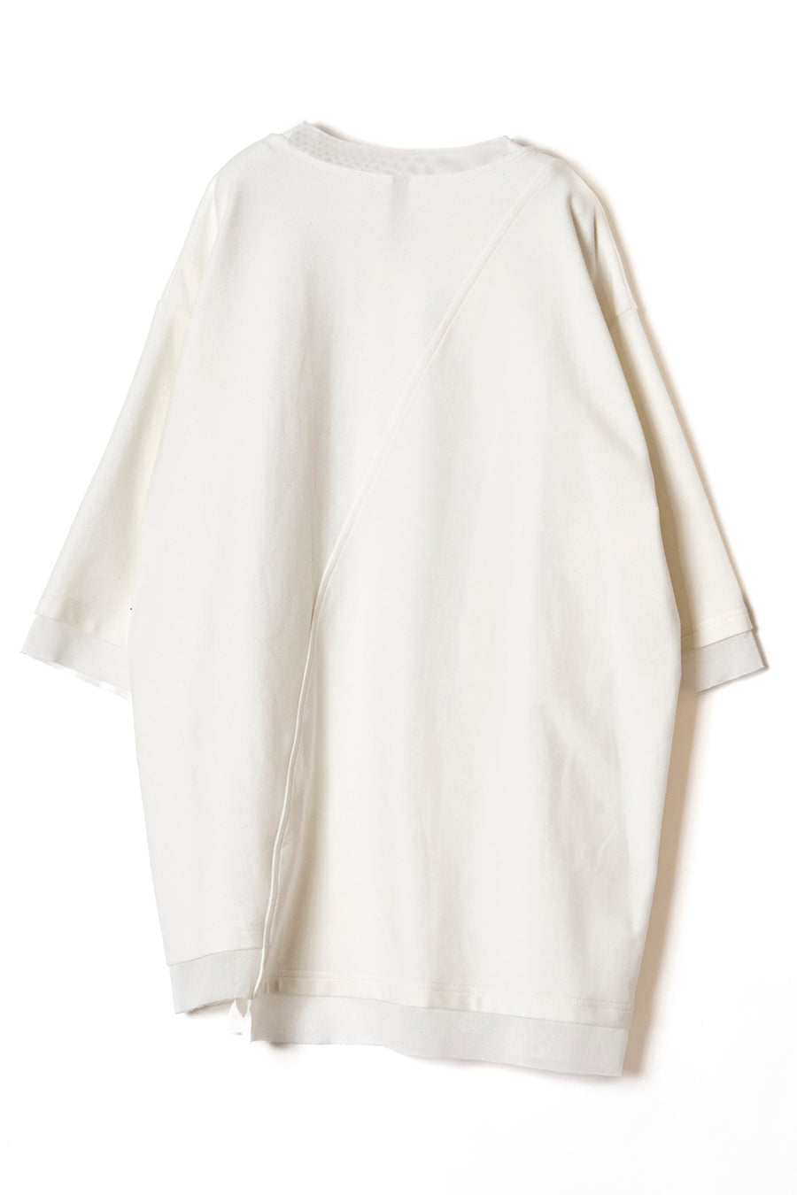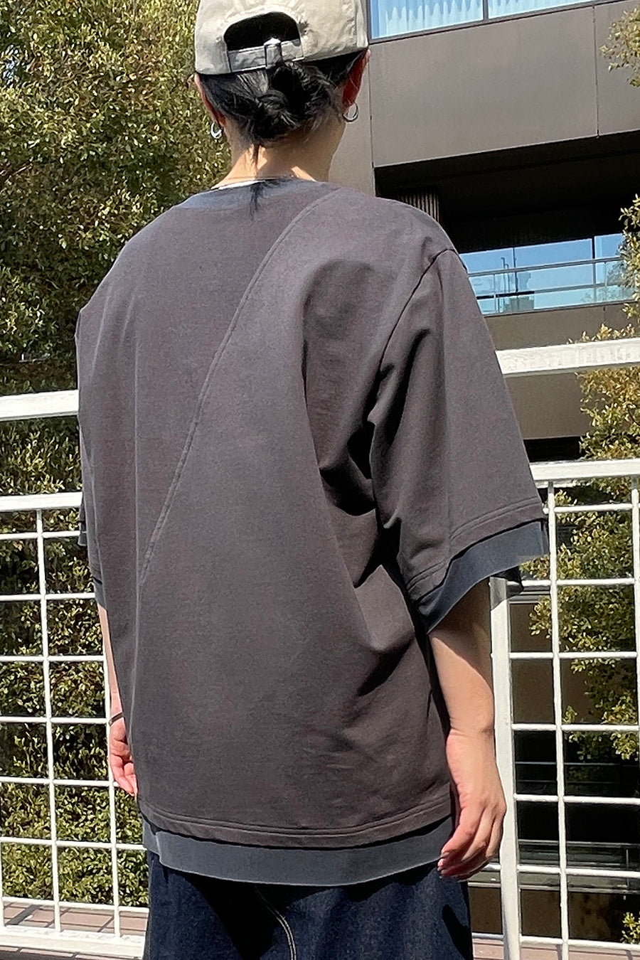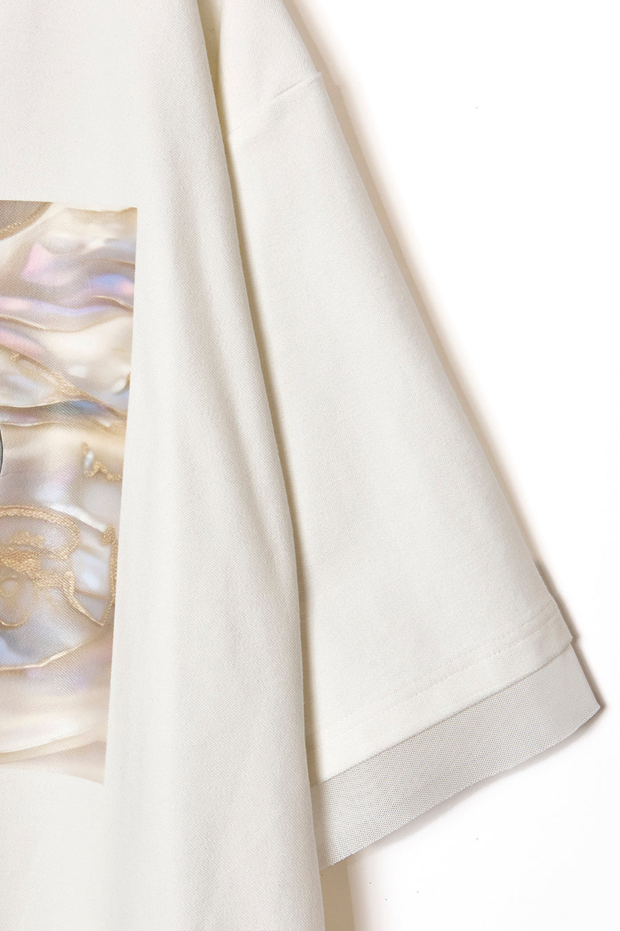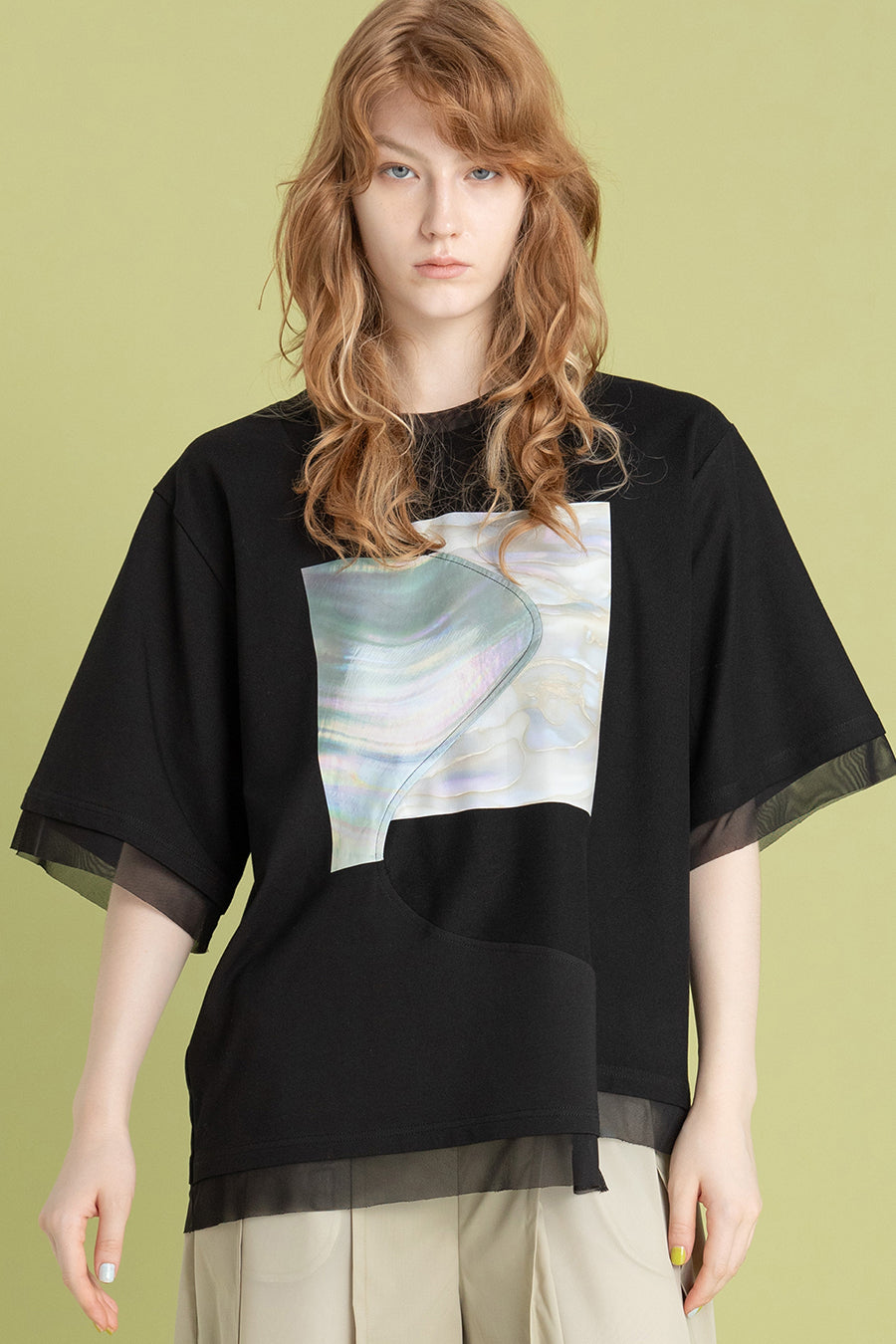 毎シーズン好評なプリントTは、今シーズンは2つのシェルプリントをコンビネーション。フロントは左右にカービーな切り替えを入れ、グラフィックもそれに合わせて、切り替えた仕上がりに。肌触り、伸縮性が良く、シワにもなりにくいストレッチ裏毛を採用。右と左で生地の裏表も切り替えて使用し、風合いに変化を出した1枚。オーバーサイズのゆるっとしたシルエットで、裾と太めの5分袖の袖口からはチュールが覗く涼しげなデザイン。