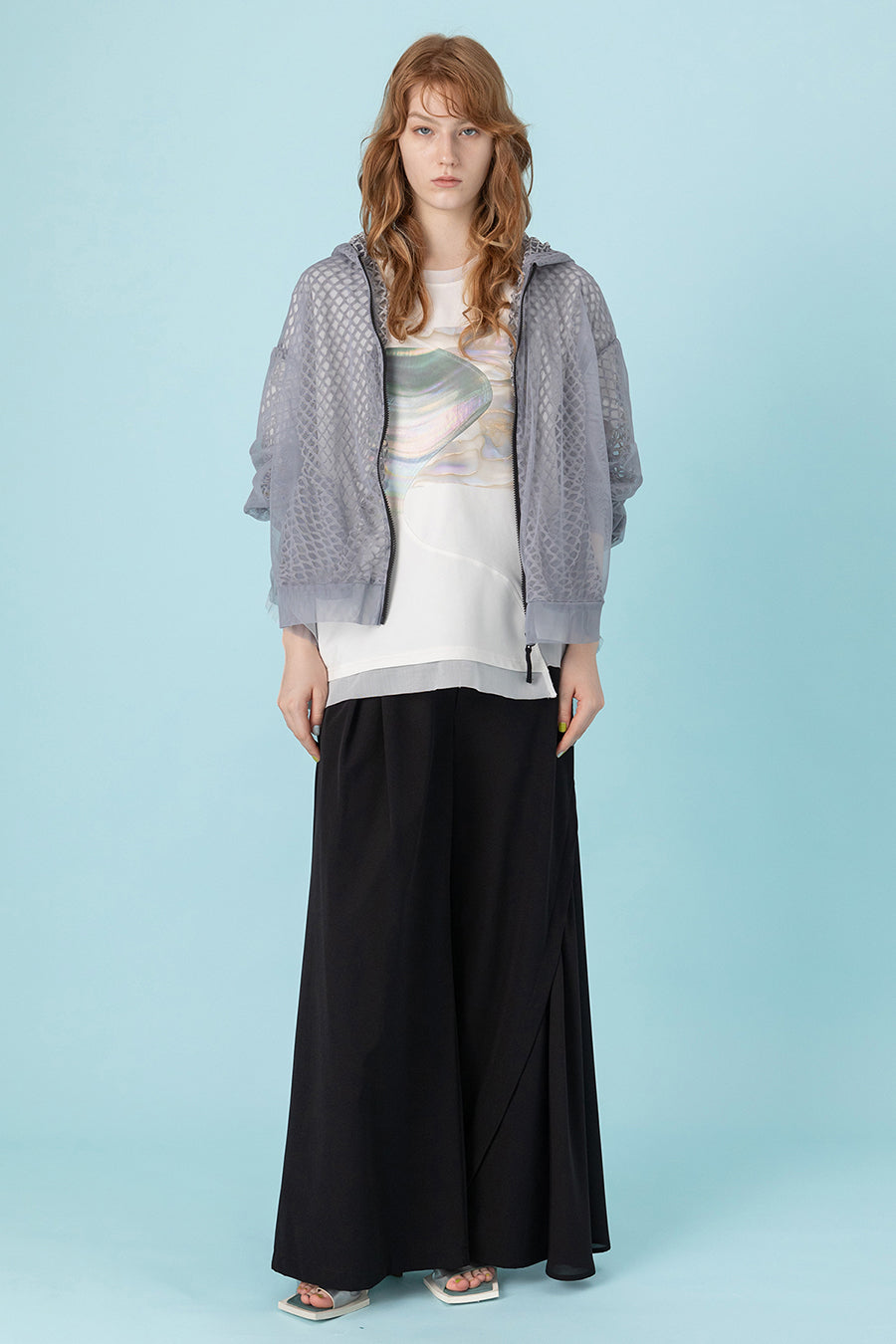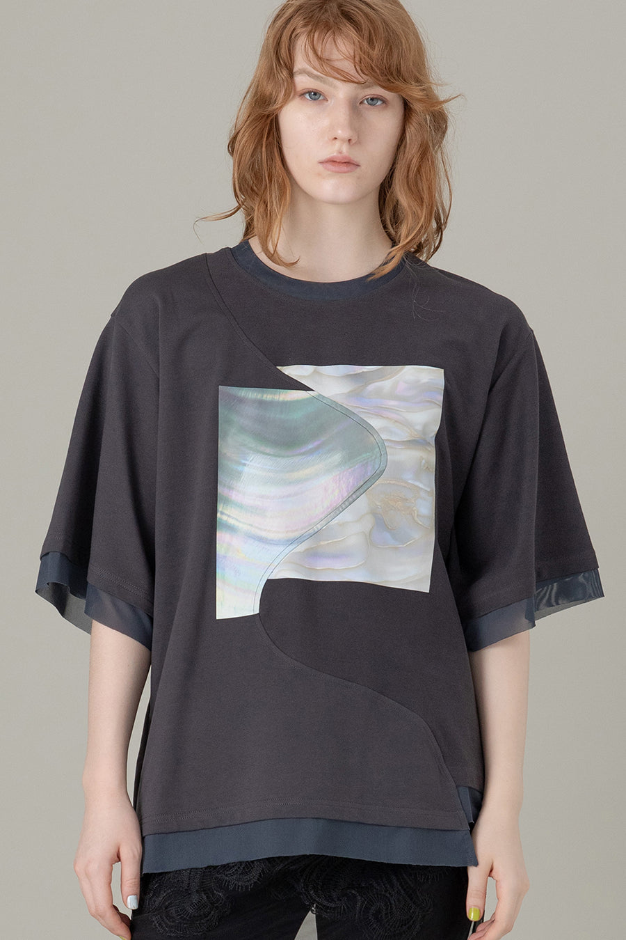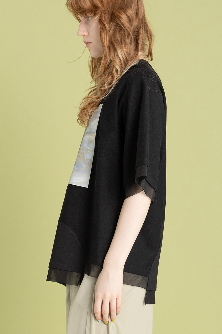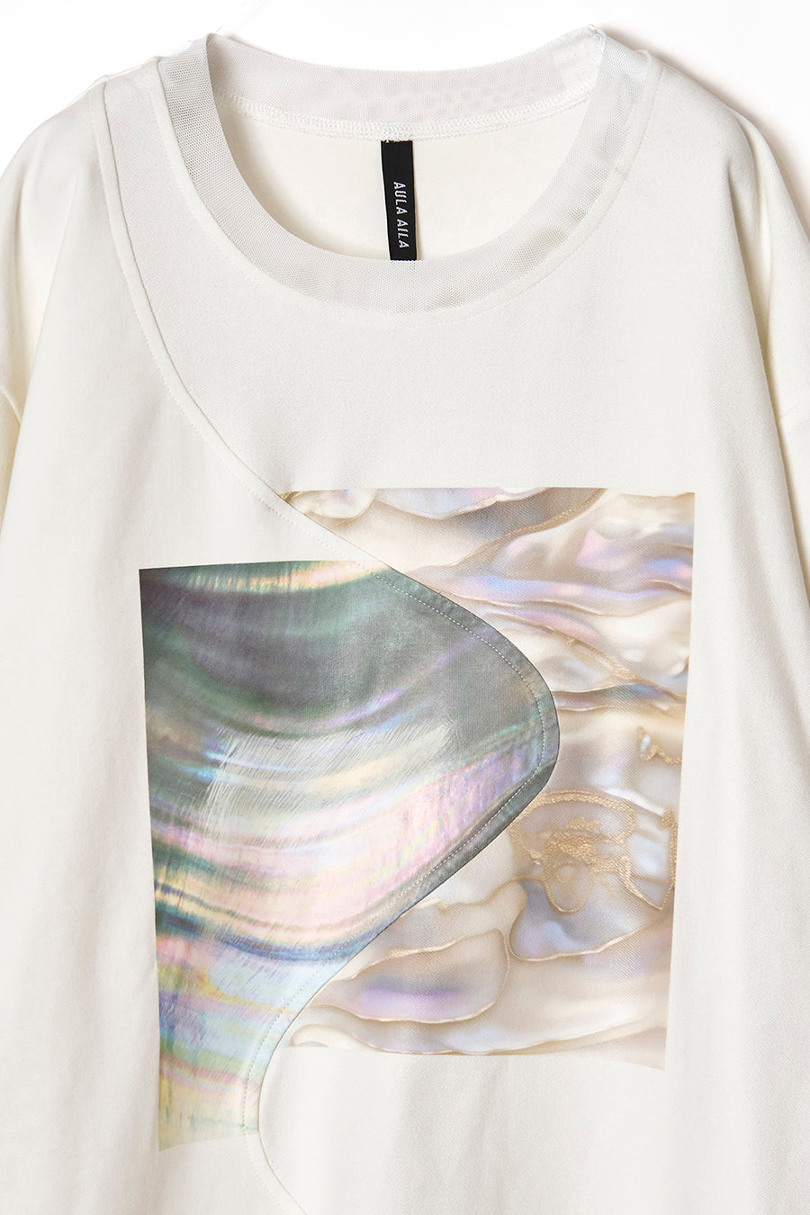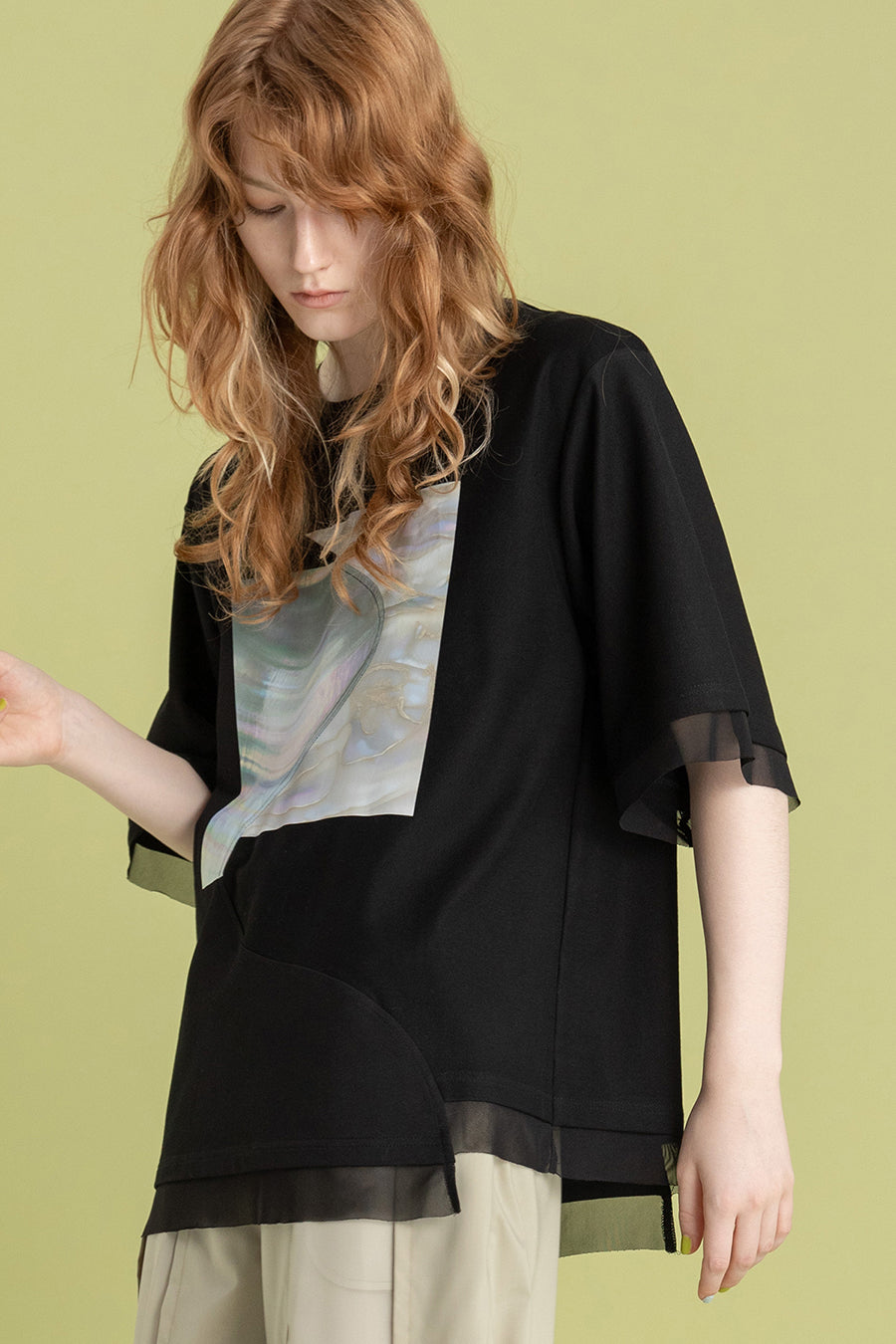 毎シーズン好評なプリントTは、今シーズンは2つのシェルプリントをコンビネーション。フロントは左右にカービーな切り替えを入れ、グラフィックもそれに合わせて、切り替えた仕上がりに。肌触り、伸縮性が良く、シワにもなりにくいストレッチ裏毛を採用。右と左で生地の裏表も切り替えて使用し、風合いに変化を出した1枚。オーバーサイズのゆるっとしたシルエットで、裾と太めの5分袖の袖口からはチュールが覗く涼しげなデザイン。