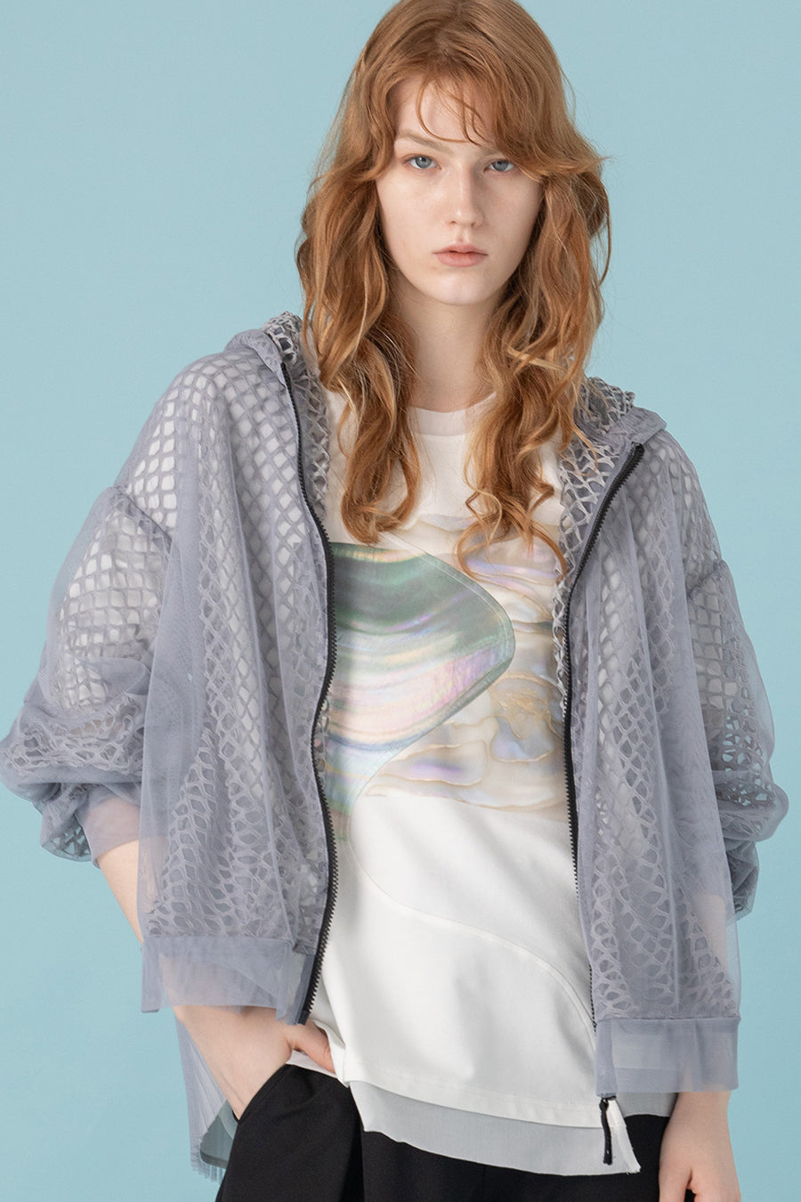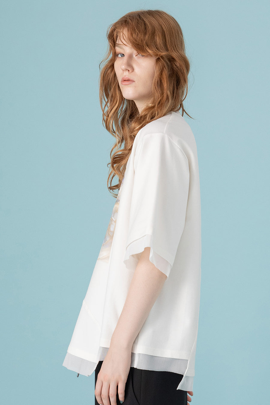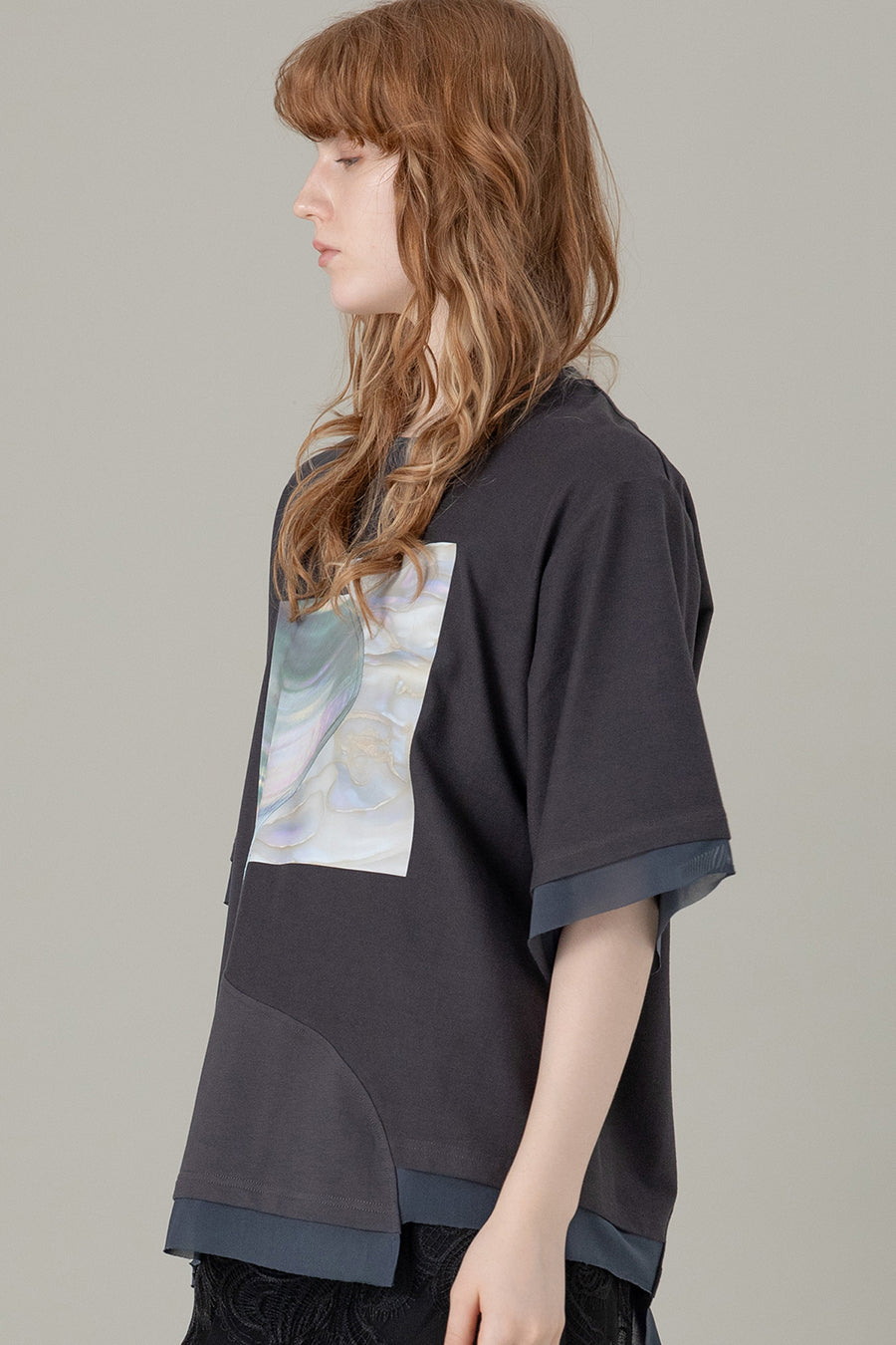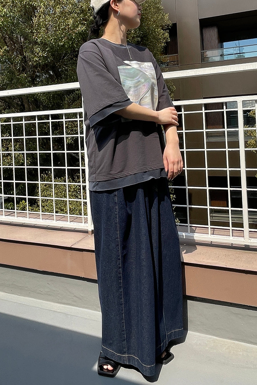 毎シーズン好評なプリントTは、今シーズンは2つのシェルプリントをコンビネーション。フロントは左右にカービーな切り替えを入れ、グラフィックもそれに合わせて、切り替えた仕上がりに。肌触り、伸縮性が良く、シワにもなりにくいストレッチ裏毛を採用。右と左で生地の裏表も切り替えて使用し、風合いに変化を出した1枚。オーバーサイズのゆるっとしたシルエットで、裾と太めの5分袖の袖口からはチュールが覗く涼しげなデザイン。
