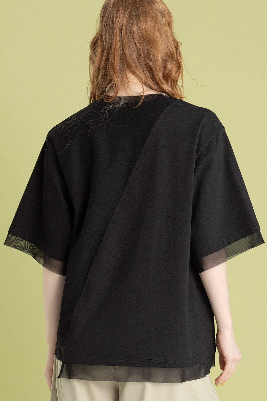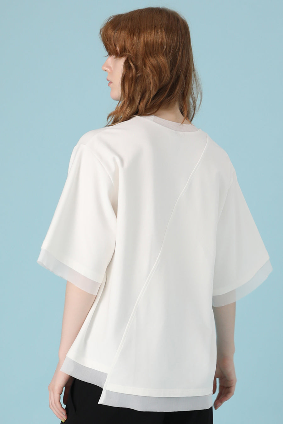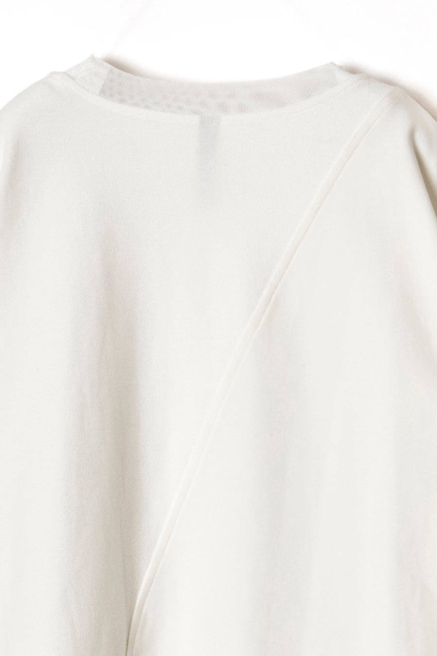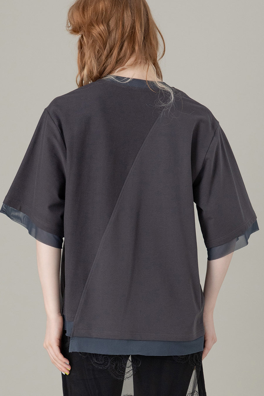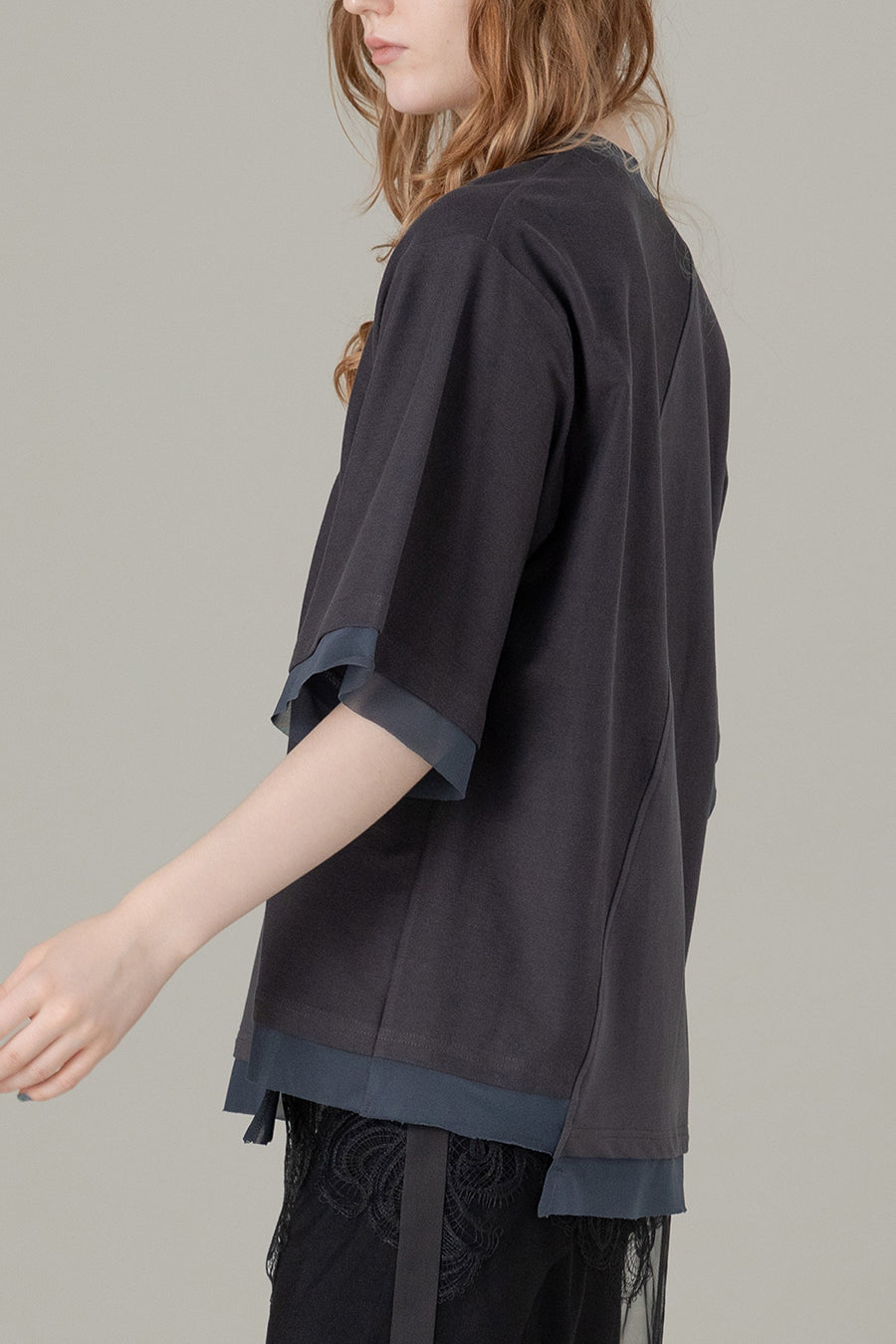 毎シーズン好評なプリントTは、今シーズンは2つのシェルプリントをコンビネーション。フロントは左右にカービーな切り替えを入れ、グラフィックもそれに合わせて、切り替えた仕上がりに。肌触り、伸縮性が良く、シワにもなりにくいストレッチ裏毛を採用。右と左で生地の裏表も切り替えて使用し、風合いに変化を出した1枚。オーバーサイズのゆるっとしたシルエットで、裾と太めの5分袖の袖口からはチュールが覗く涼しげなデザイン。