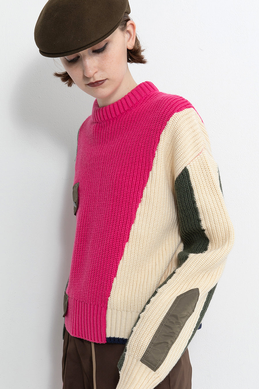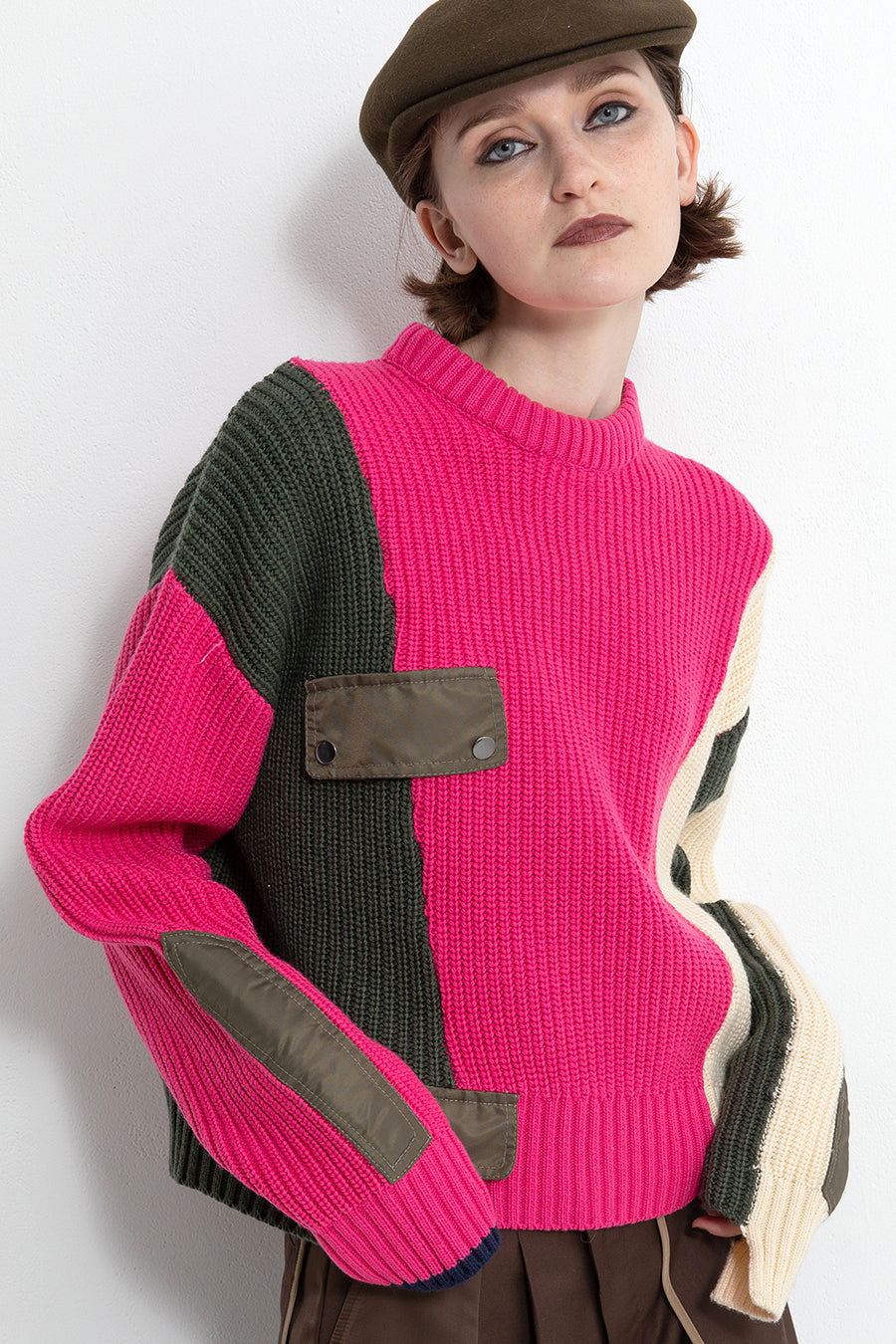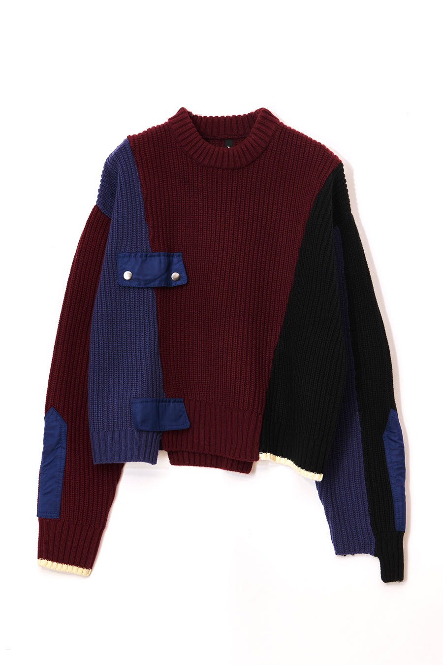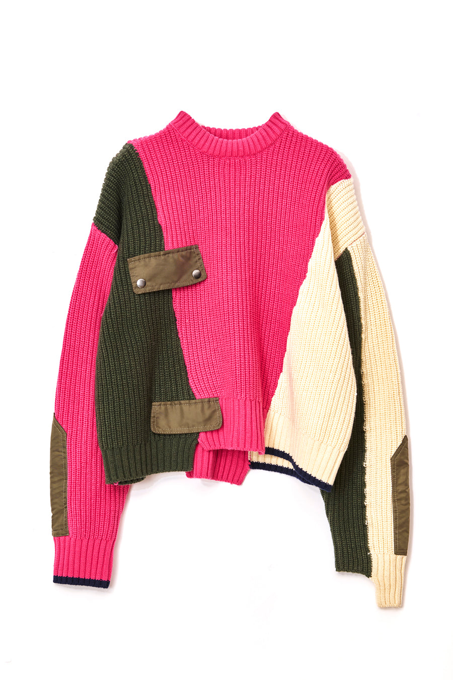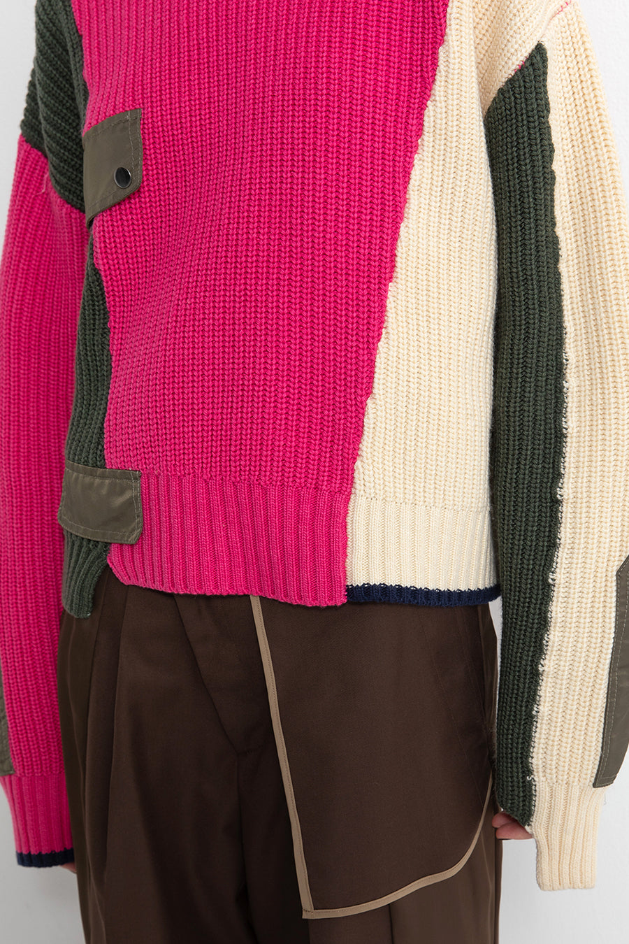 飾りフラップ付きのカラーブロックニット。昨年も人気だったナイロンツイルのポケット付きショート丈ローゲージニットは、今年は3色のアシンメトリーカラーブロックにアップデート。身頃左下と右袖口のラインがアクセントになり、アーミーテイストのデザインとのミックスが他にはないアイテム。ラムウール混の片畦編みで、型崩れしにくいのも嬉しい。オーバーサイズだが着丈が短めなので、ワイドパンツなどにも合わせやすく、緩めのバランスがトレンド◎