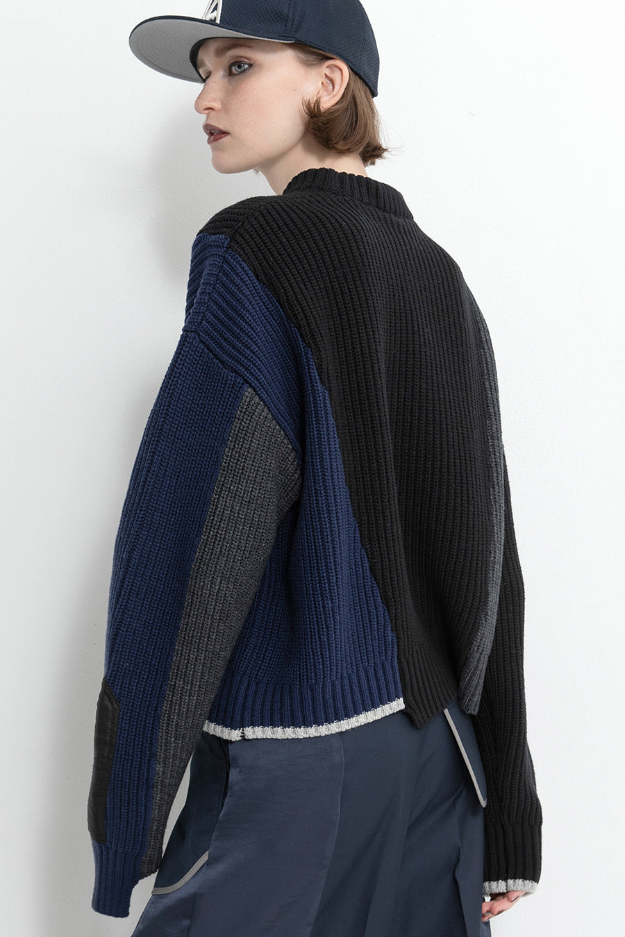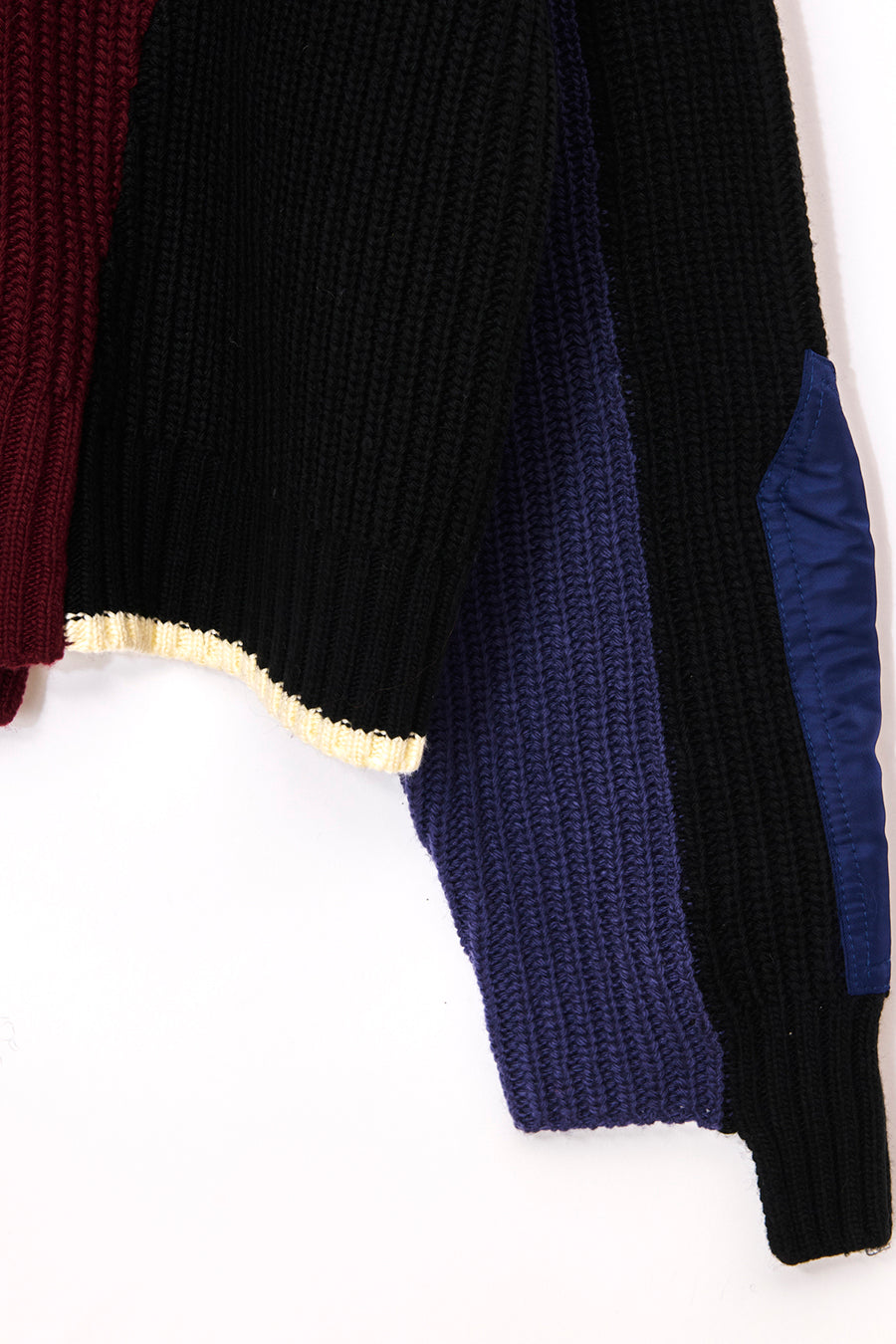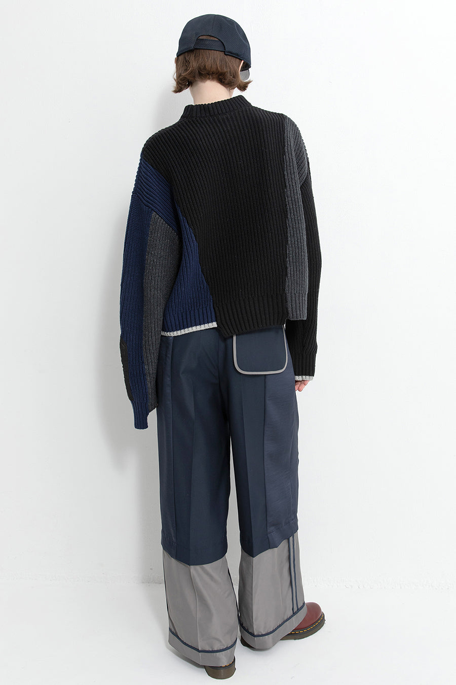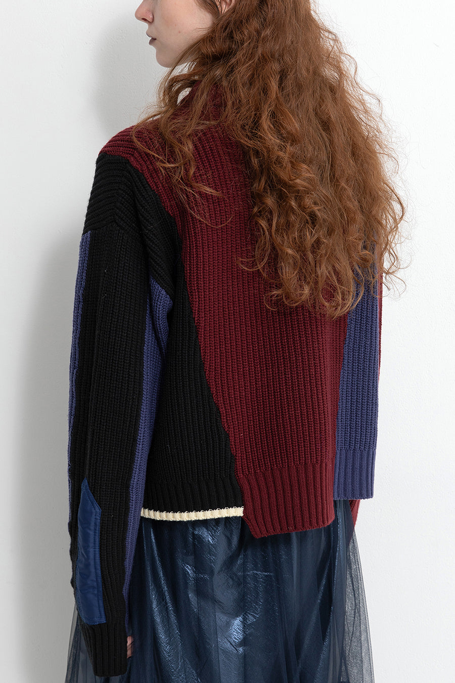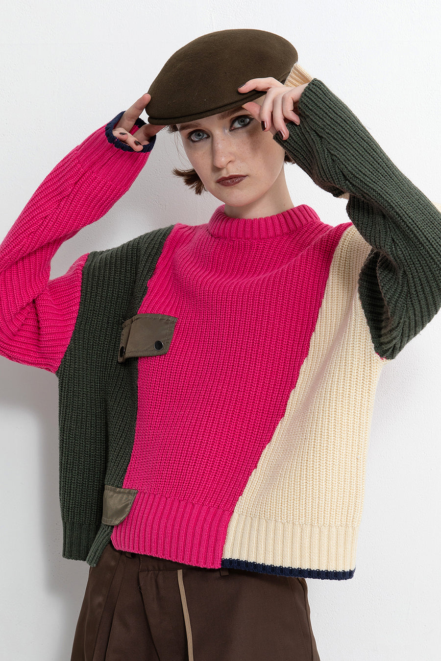 飾りフラップ付きのカラーブロックニット。昨年も人気だったナイロンツイルのポケット付きショート丈ローゲージニットは、今年は3色のアシンメトリーカラーブロックにアップデート。身頃左下と右袖口のラインがアクセントになり、アーミーテイストのデザインとのミックスが他にはないアイテム。ラムウール混の片畦編みで、型崩れしにくいのも嬉しい。オーバーサイズだが着丈が短めなので、ワイドパンツなどにも合わせやすく、緩めのバランスがトレンド◎