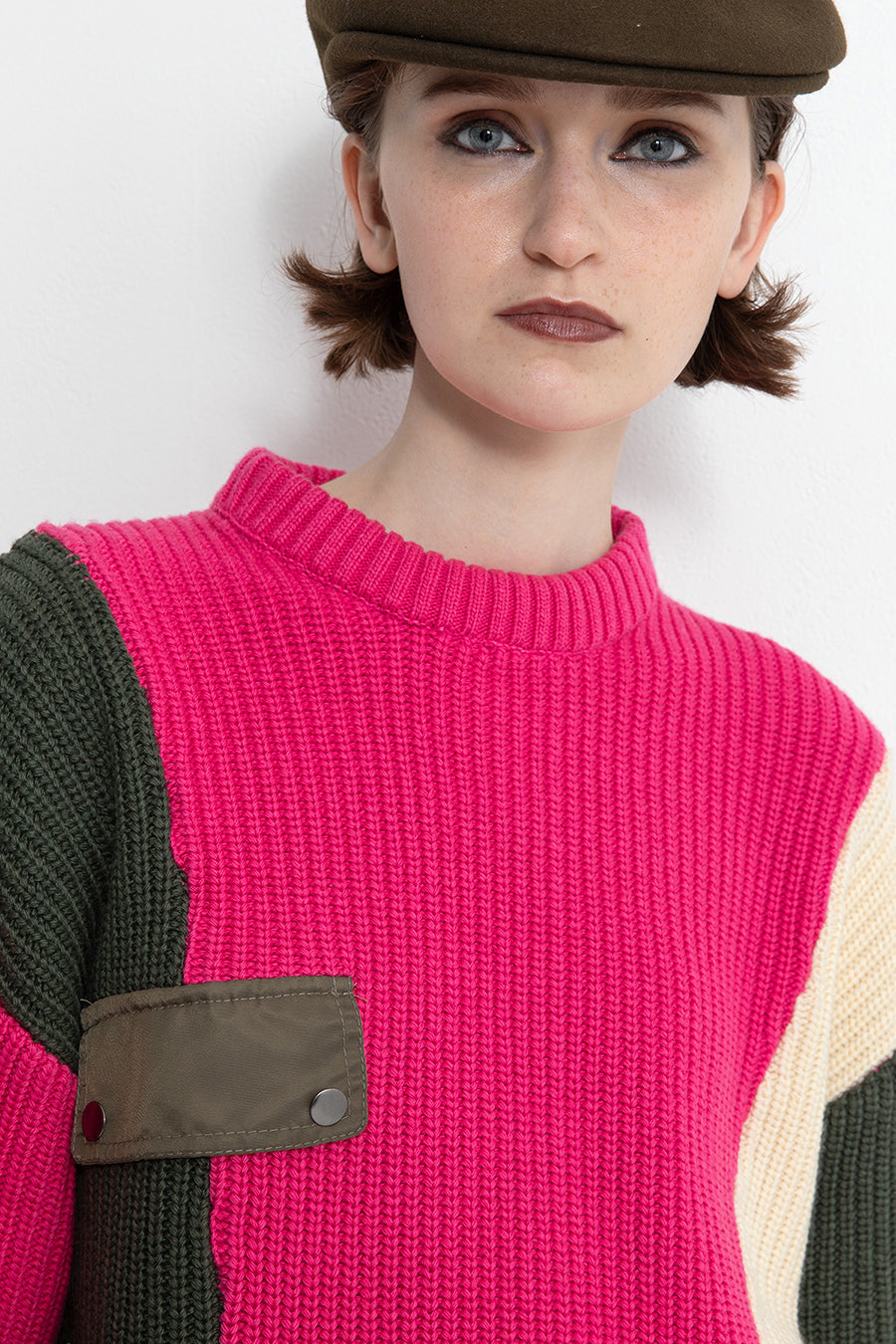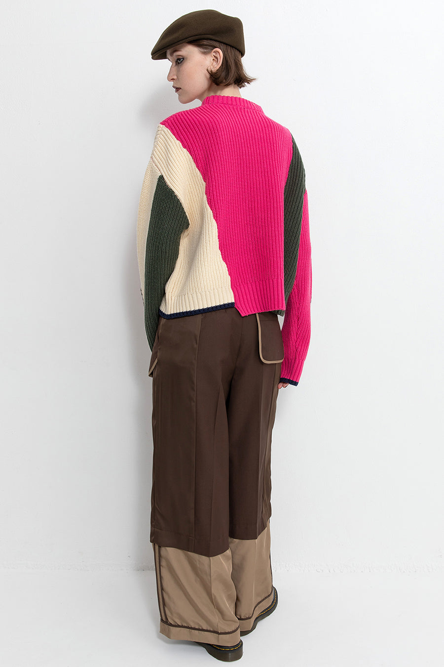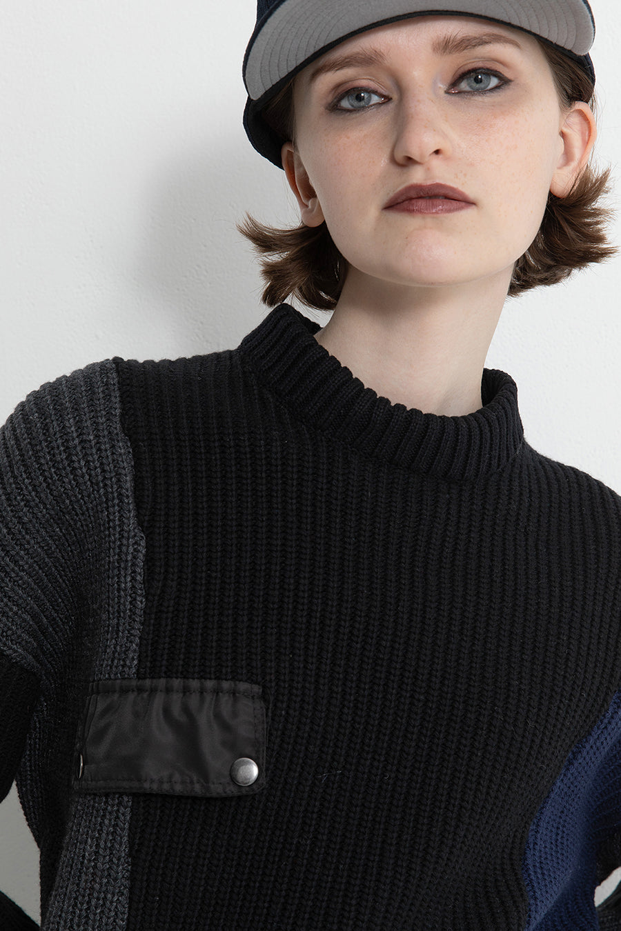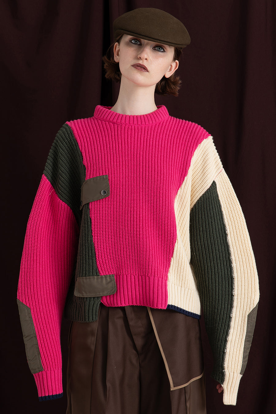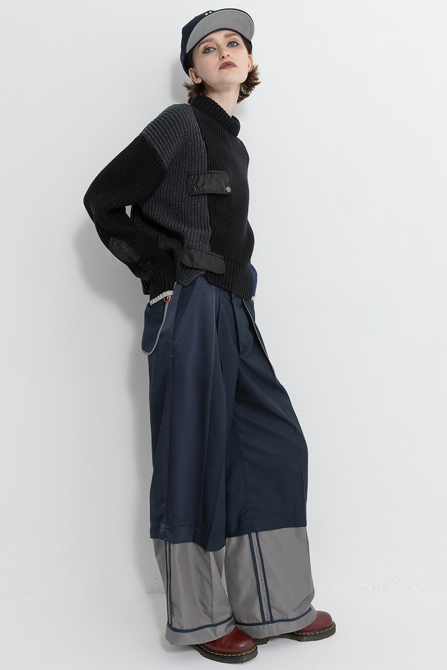 飾りフラップ付きのカラーブロックニット。昨年も人気だったナイロンツイルのポケット付きショート丈ローゲージニットは、今年は3色のアシンメトリーカラーブロックにアップデート。身頃左下と右袖口のラインがアクセントになり、アーミーテイストのデザインとのミックスが他にはないアイテム。ラムウール混の片畦編みで、型崩れしにくいのも嬉しい。オーバーサイズだが着丈が短めなので、ワイドパンツなどにも合わせやすく、緩めのバランスがトレンド◎