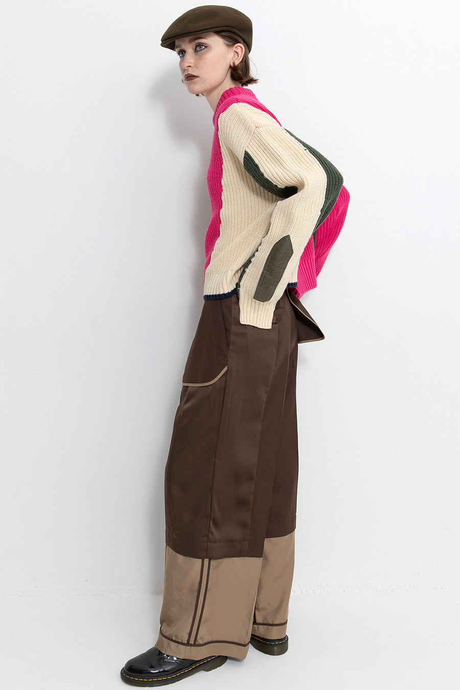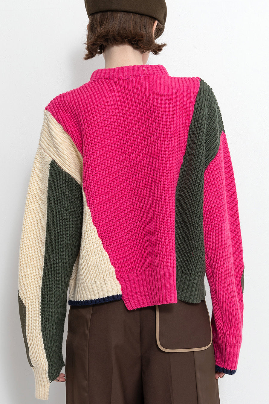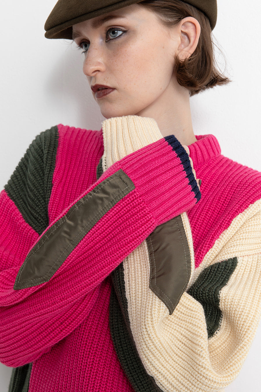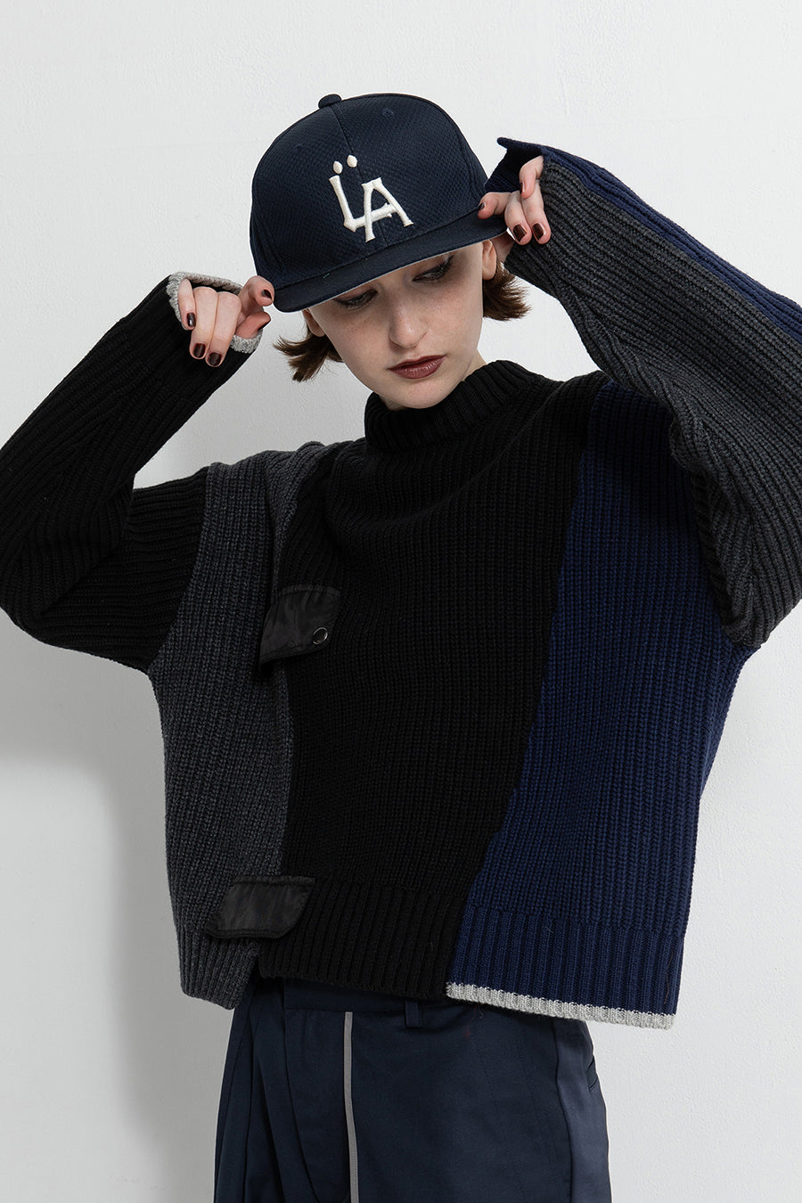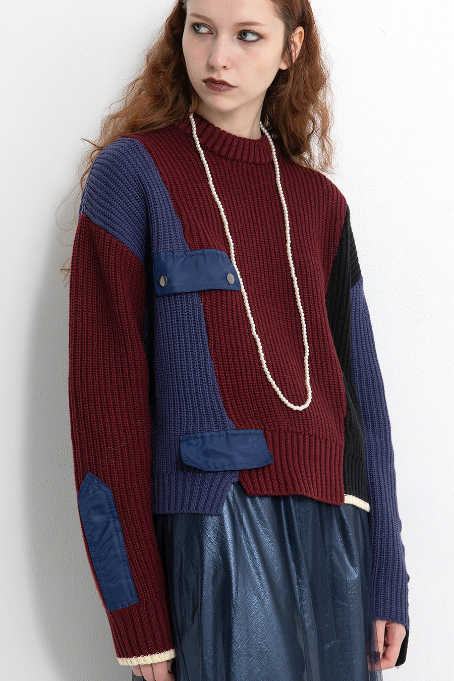飾りフラップ付きのカラーブロックニット。昨年も人気だったナイロンツイルのポケット付きショート丈ローゲージニットは、今年は3色のアシンメトリーカラーブロックにアップデート。身頃左下と右袖口のラインがアクセントになり、アーミーテイストのデザインとのミックスが他にはないアイテム。ラムウール混の片畦編みで、型崩れしにくいのも嬉しい。オーバーサイズだが着丈が短めなので、ワイドパンツなどにも合わせやすく、緩めのバランスがトレンド◎