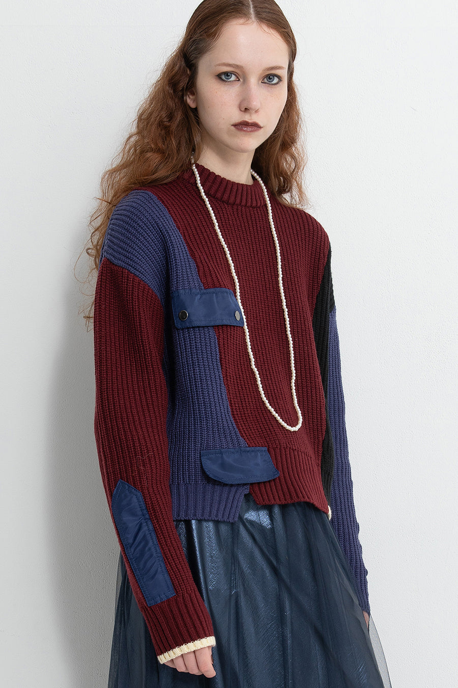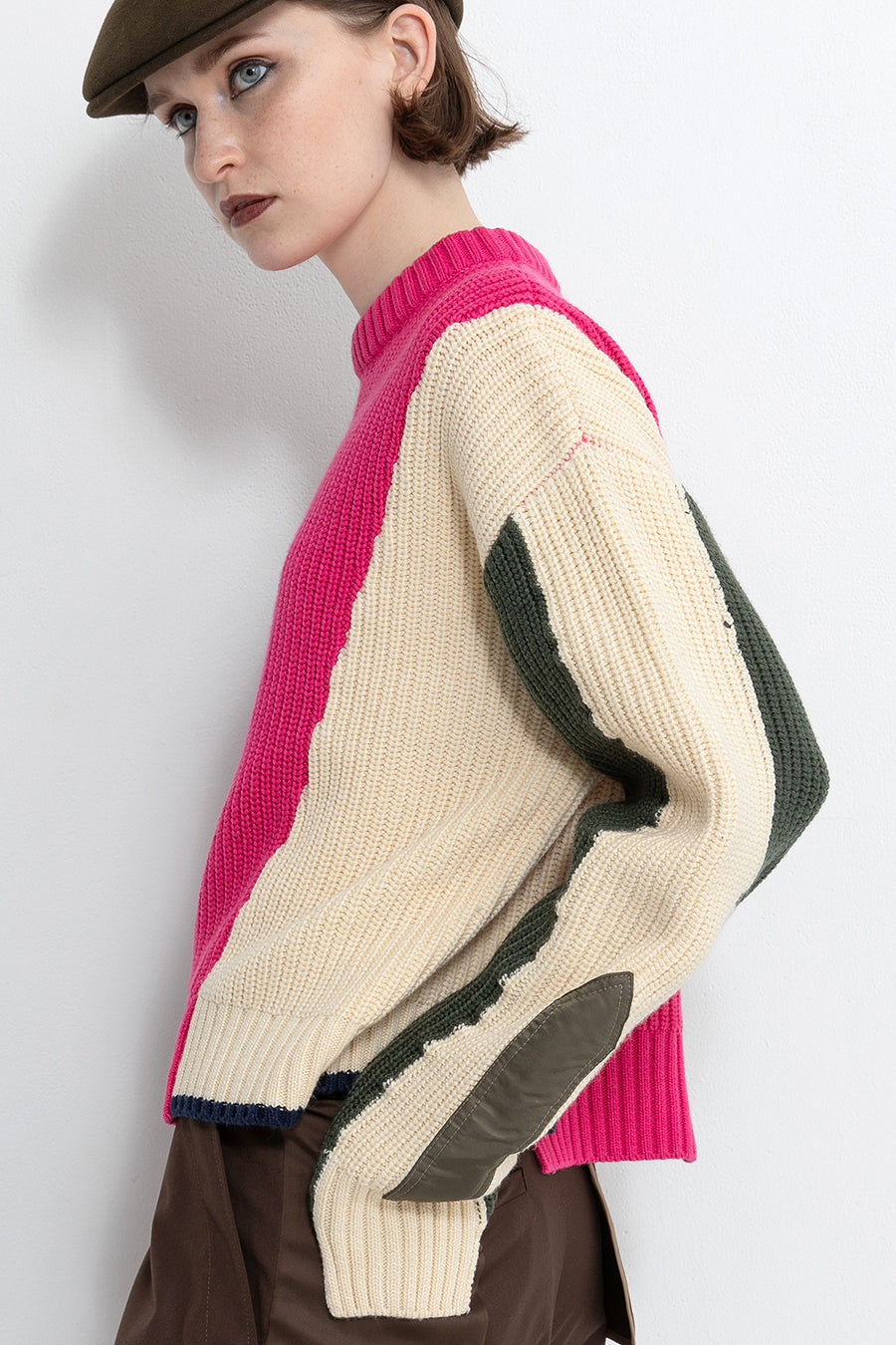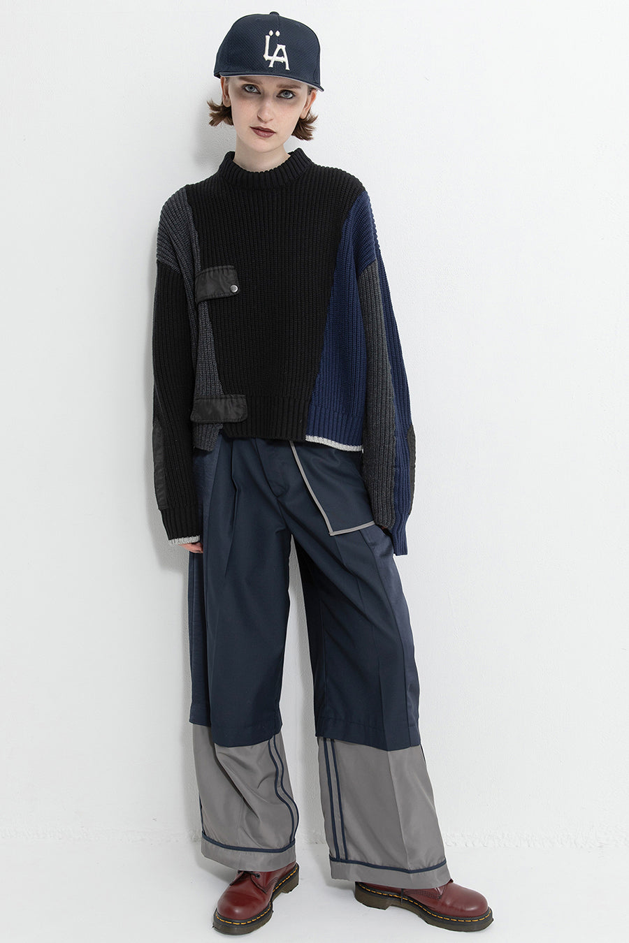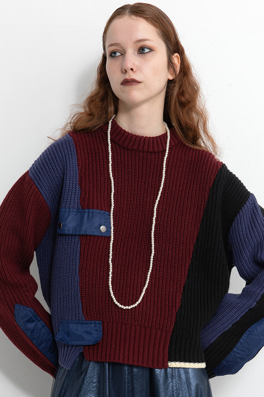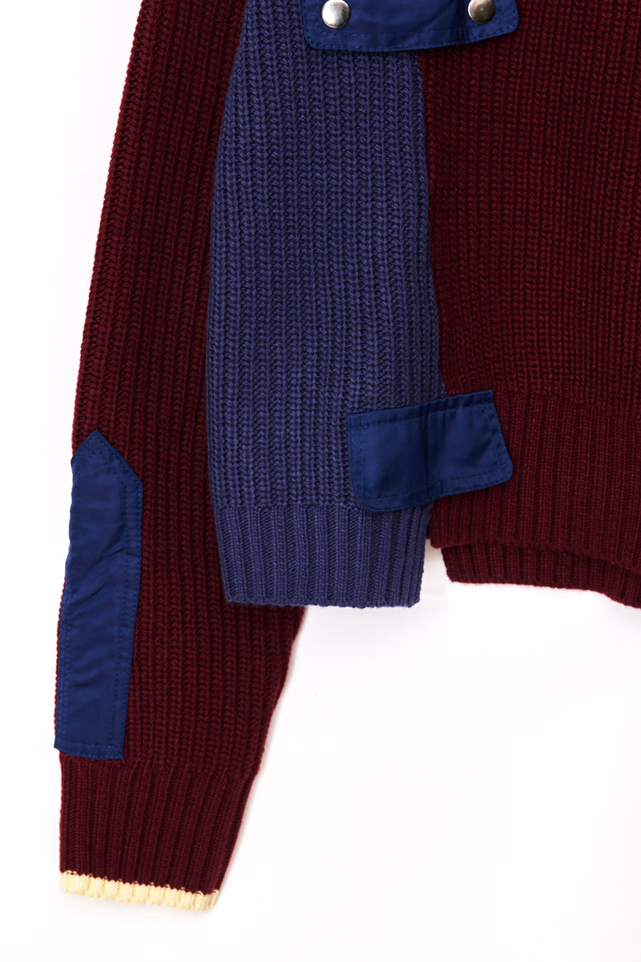 飾りフラップ付きのカラーブロックニット。昨年も人気だったナイロンツイルのポケット付きショート丈ローゲージニットは、今年は3色のアシンメトリーカラーブロックにアップデート。身頃左下と右袖口のラインがアクセントになり、アーミーテイストのデザインとのミックスが他にはないアイテム。ラムウール混の片畦編みで、型崩れしにくいのも嬉しい。オーバーサイズだが着丈が短めなので、ワイドパンツなどにも合わせやすく、緩めのバランスがトレンド◎