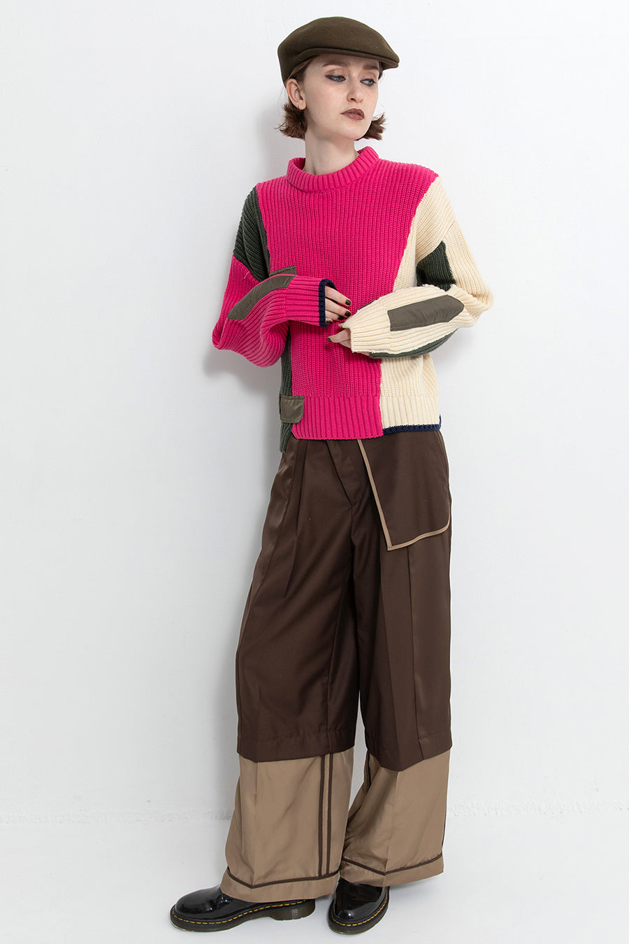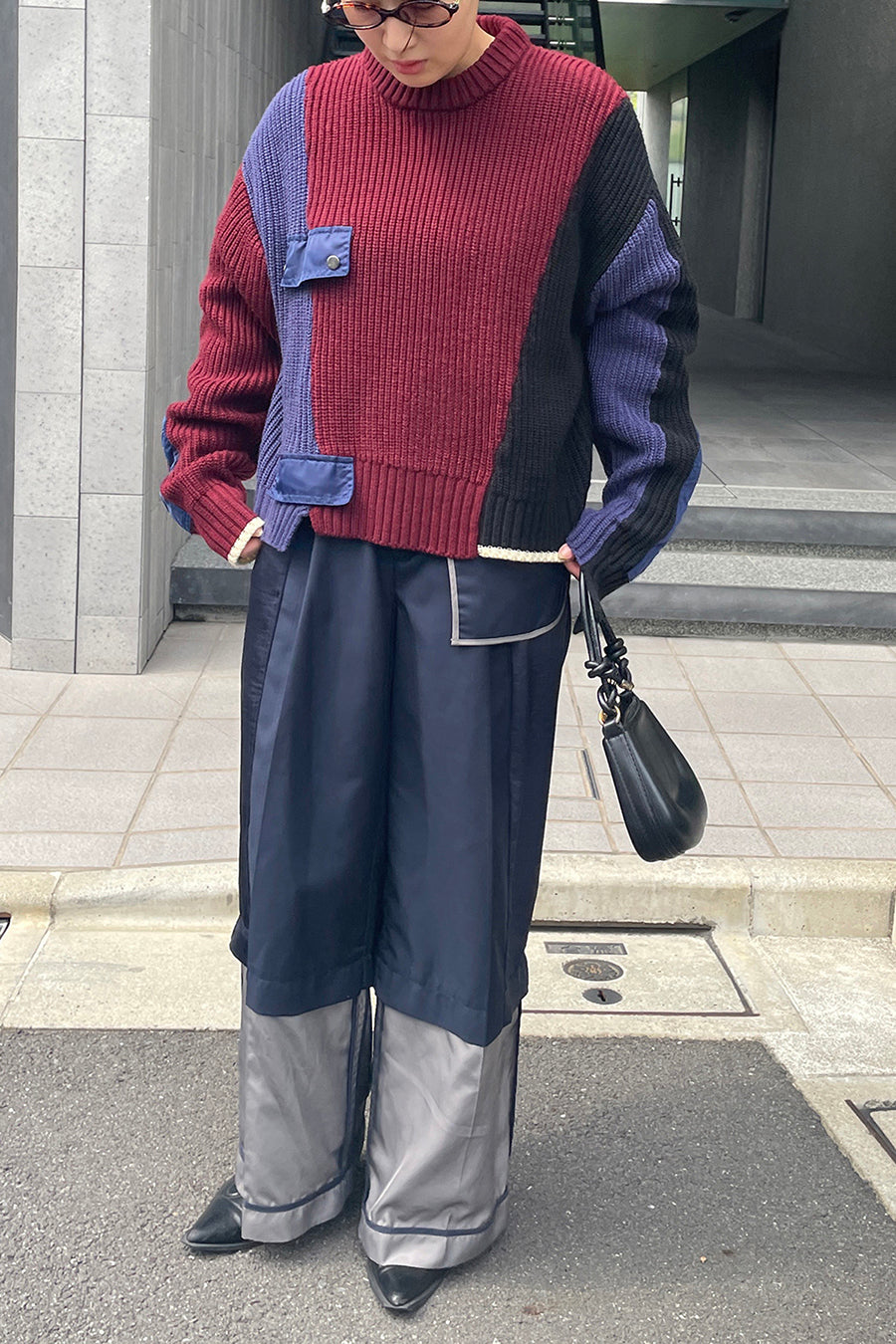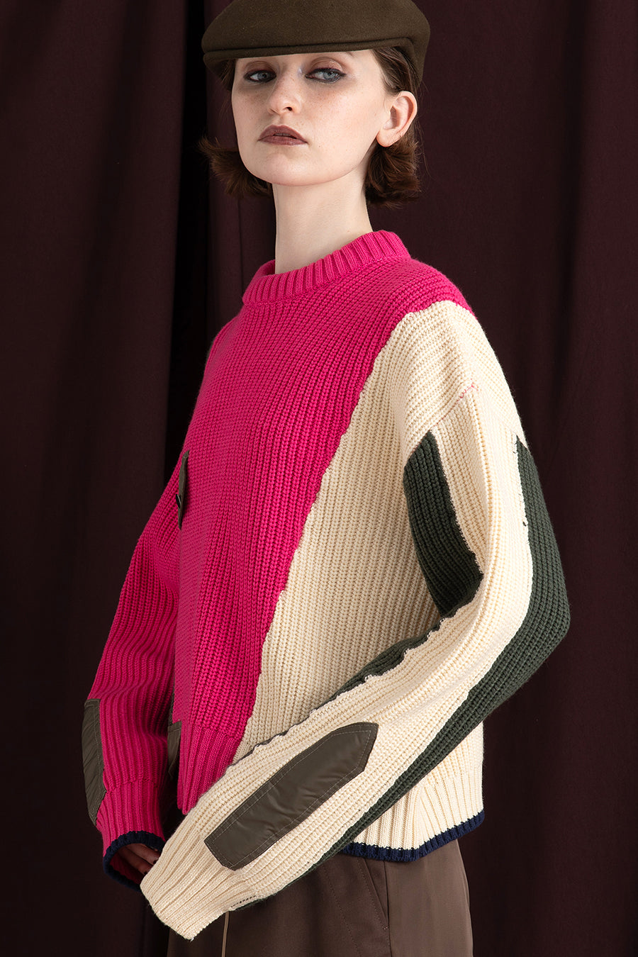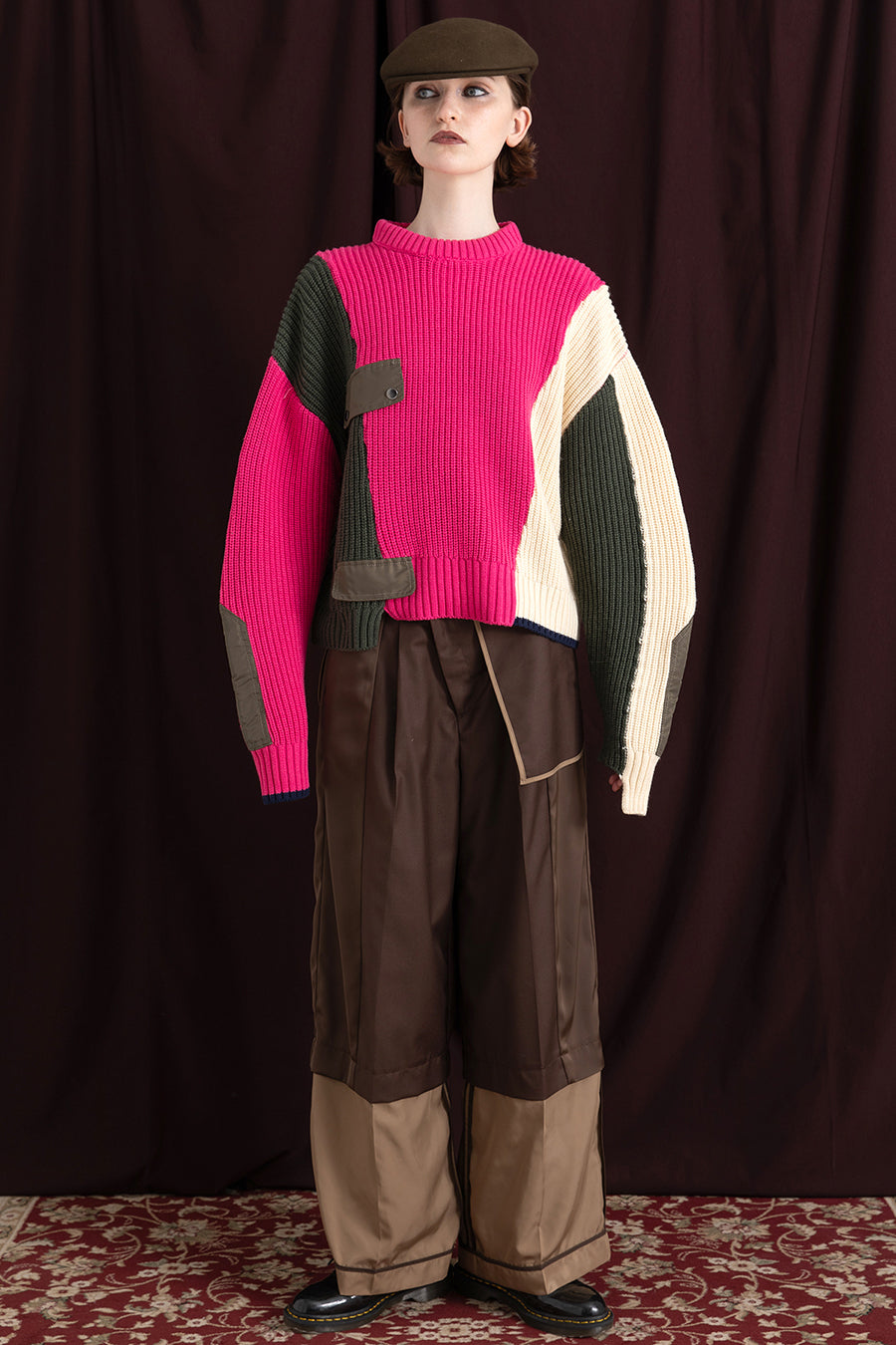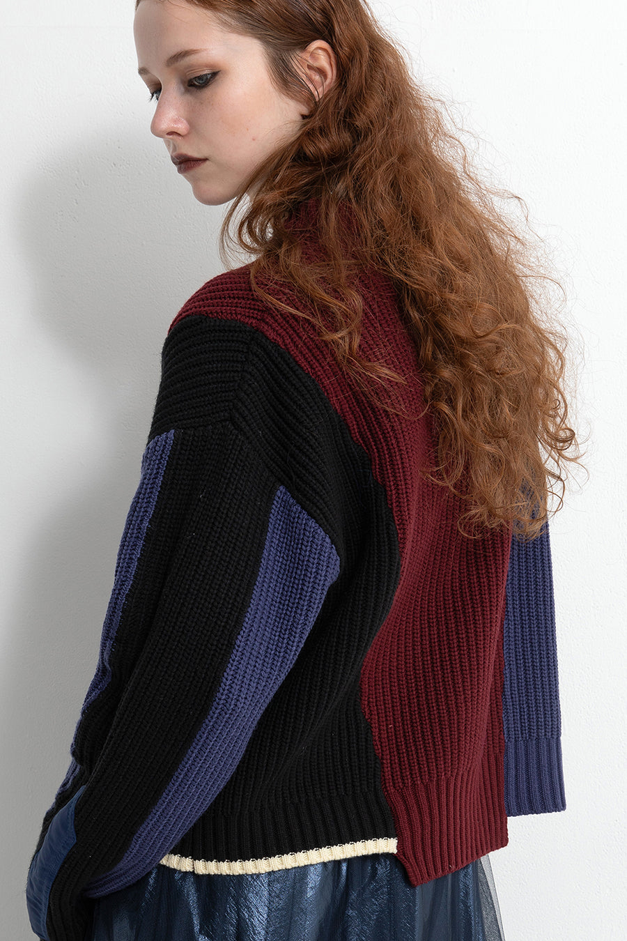 飾りフラップ付きのカラーブロックニット。昨年も人気だったナイロンツイルのポケット付きショート丈ローゲージニットは、今年は3色のアシンメトリーカラーブロックにアップデート。身頃左下と右袖口のラインがアクセントになり、アーミーテイストのデザインとのミックスが他にはないアイテム。ラムウール混の片畦編みで、型崩れしにくいのも嬉しい。オーバーサイズだが着丈が短めなので、ワイドパンツなどにも合わせやすく、緩めのバランスがトレンド◎
