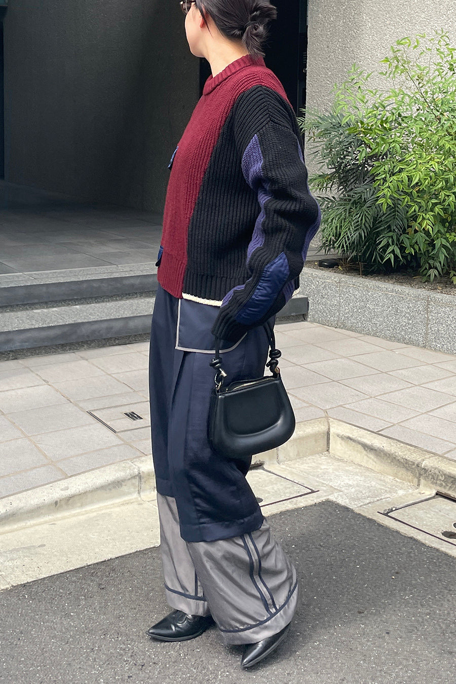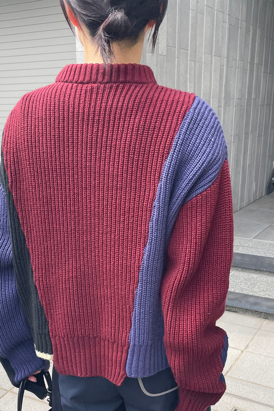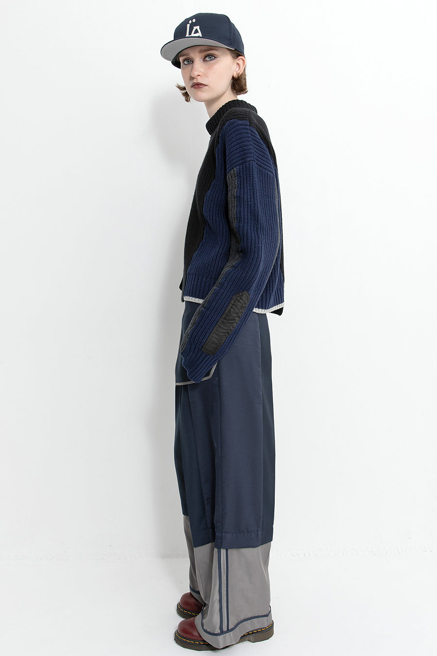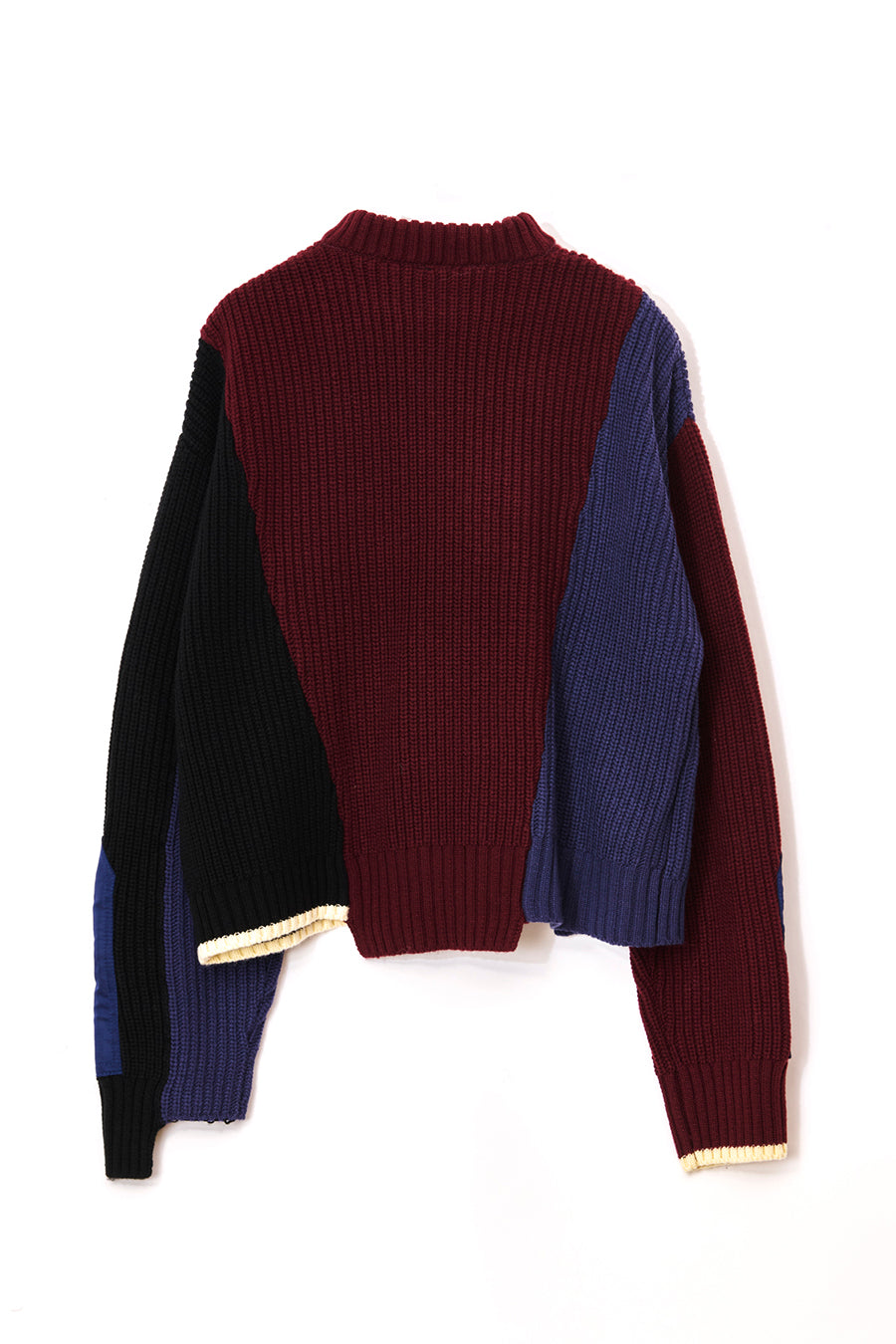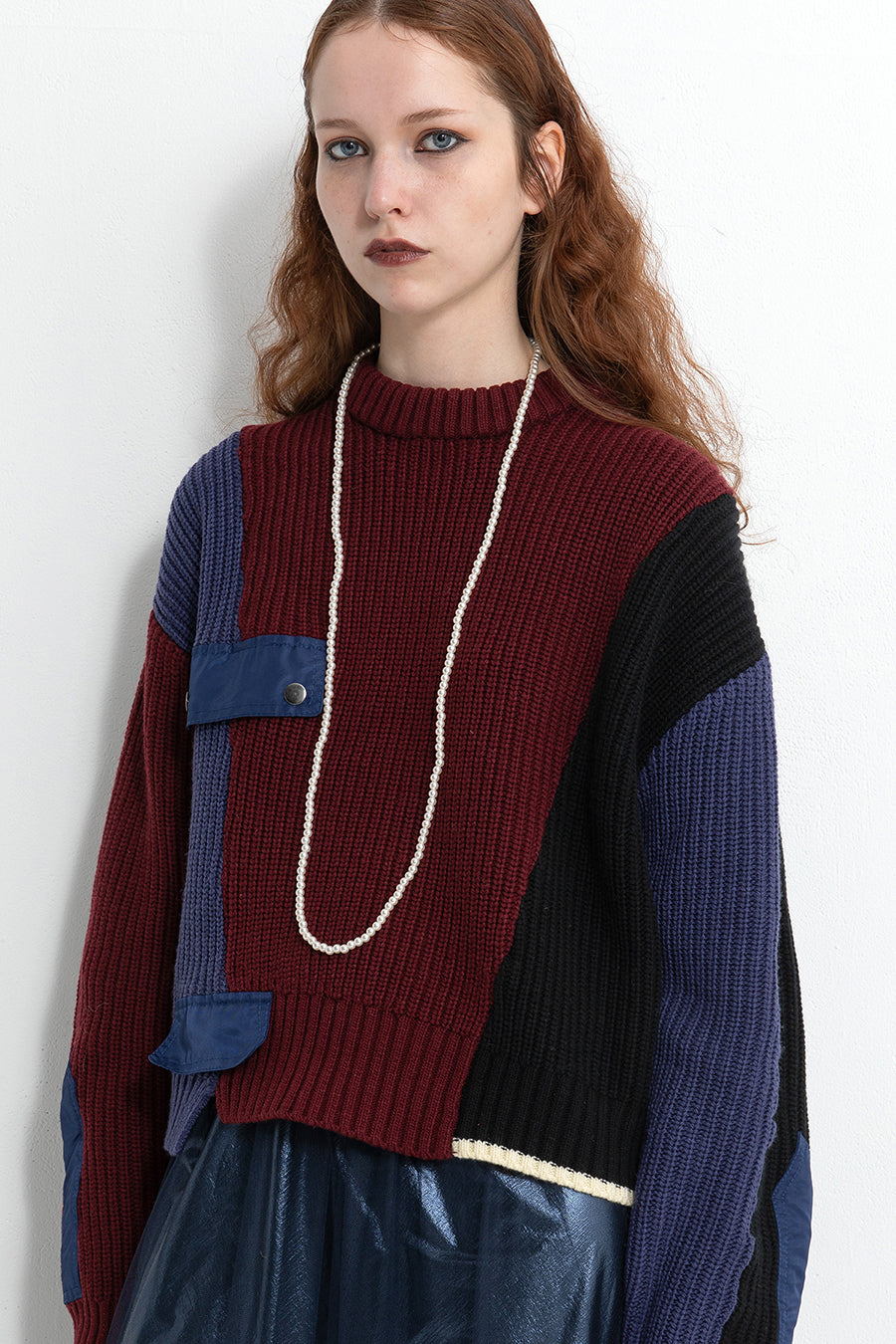飾りフラップ付きのカラーブロックニット。昨年も人気だったナイロンツイルのポケット付きショート丈ローゲージニットは、今年は3色のアシンメトリーカラーブロックにアップデート。身頃左下と右袖口のラインがアクセントになり、アーミーテイストのデザインとのミックスが他にはないアイテム。ラムウール混の片畦編みで、型崩れしにくいのも嬉しい。オーバーサイズだが着丈が短めなので、ワイドパンツなどにも合わせやすく、緩めのバランスがトレンド◎