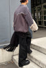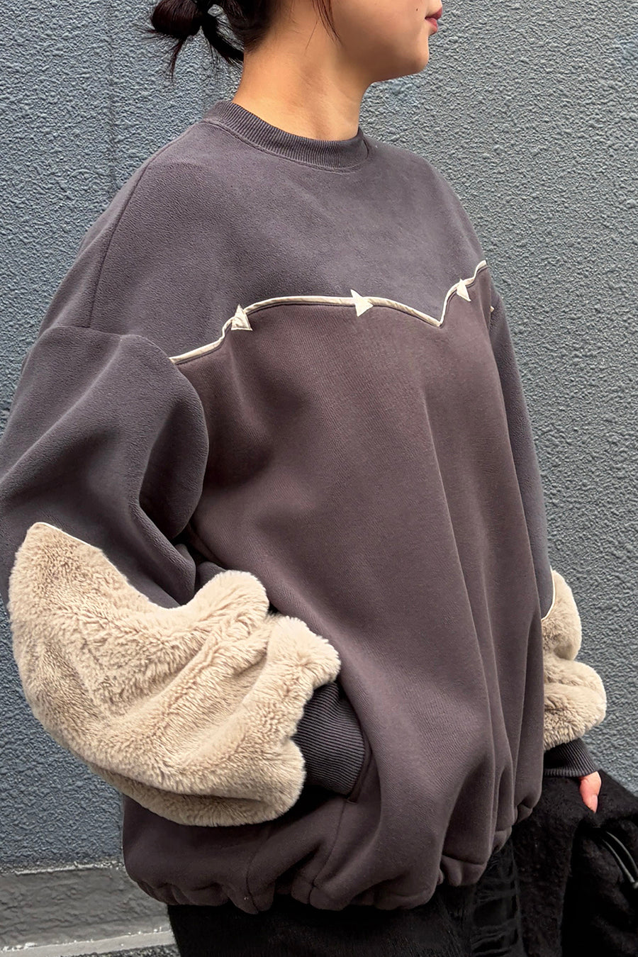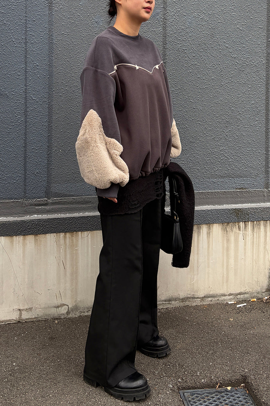 袖はマットなファーで切り替え。裾にはドローコード付きでシルエットに